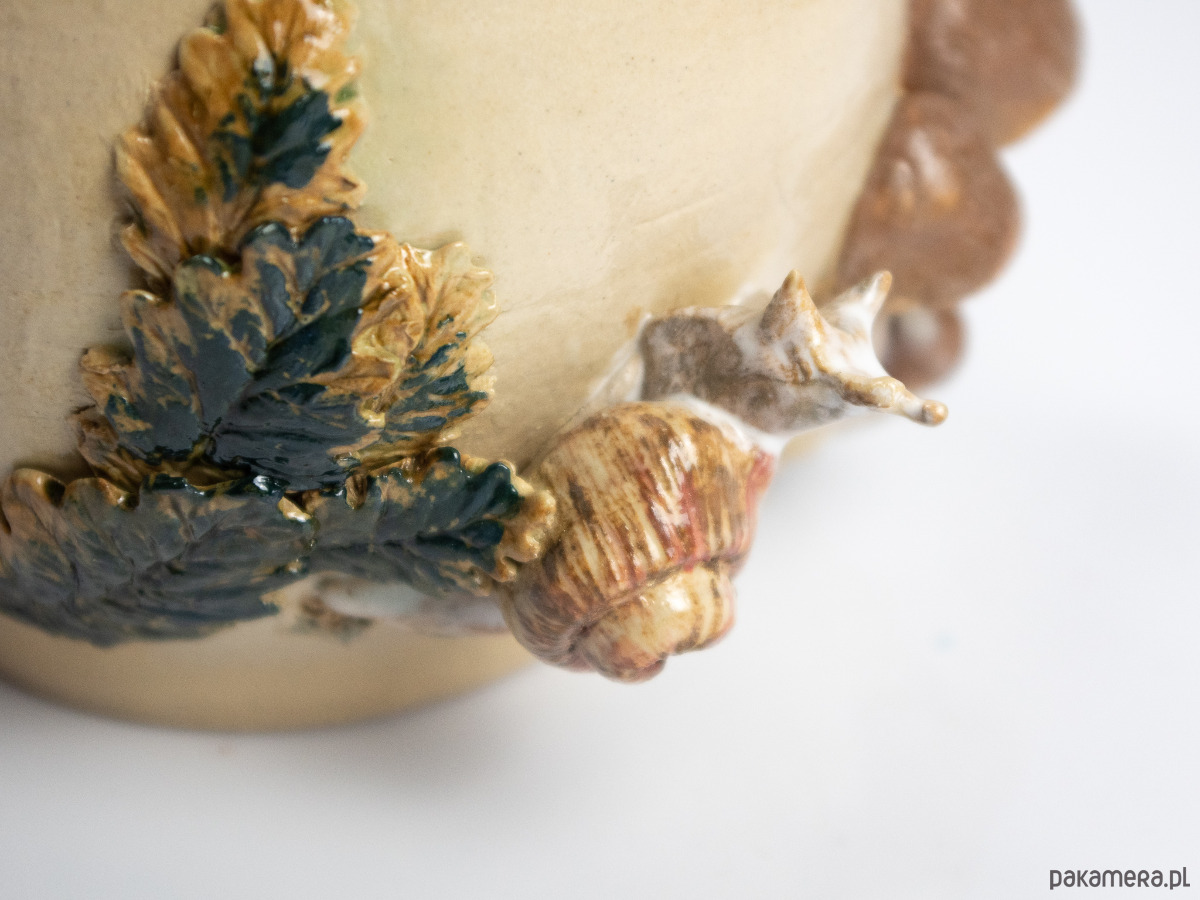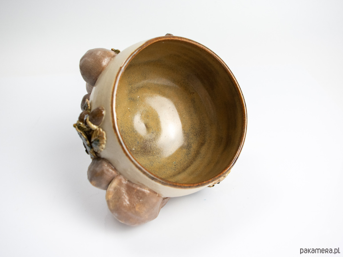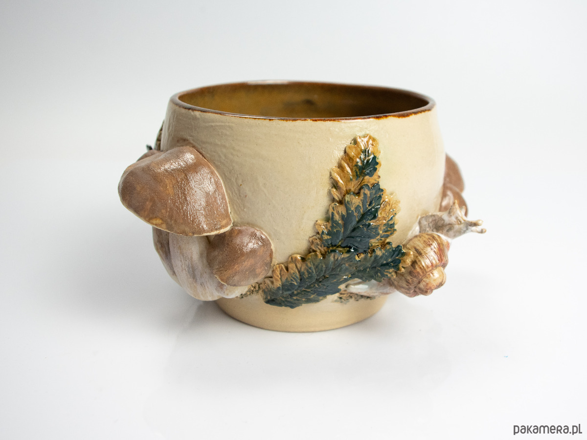 Miska „Borowiki” została wykonana ręcznie: bazę uformowano na kole garncarskim, a następnie ozdobiono ją plastycznymi rzeźbieniami borowików, liści dębu oraz filigranowego ślimaka, które tworzą dookoła naczynia leśną miniaturę. Wnętrze miski pokryte jest szkliwem w ciepłym, miodowo‑brązowym odcieniu, harmonizującym z kremowym kolorem gliny i naturalnymi barwami grzybów oraz liści. Zewnętrzna powierzchnia zabezpieczona jest przezroczystym szkliwem, które podkreśla fakturę ręcznego modelowania i dodaje całości subtelnego połysku. Miska jest niepowtarzalna, inspirowana lasem, znakomicie sprawdzi się zarówno na stole, jak i jako wyjątkowy, przyrodniczy akcent dekoracyjny lub prezent dla miłośników natury.