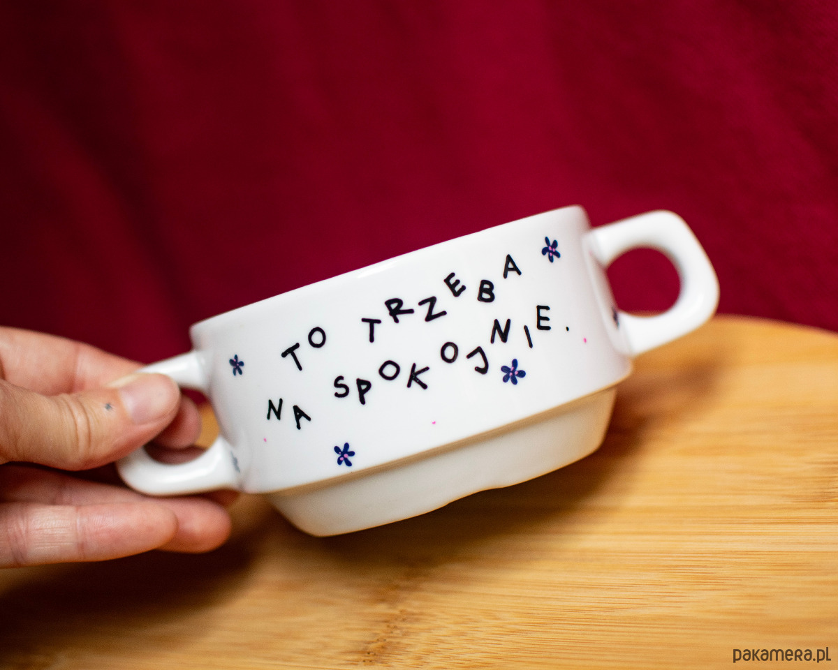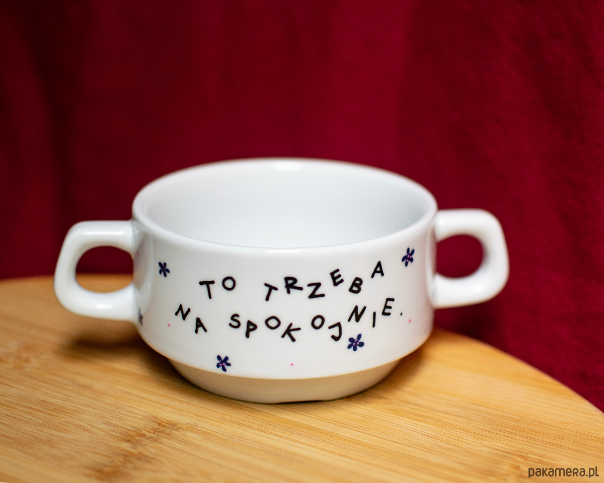 Ręcznie malowana miska bulionówka z drugiego obiegu. Ozdobiona napisem TO TRZEBA NA SPOKOJNIE oraz granatowo-różowymi kwiatkami i różowymi kropkami.