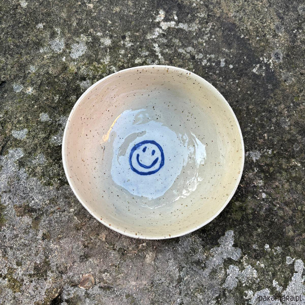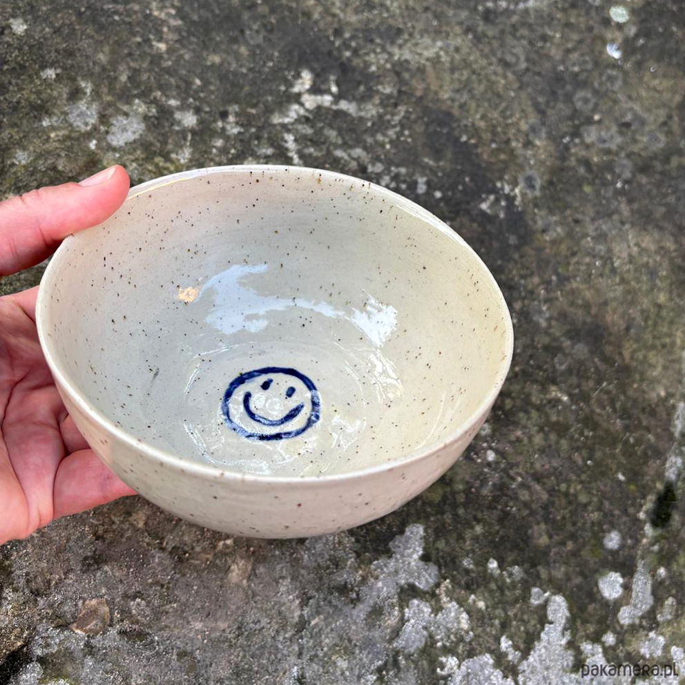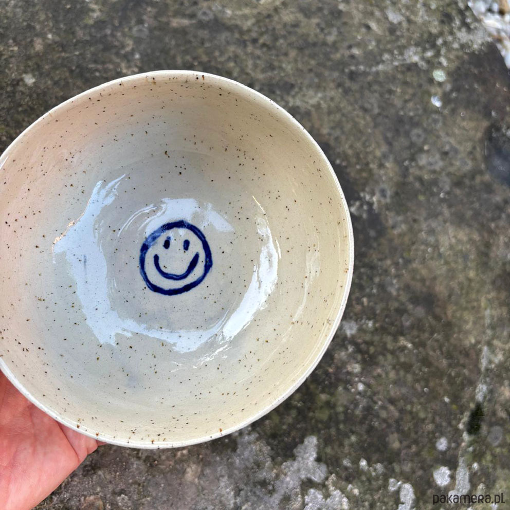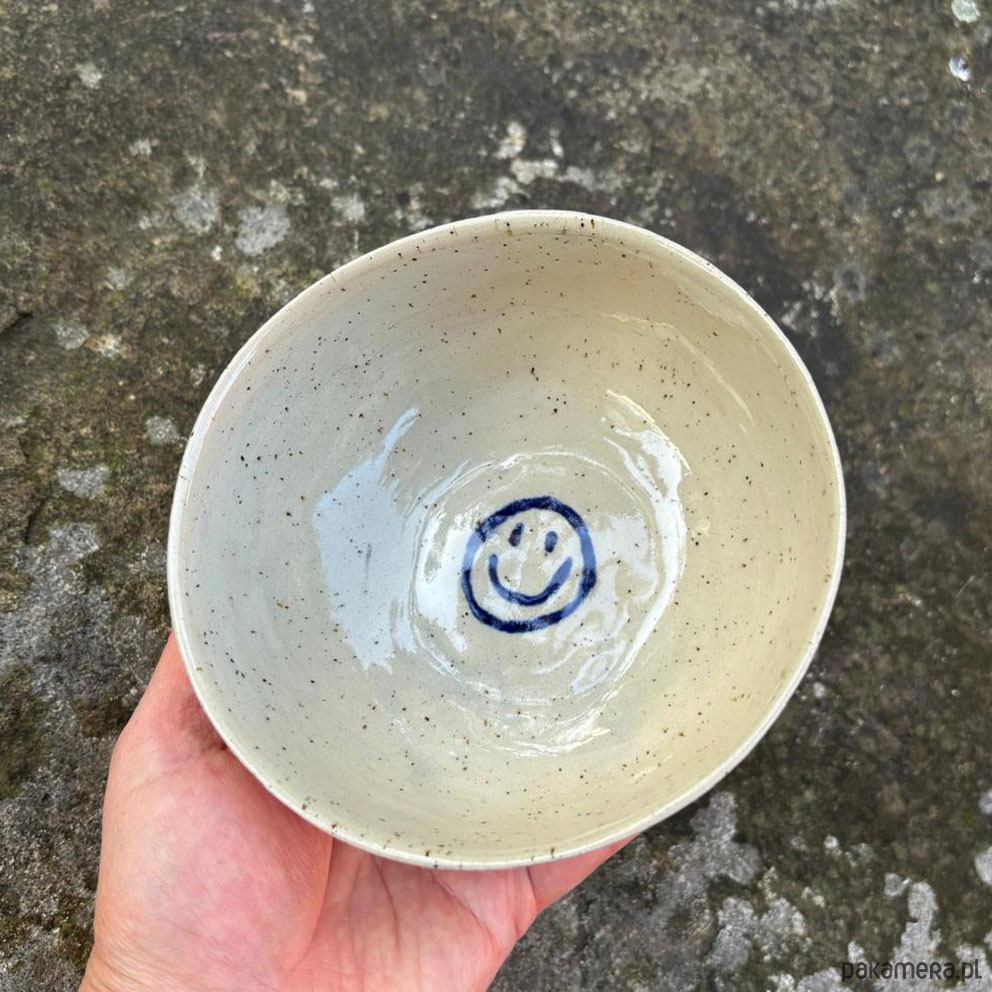Jasnokremowe miski z drobnymi brązowymi kropeczkami z malowaną buzią w środku.
