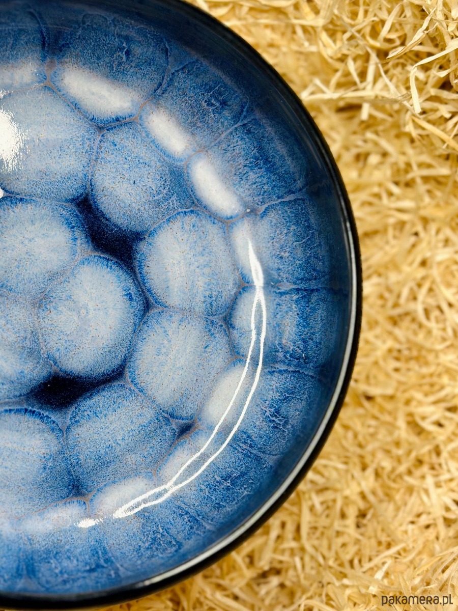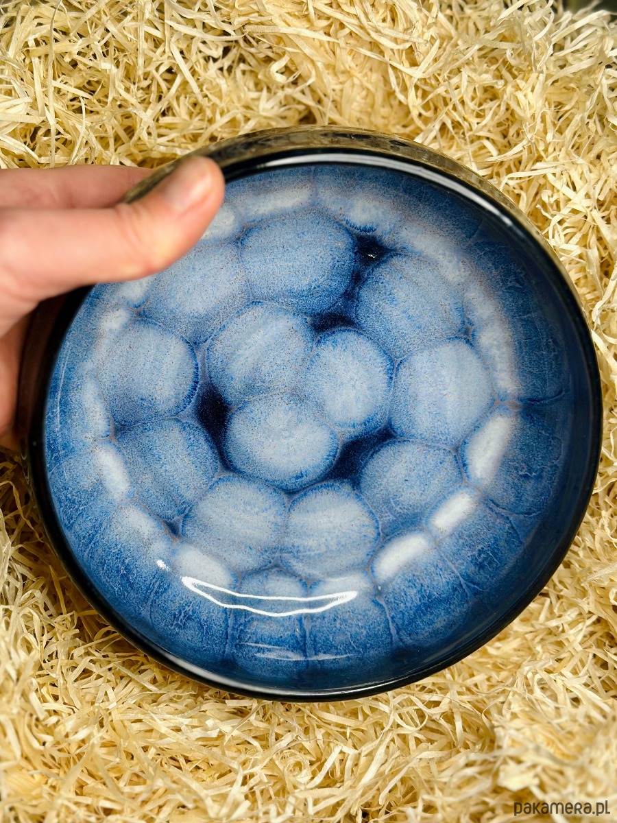 Ręcznie wykonana miska ceramiczna o hipnotyzującym wzorze, który łączy surowość gliny z elegancją artystycznego szkliwienia. Zachwyca unikalnym efektem wizualnym – przenikające się odcienie intensywnego granatu i kobaltu tworzą strukturę przypominającą morską głębię lub rozgwieżdżone niebo.