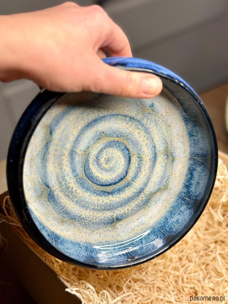 Ręcznie wykonana miska ceramiczna o hipnotyzującym wzorze, który łączy surowość gliny z elegancją artystycznego szkliwienia. Zachwyca unikalnym efektem wizualnym – przenikające się odcienie intensywnego granatu i kobaltu tworzą strukturę przypominającą morską głębię lub rozgwieżdżone niebo.