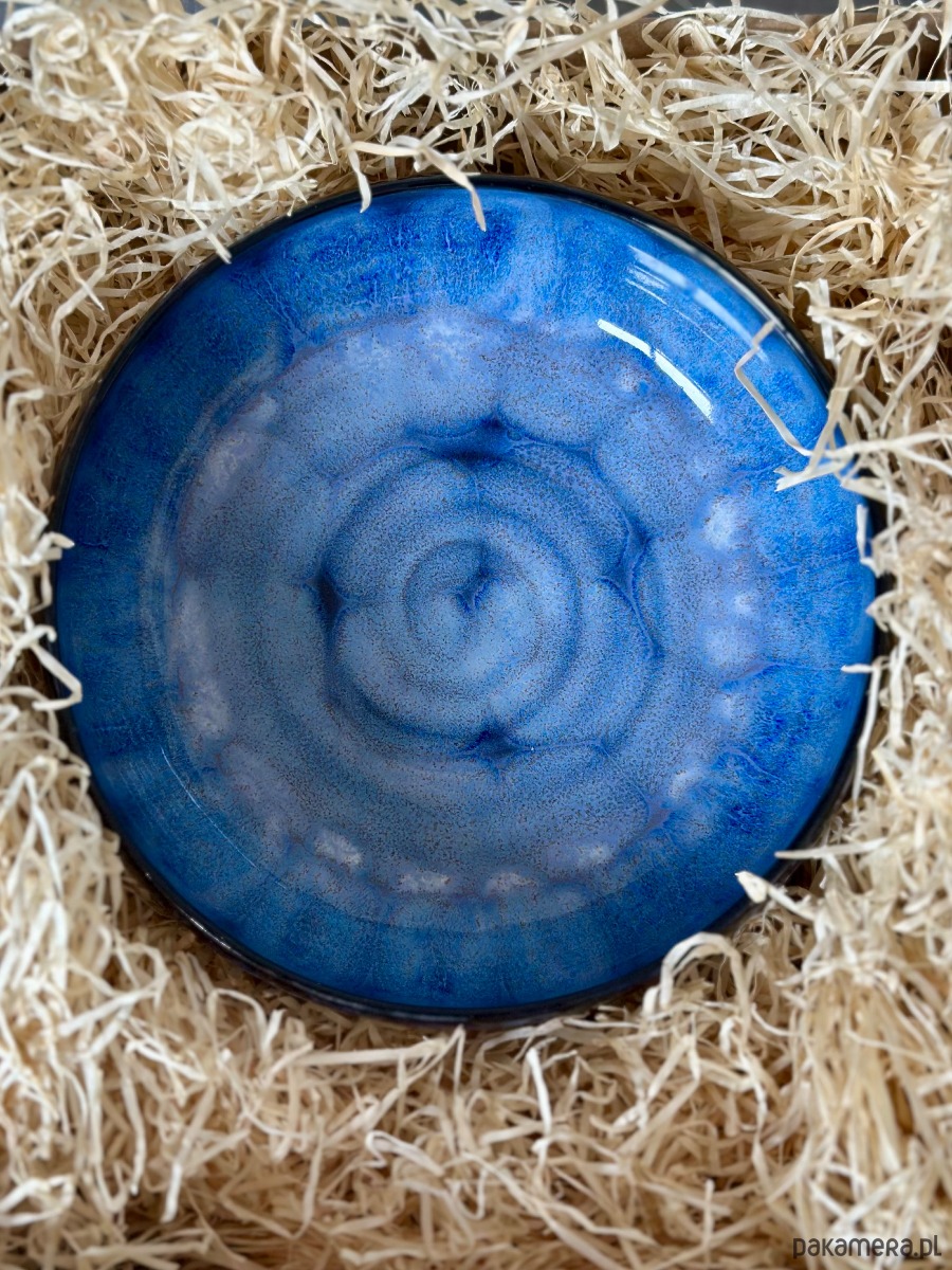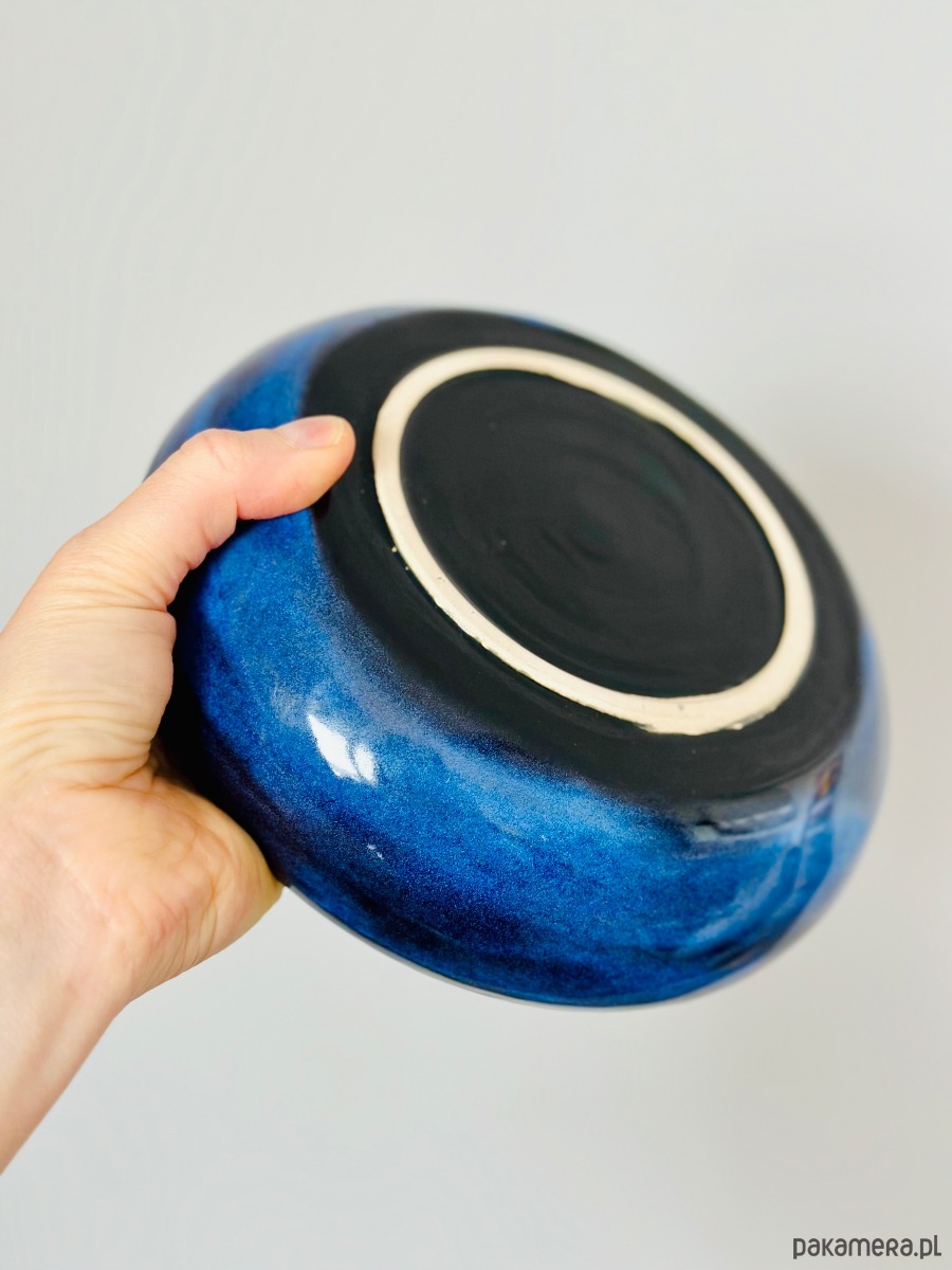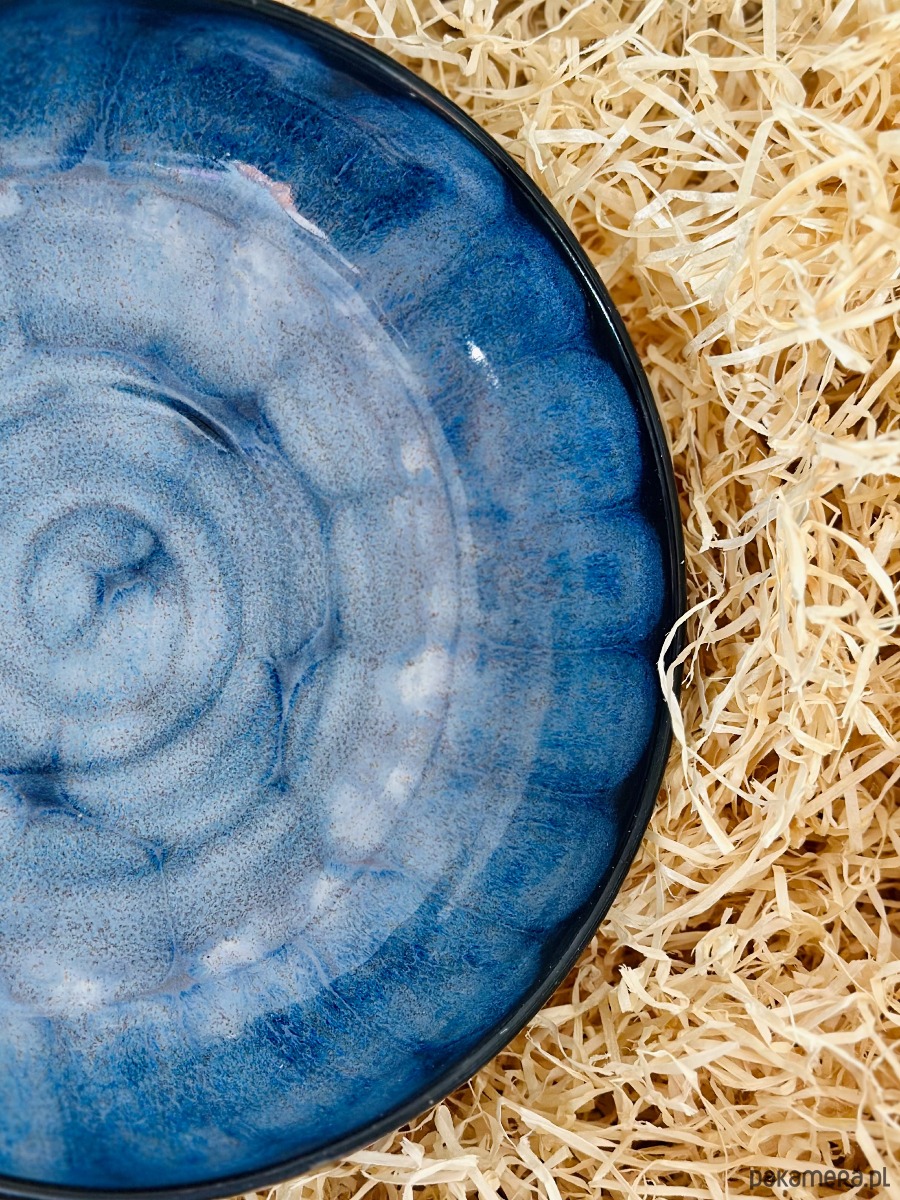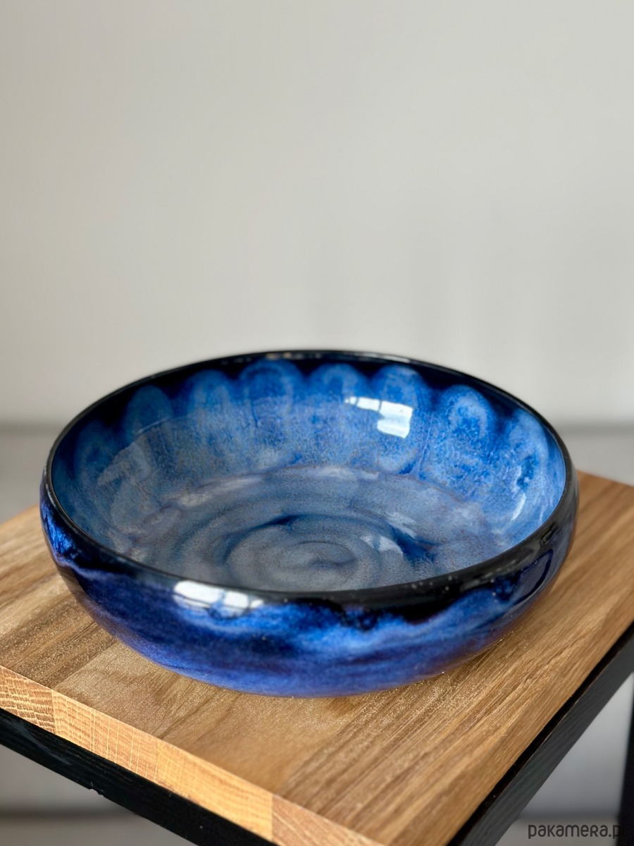 Ręcznie wykonana miska ceramiczna o hipnotyzującym wzorze, który łączy surowość gliny z elegancją artystycznego szkliwienia. Zachwyca unikalnym efektem wizualnym – przenikające się odcienie intensywnego granatu i kobaltu tworzą strukturę przypominającą morską głębię lub rozgwieżdżone niebo.
