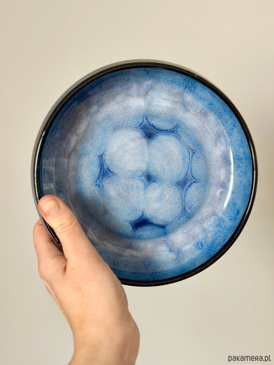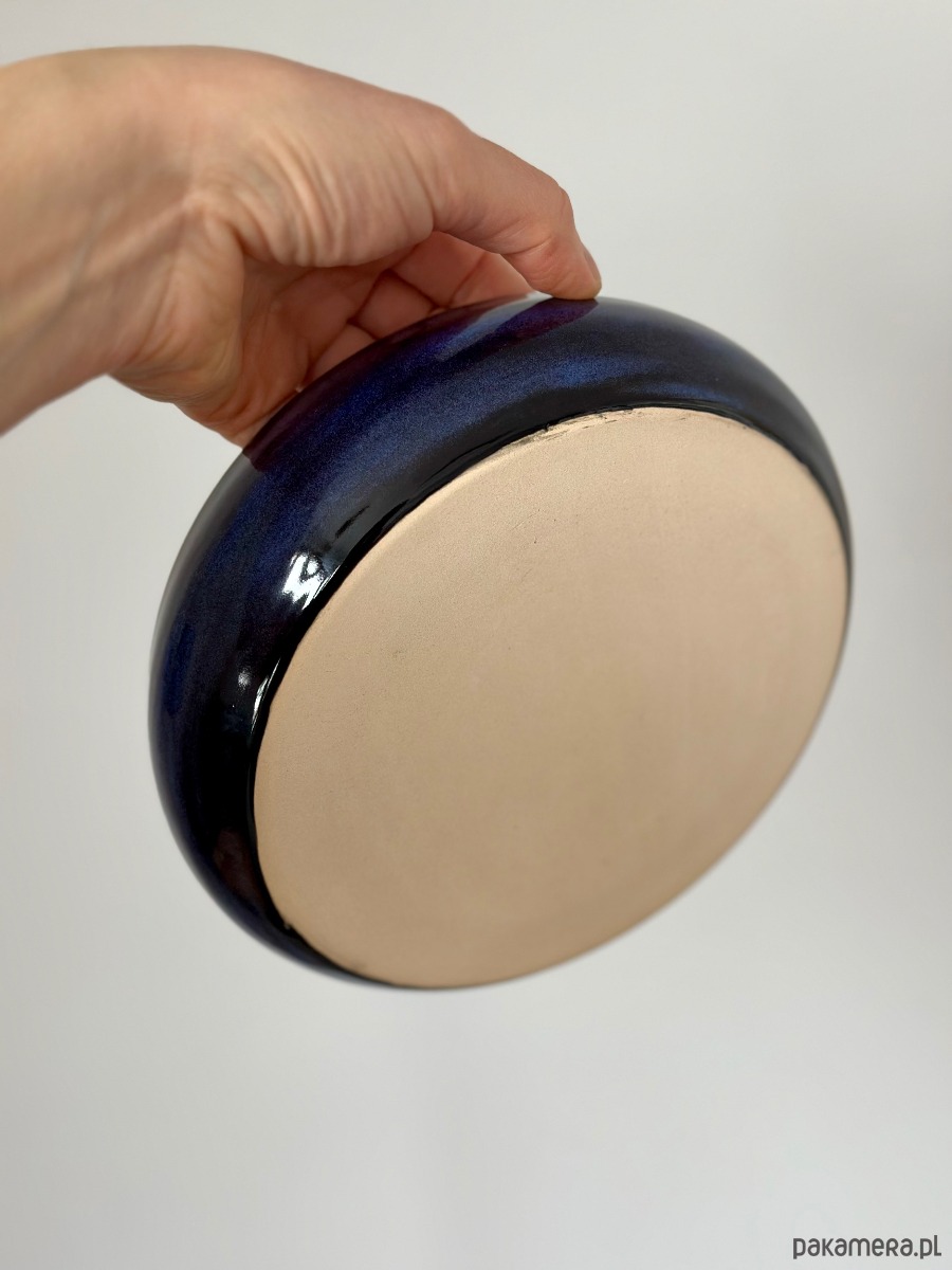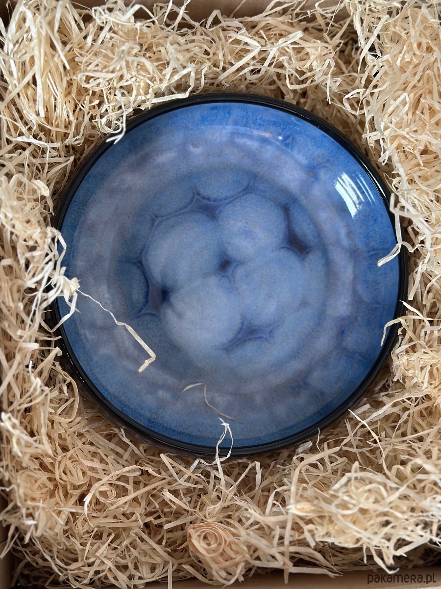Ręcznie wykonana miska ceramiczna o hipnotyzującym wzorze, który łączy surowość gliny z elegancją artystycznego szkliwienia. Zachwyca unikalnym efektem wizualnym – przenikające się odcienie intensywnego granatu i kobaltu tworzą strukturę przypominającą morską głębię lub rozgwieżdżone niebo.