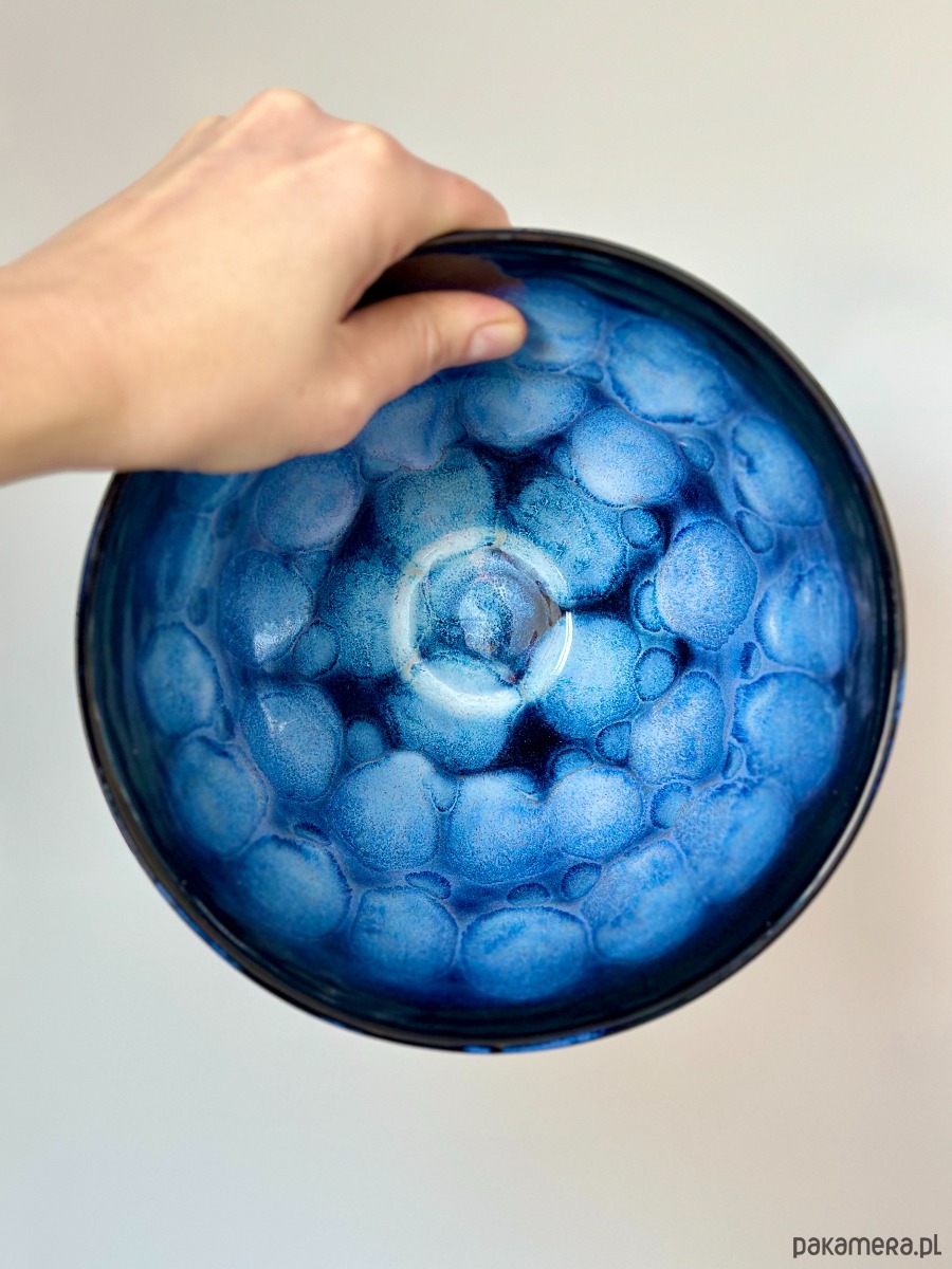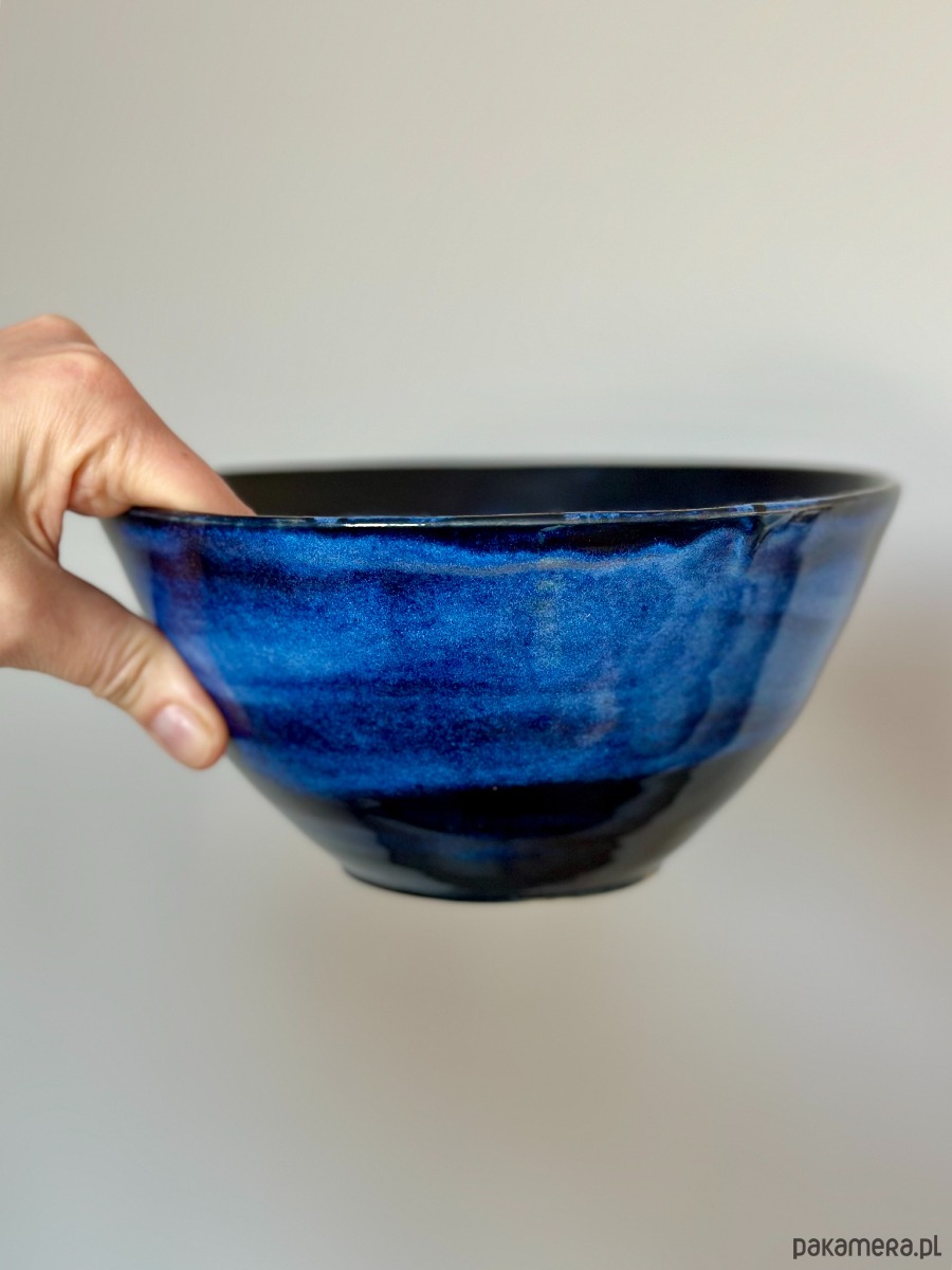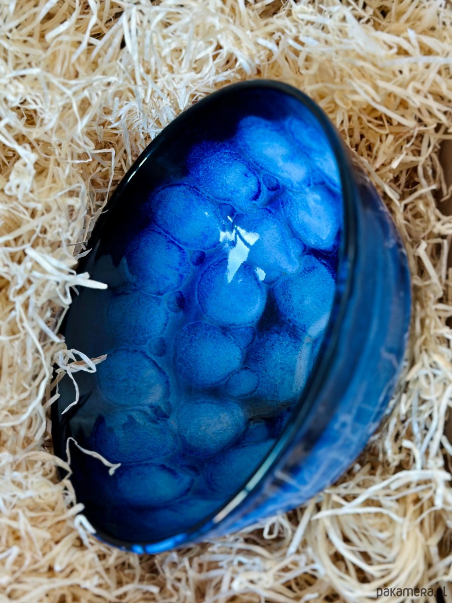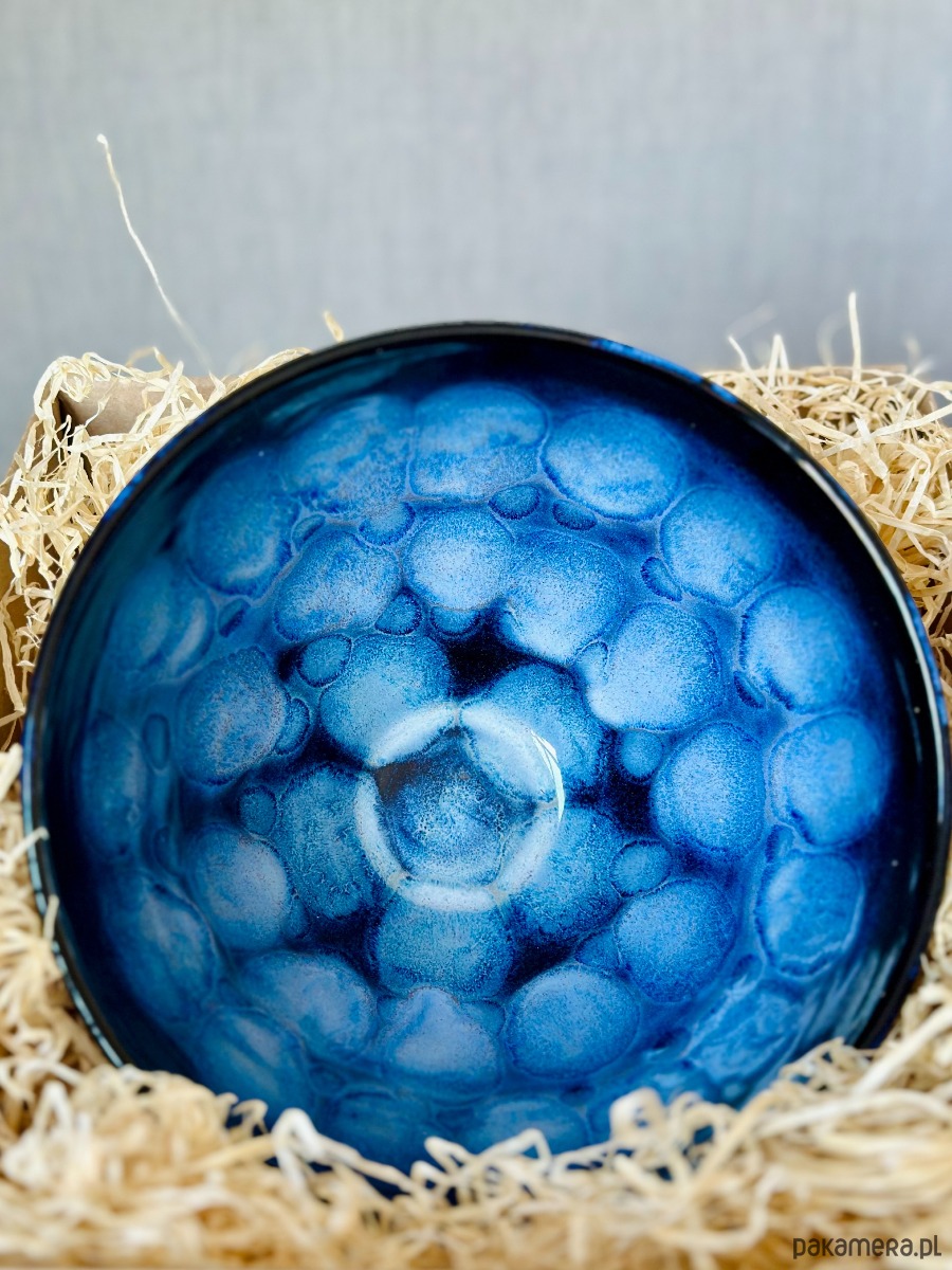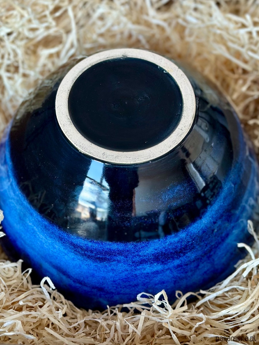 Ręcznie wykonana miska ceramiczna o hipnotyzującym wzorze, który łączy surowość gliny z elegancją artystycznego szkliwienia. Zachwyca unikalnym efektem wizualnym – przenikające się odcienie intensywnego granatu i kobaltu tworzą strukturę przypominającą morską głębię lub rozgwieżdżone niebo.