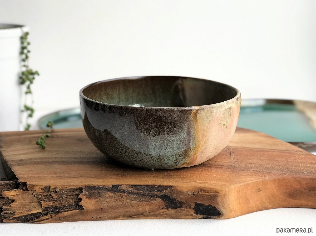 Ręcznie formowana miska ceramiczna wykonana z ciemnoczekoladowej masy ceramicznej, pokryta szkliwami spożywczymi, przeznaczona do kontaktu z żywnością.