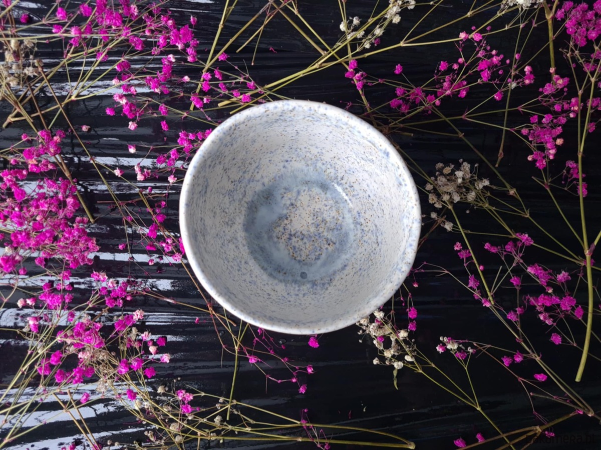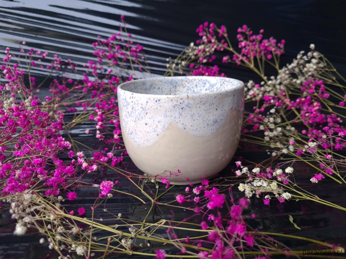 Kolorystyka nakrapiany biały z niebieskim i ecru.