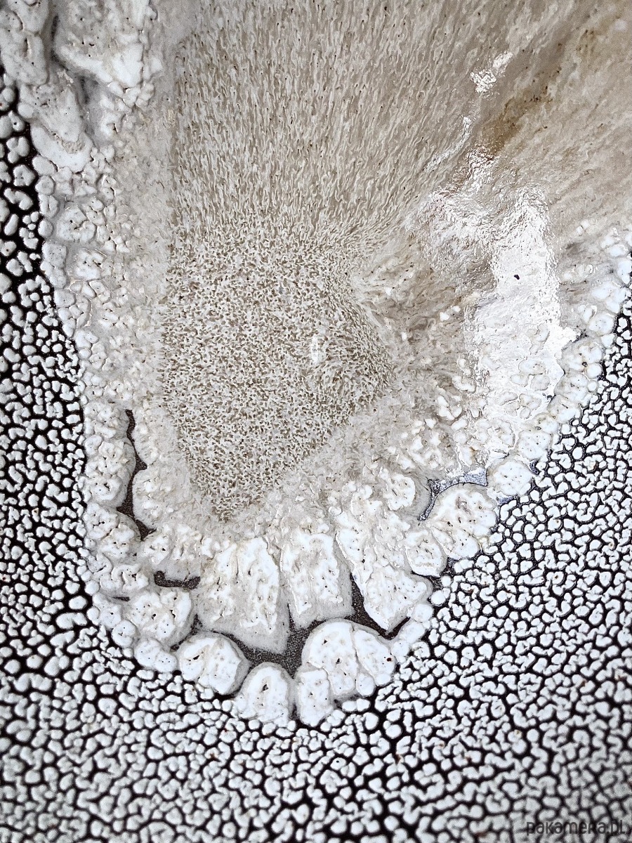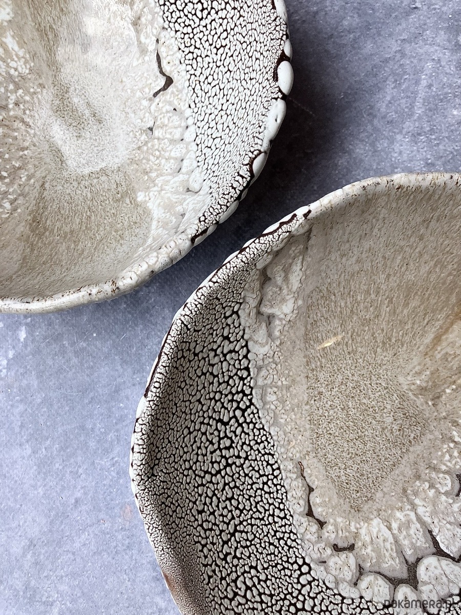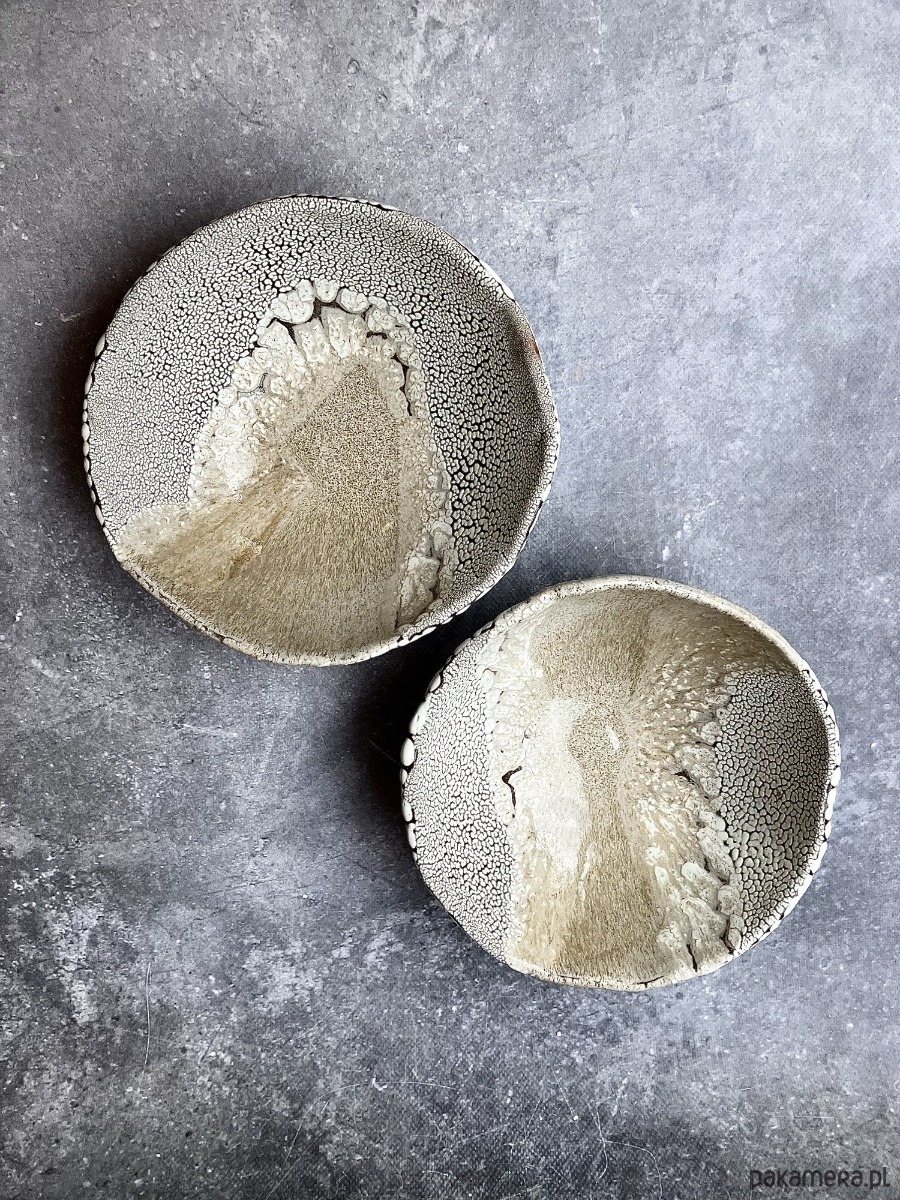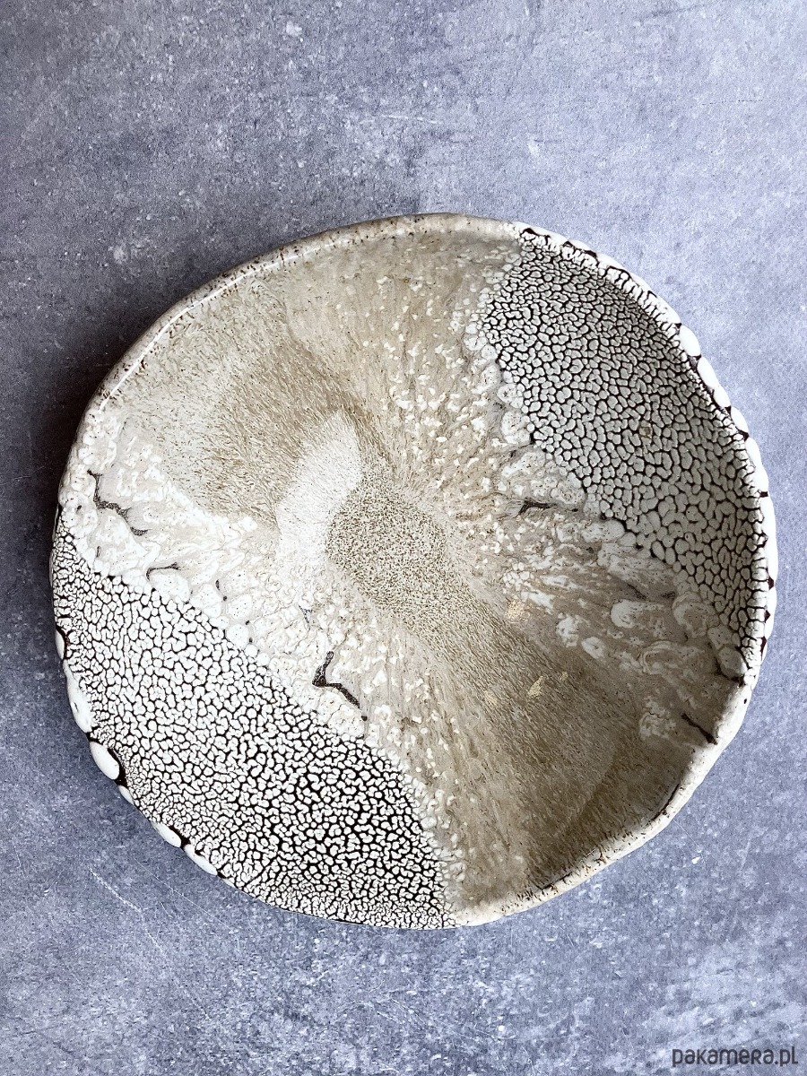 DEEP INTO THE SEA to autorska seria ceramiczna inspirowana ciszą, ciężarem i tajemnicą głębin. Każdy obiekt przypomina fragment podwodnego świata wydobyty na powierzchnię- jakby zastygły ślad procesów, które zachodzą daleko od światła, pod wpływem czasu, ciśnienia i powolnego ruchu materii. Powierzchnie naczyń są gęste, organiczne, pełne mikropęknięć, porów i struktur przywodzących na myśl rafy koralowe, wapienne osady, muszle i skalne dno morza. Kontrast między jasnymi, kredowymi obszarami a ciemniejszą, spękaną siatką tworzy wrażenie mapy nieznanego terenu- topografii głębin. Glazura zachowuje się jak osad mineralny: narasta, cofa się, odsłania warstwy, sugerując naturalne procesy erozji i krystalizacji.