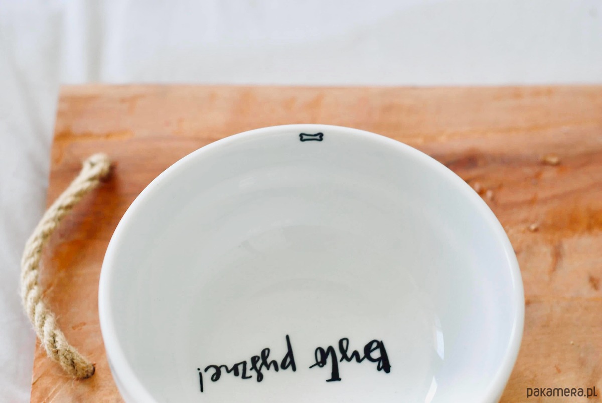 Miska dla psa z jego imieniem. Dodatkowo w środku miski znajduje się napis było pyszne! a na jej rogu słodka kostka :)