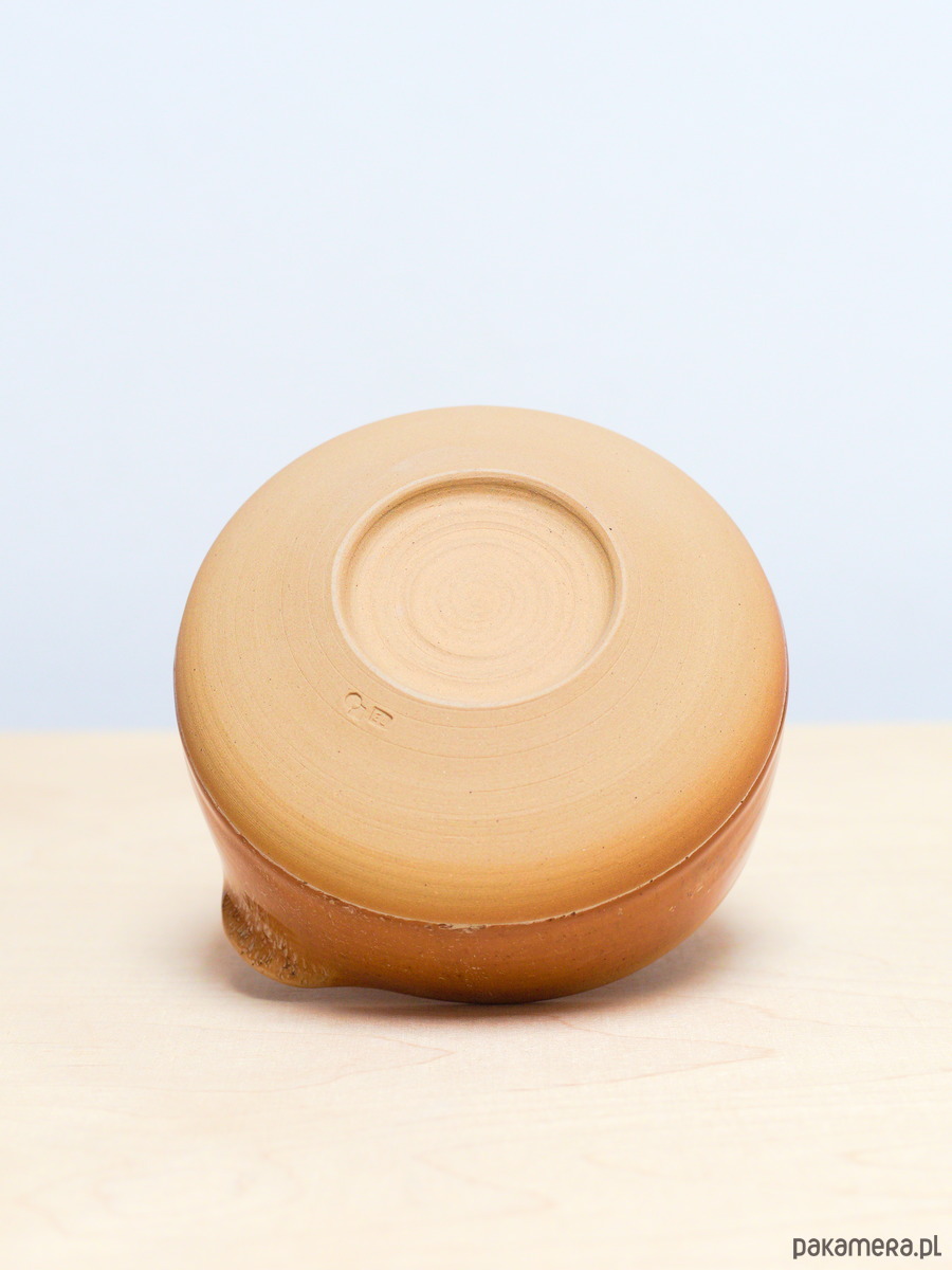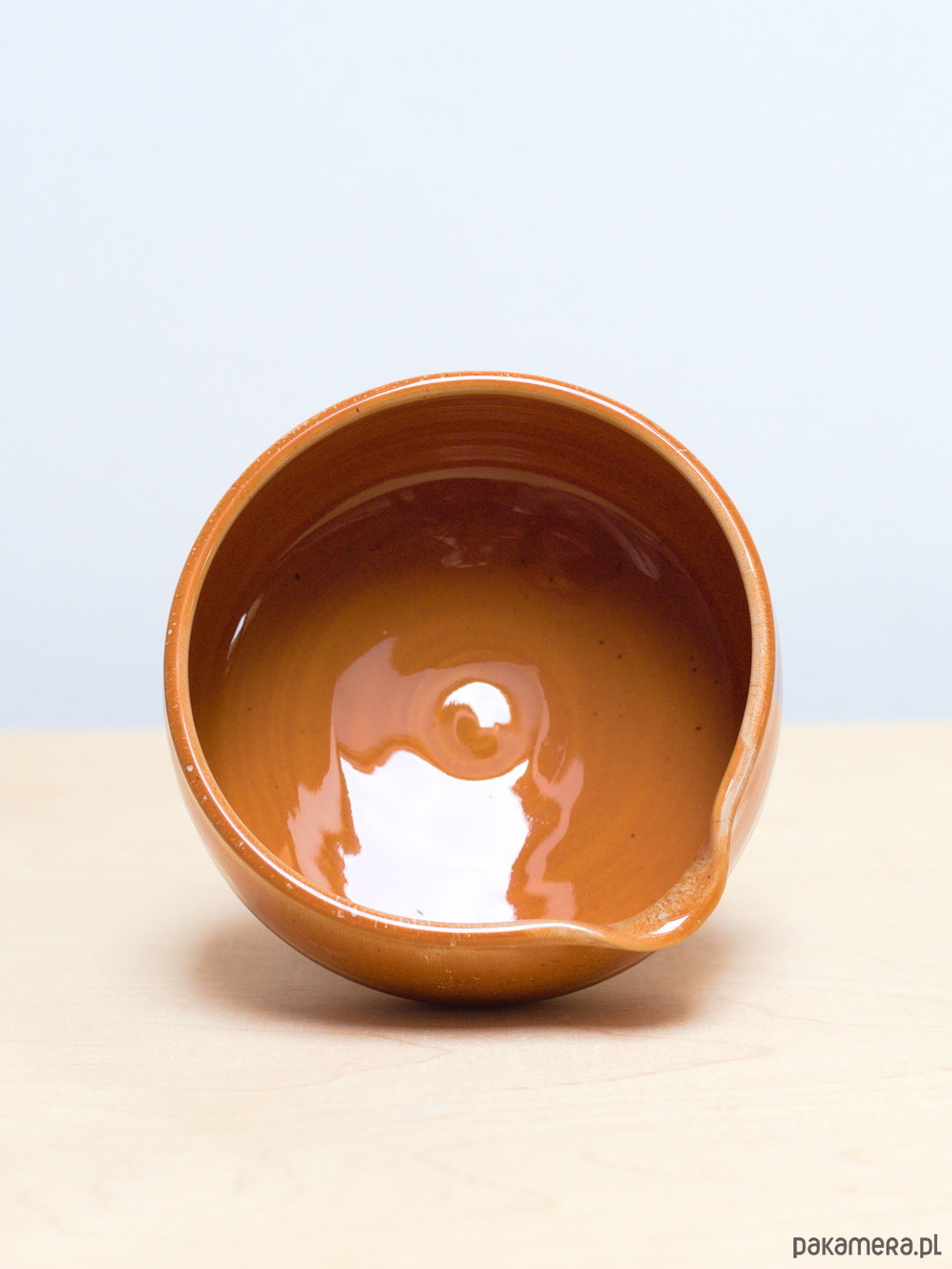 Kolor: Solony Karmel - ładny ciepły karmelowy kolor z beżowymi drobnymi kropkami. Powierzchnia szkliwa ma błyszczące wykończenie. Spód tych naczyń jest odsłonięty i ukazuje naturalny kolor beżowej gliny.