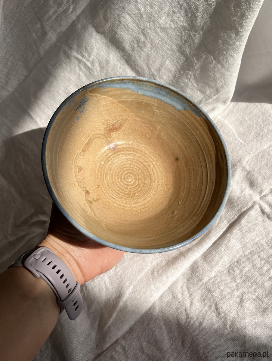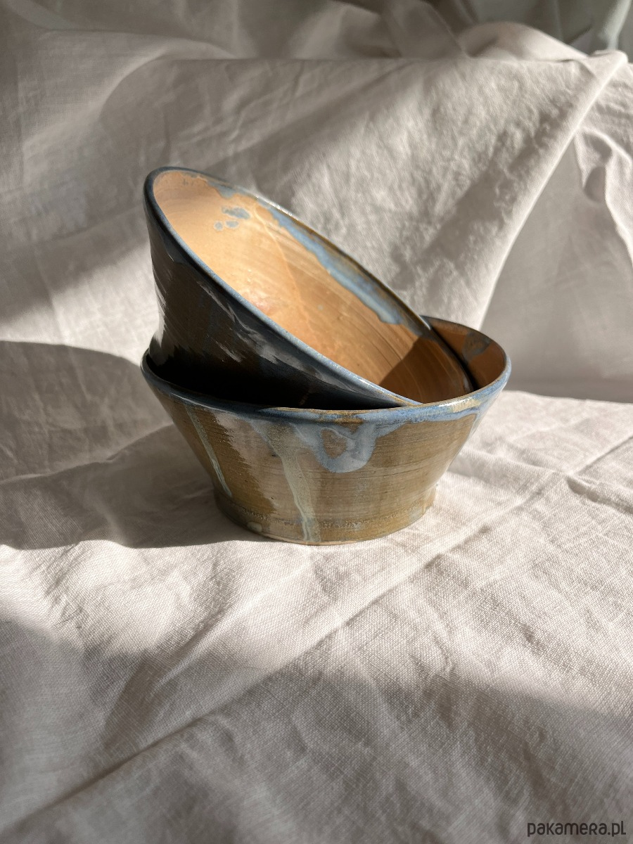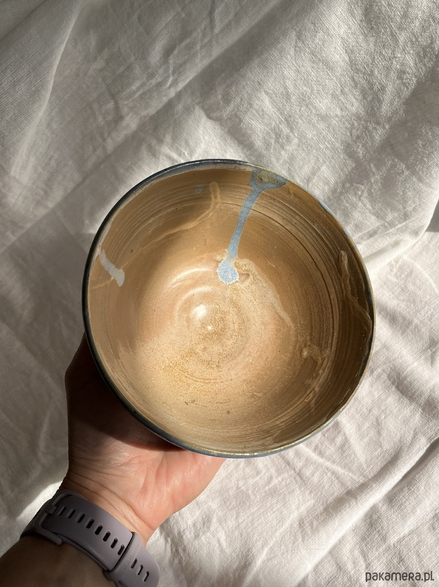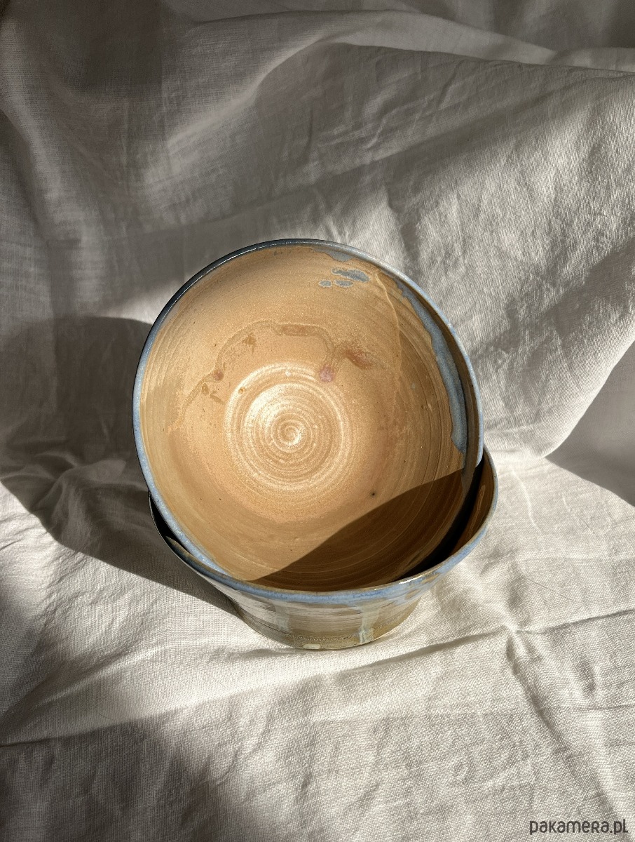 Ręcznie wykonana miska stworzona z myślą o serwowaniu ramenu. Jej wnętrze zostało pokryte beżowym szkliwem z subtelnymi przejściami niebiesko-zielonych tonów od zewnątrz, które układają się inaczej na każdej sztuce, tworząc unikalne wzory.