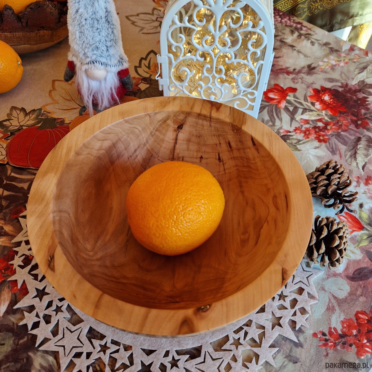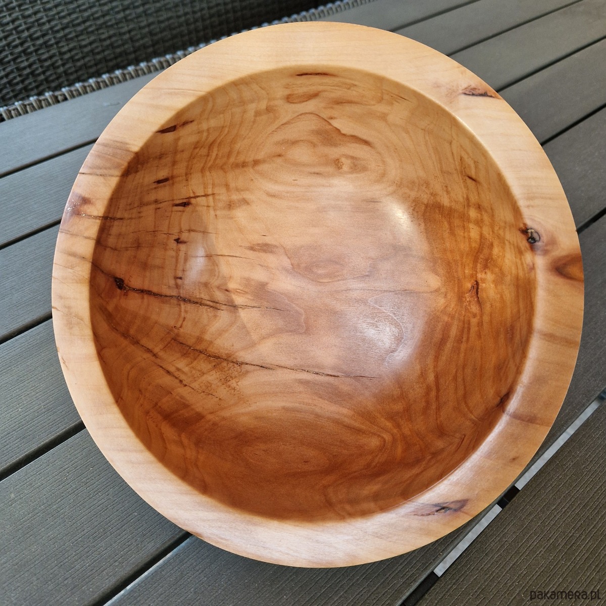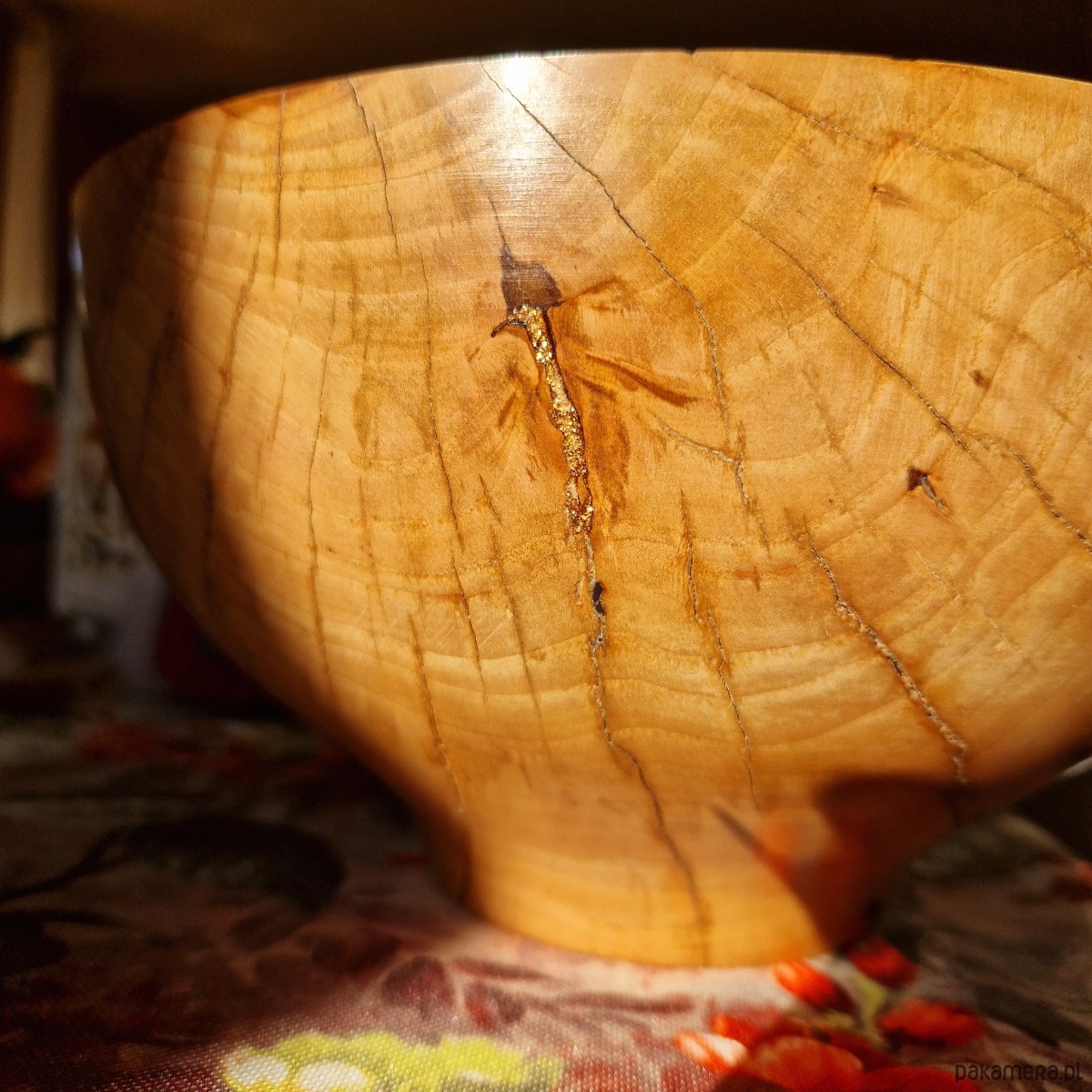 Duża misa na owoce lub inne pyszne produkty została wykonana z drewna drzewa owocowego – jabłoni. Ciąży w dłoni i ma wyrazisty charakter. Naturalne pęknięcia charakterystyczne dla drzew owocowych zostały wypełnione klejem żywicznym z kryształkami złotej miki w japońskim stylu Kintsugi. Spód misy okala cokolik, który nadaje jej masywnej postaci lekkości i unosi ją nad stołem. Kształt charakteryzuje się pochyłą, nowoczesną, grubą krawędzią. Jest to efektowny przedmiot z naturalnego drewna, który ozdobi każdy stół. Wykończenie stanowi olej mineralny, olejek cytrynowy i szelak. W celu konserwacji myjemy misę ręcznie, dokładnie suszymy a następnie pociągamy jakimkolwiek olejem (najlepszy lniany).