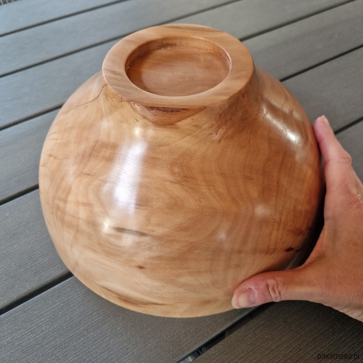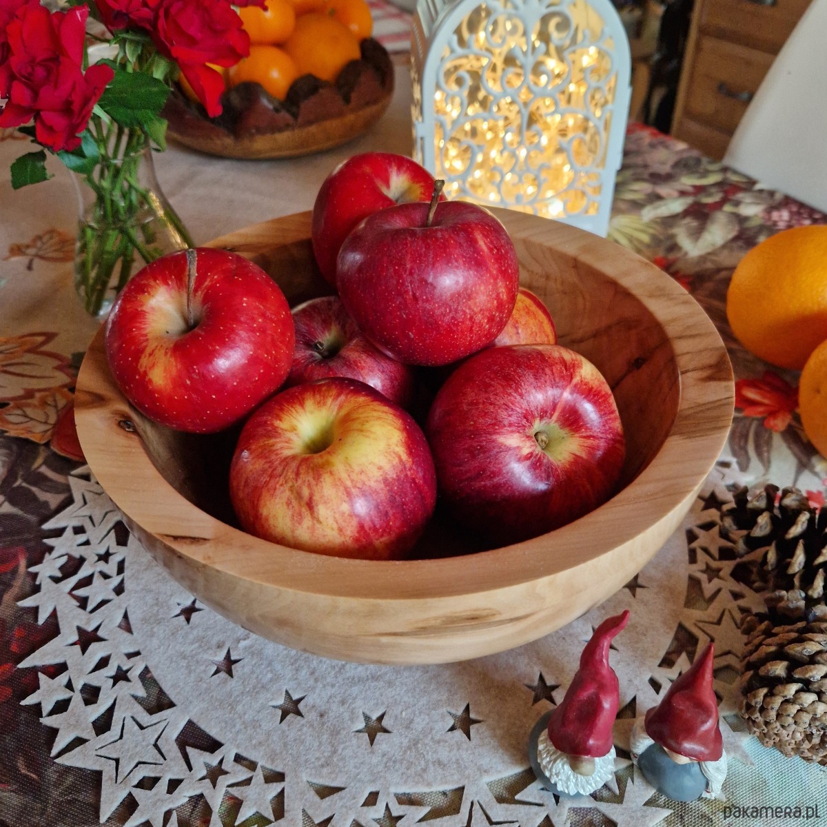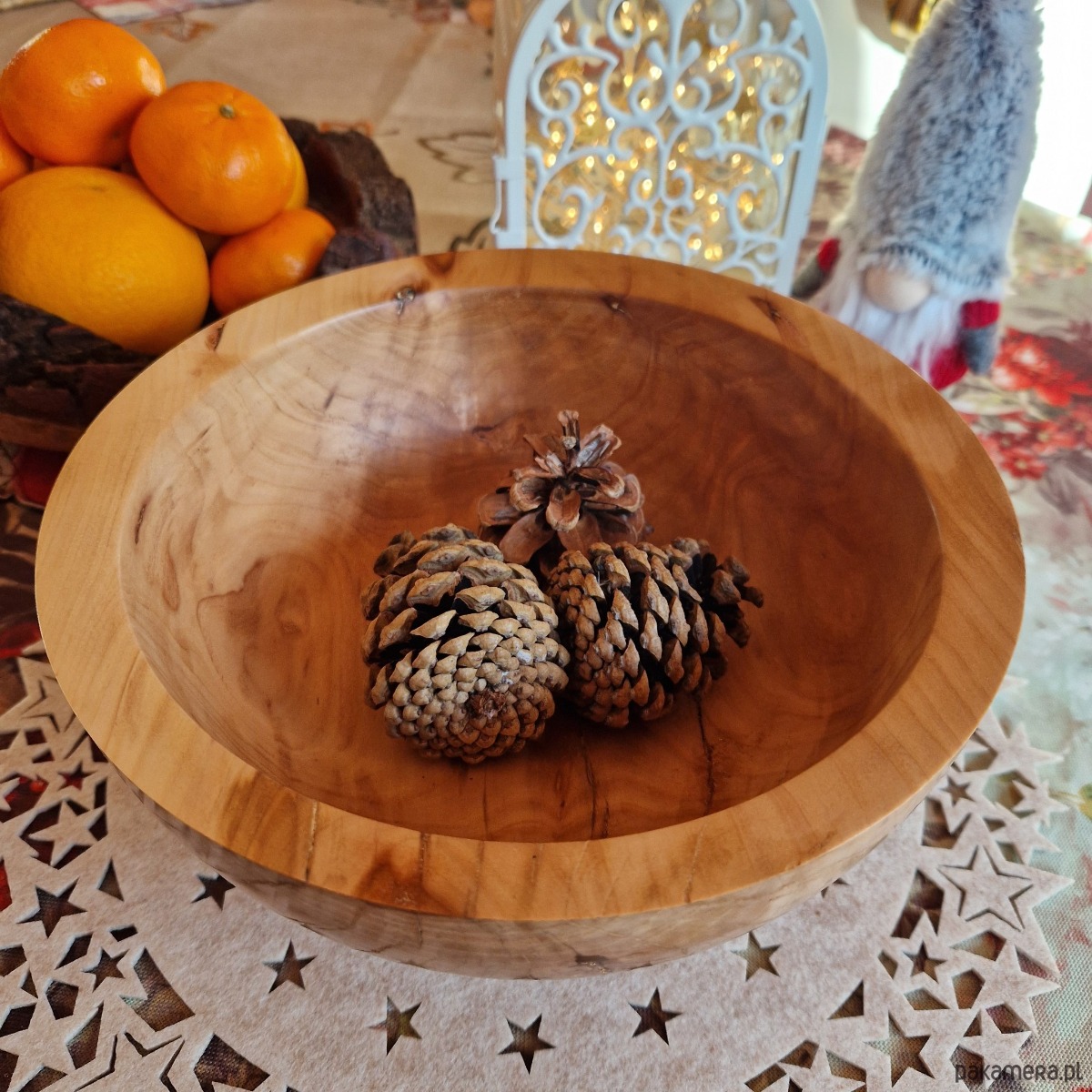 Duża misa na owoce lub inne pyszne produkty została wykonana z drewna drzewa owocowego – jabłoni. Ciąży w dłoni i ma wyrazisty charakter. Naturalne pęknięcia charakterystyczne dla drzew owocowych zostały wypełnione klejem żywicznym z kryształkami złotej miki w japońskim stylu Kintsugi. Spód misy okala cokolik, który nadaje jej masywnej postaci lekkości i unosi ją nad stołem. Kształt charakteryzuje się pochyłą, nowoczesną, grubą krawędzią. Jest to efektowny przedmiot z naturalnego drewna, który ozdobi każdy stół. Wykończenie stanowi olej mineralny, olejek cytrynowy i szelak. W celu konserwacji myjemy misę ręcznie, dokładnie suszymy a następnie pociągamy jakimkolwiek olejem (najlepszy lniany).