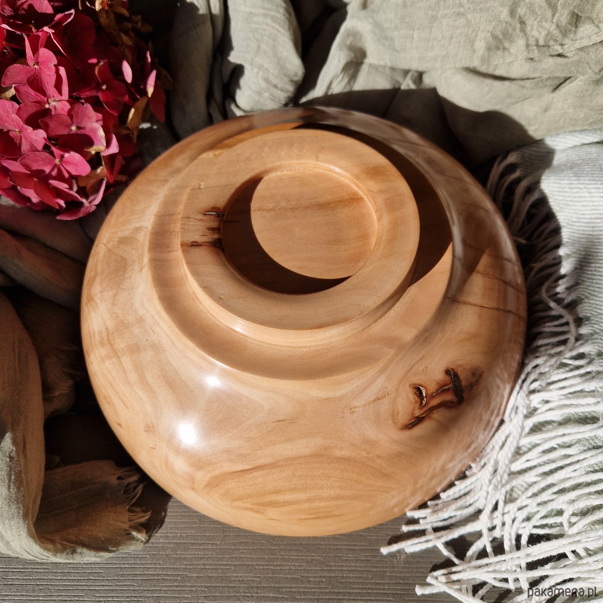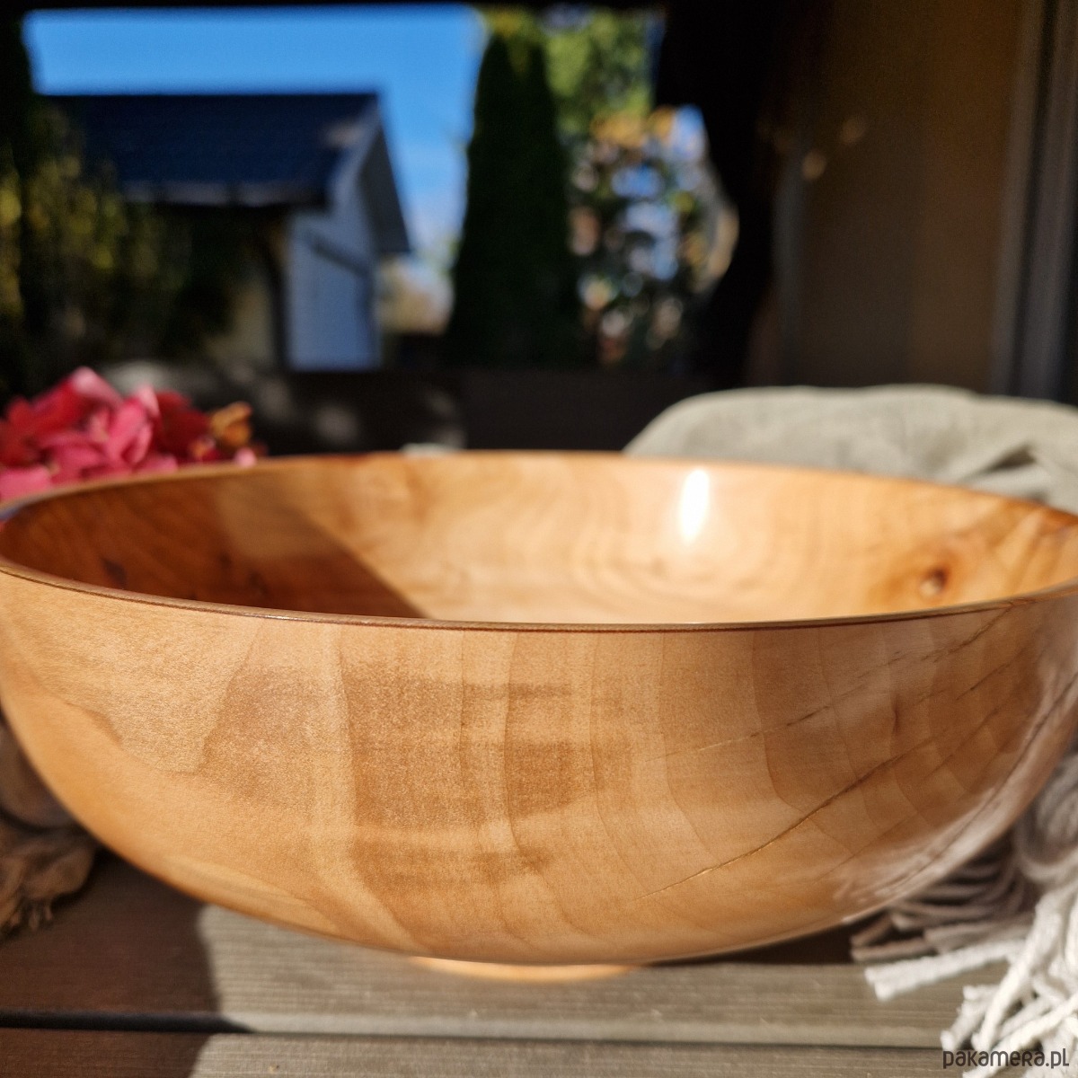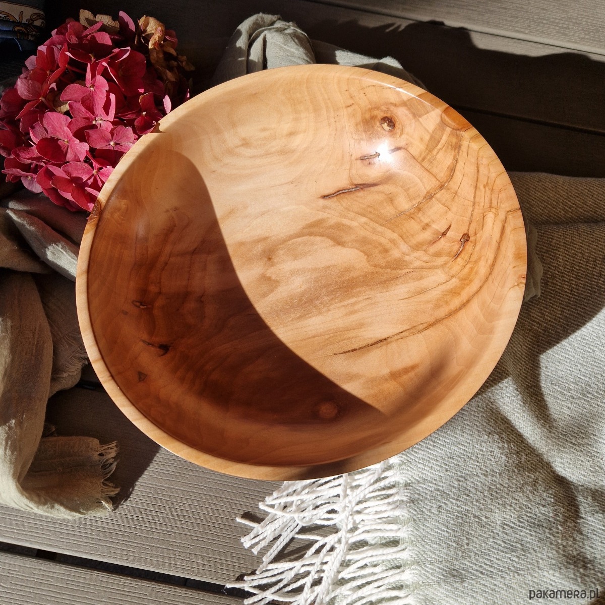 Duża, ale delikatna misa na owoce z drewna jabłoni stoi na niewielkim cokole. Cokół jest szeroki, dzięki czemu miska jest bardzo stabilna. Szczeliny wypełniliśmy klejem żywicznym z płatkami złotej miki, podobnym do stosowanego w Japonii w technice kintsugi. Powierzchnia drewna jest bardzo gładka, a sama miska pomimo cienkich ścianek i delikatnego wyglądu, ma odpowiednią wagę. Może pomieścić dużo owoców, górę pączków lub świątecznych pierników. Wniesie ciepło i elegancki, ekologiczny styl do każdego salonu. Jest łatwa w czyszczeniu – wystarczy ją od czasu do czasu umyć, dobrze wysuszyć i naoliwić olejem naturalnym (najlepszy lniany).