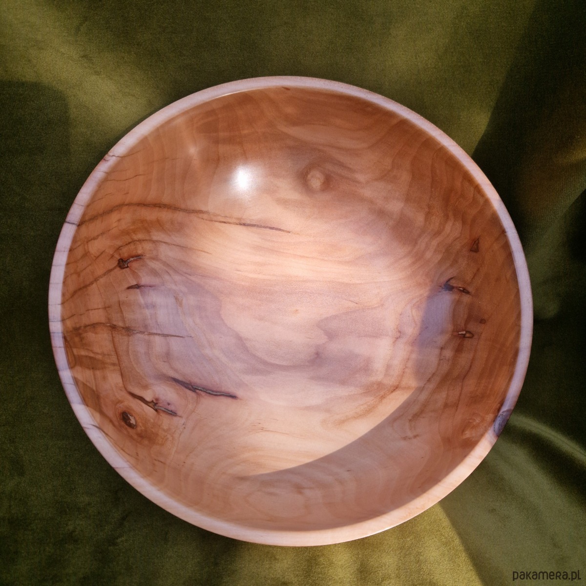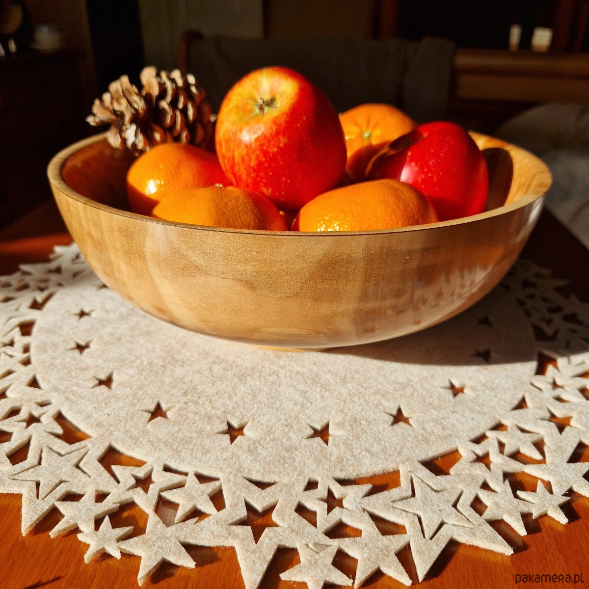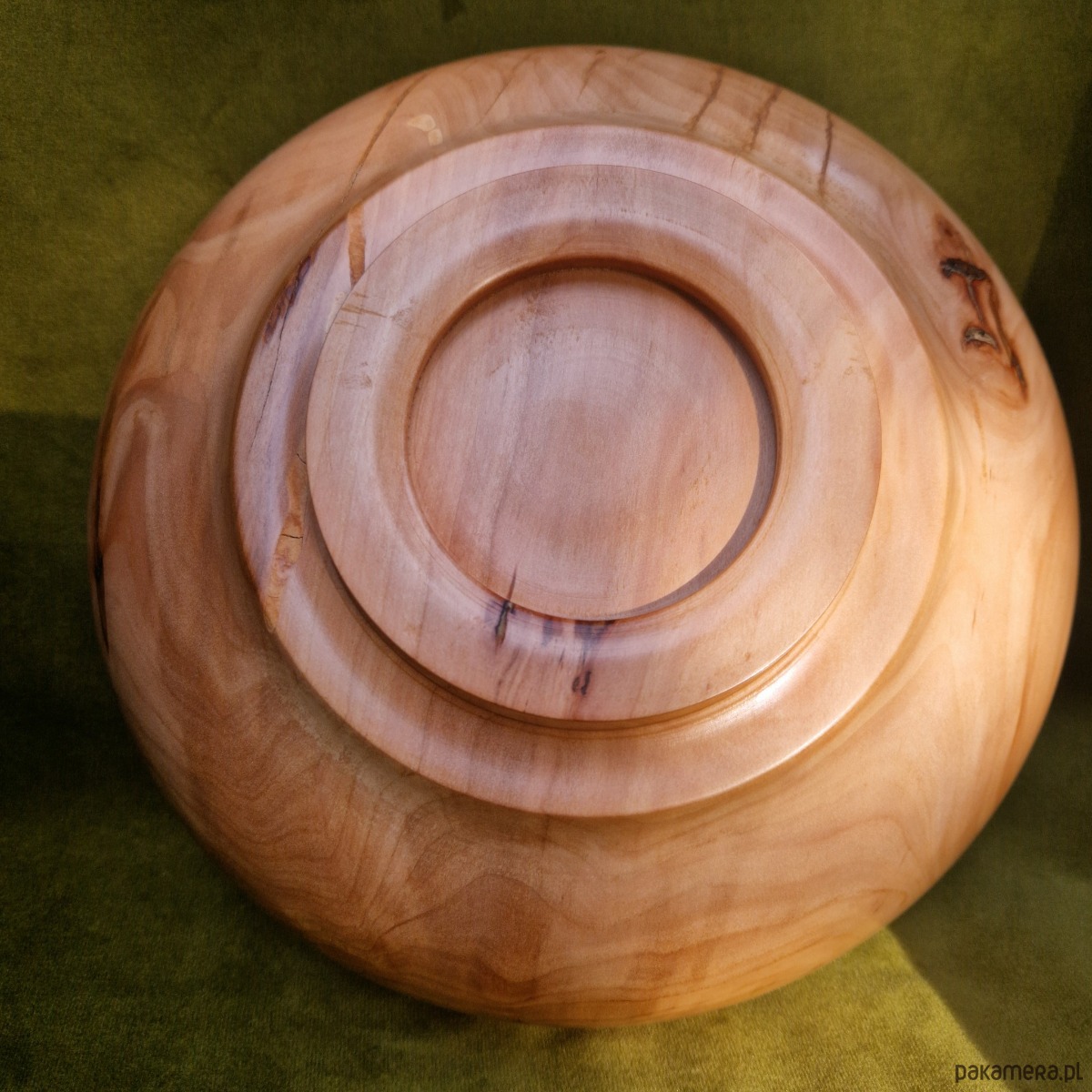 Duża, ale delikatna misa na owoce z drewna jabłoni stoi na niewielkim cokole. Cokół jest szeroki, dzięki czemu miska jest bardzo stabilna. Szczeliny wypełniliśmy klejem żywicznym z płatkami złotej miki, podobnym do stosowanego w Japonii w technice kintsugi. Powierzchnia drewna jest bardzo gładka, a sama miska pomimo cienkich ścianek i delikatnego wyglądu, ma odpowiednią wagę. Może pomieścić dużo owoców, górę pączków lub świątecznych pierników. Wniesie ciepło i elegancki, ekologiczny styl do każdego salonu. Jest łatwa w czyszczeniu – wystarczy ją od czasu do czasu umyć, dobrze wysuszyć i naoliwić olejem naturalnym (najlepszy lniany).