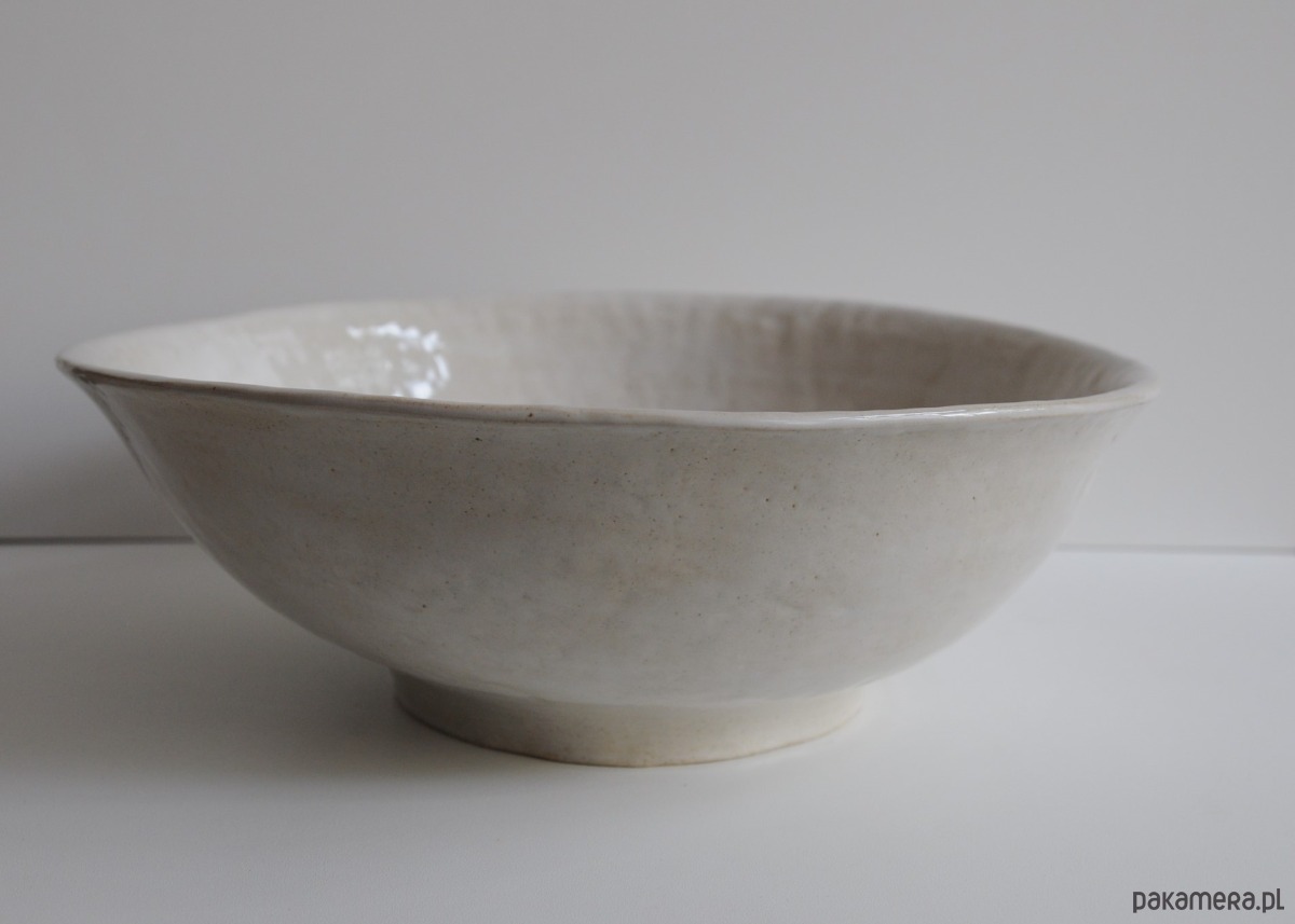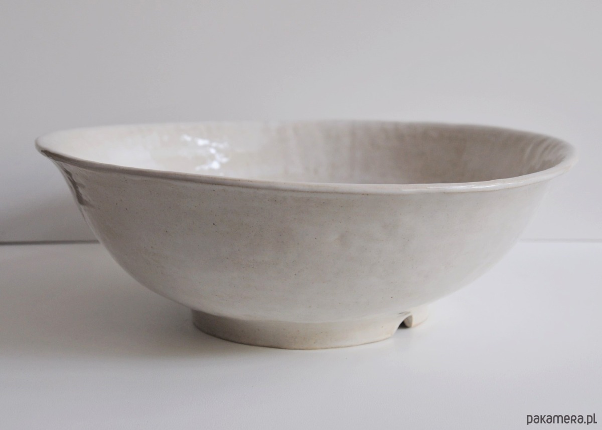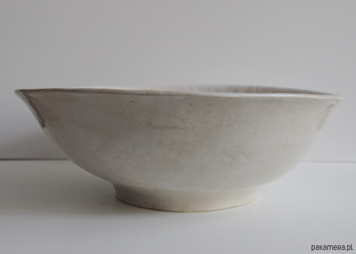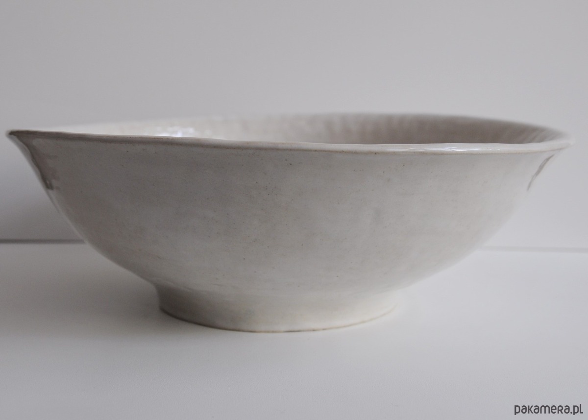 Duża miska o nieregularnym kształcie lepiona z jasnej gliny szamotowej.