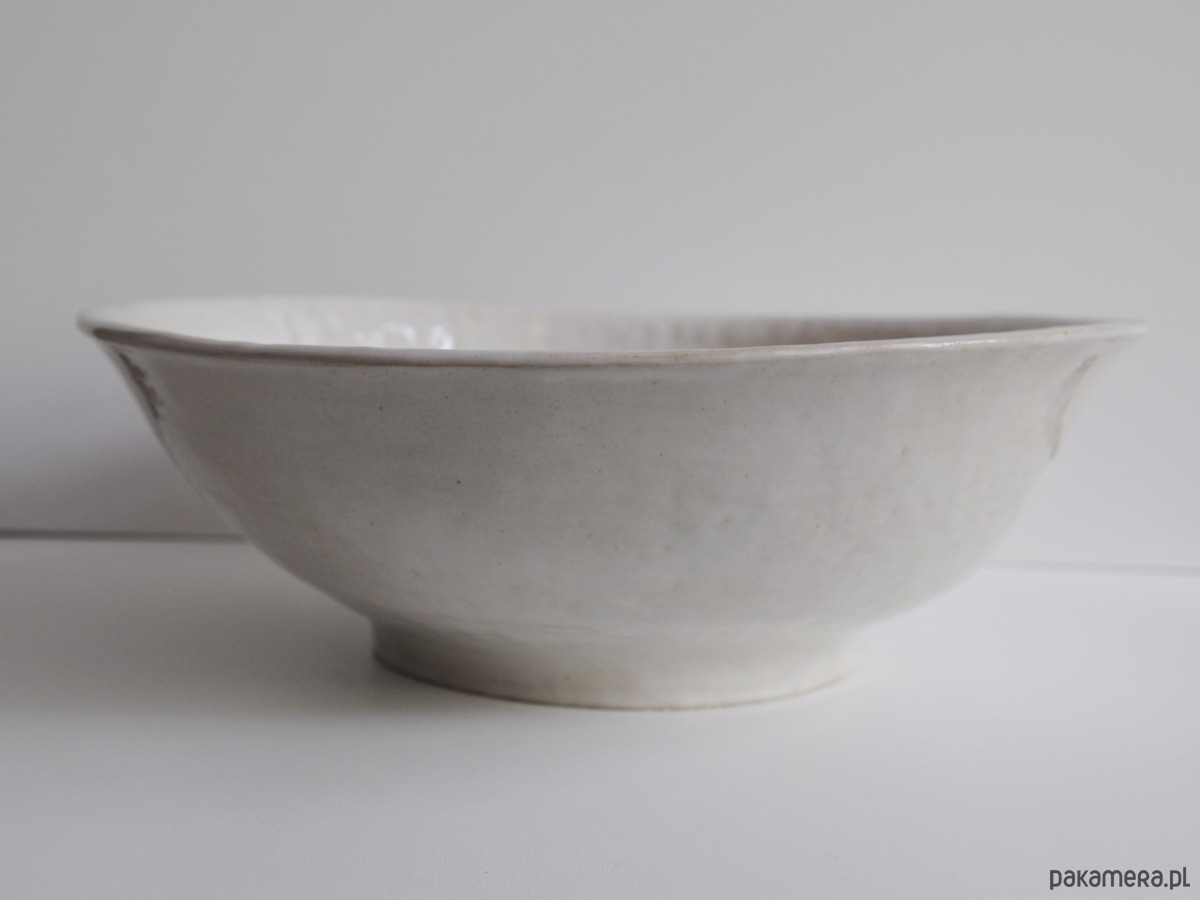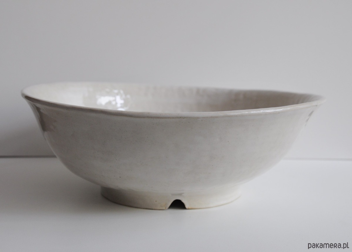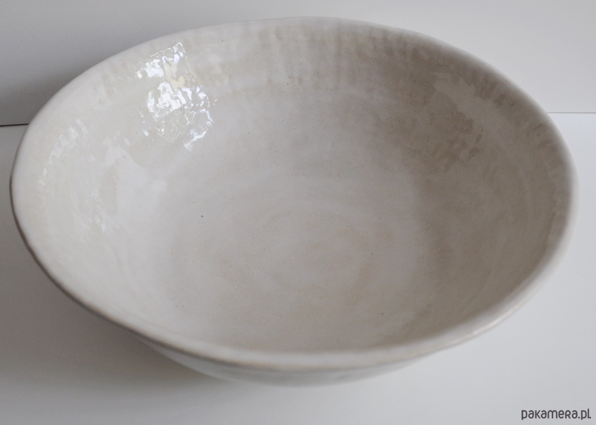 Duża miska o nieregularnym kształcie lepiona z jasnej gliny szamotowej.