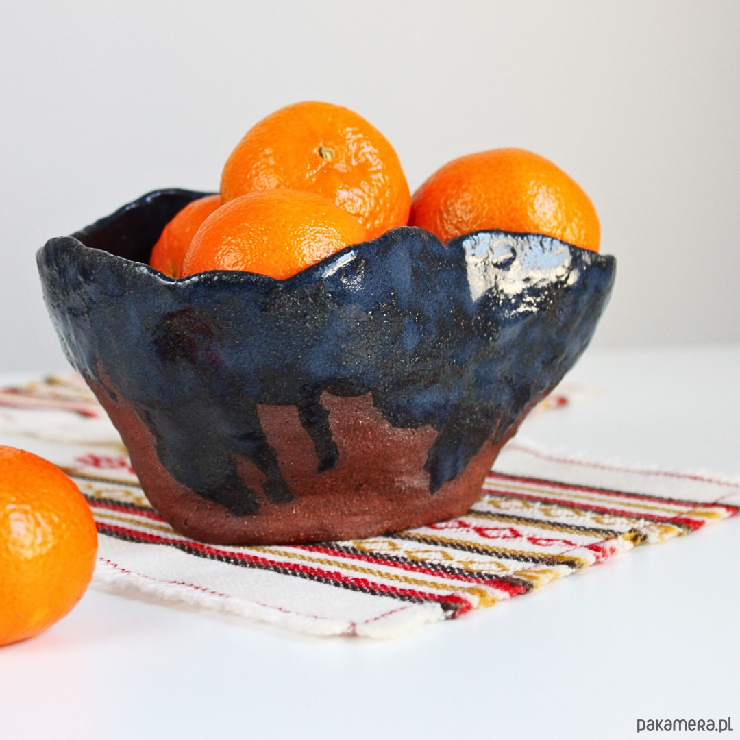 Nieregularna misa np. na owoce wykonana z czerwonej gliny. Ulepiona ręcznie, szkliwiona szkliwem do żywności.