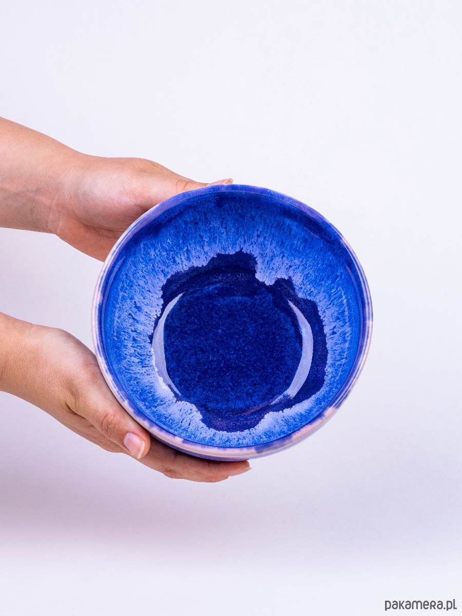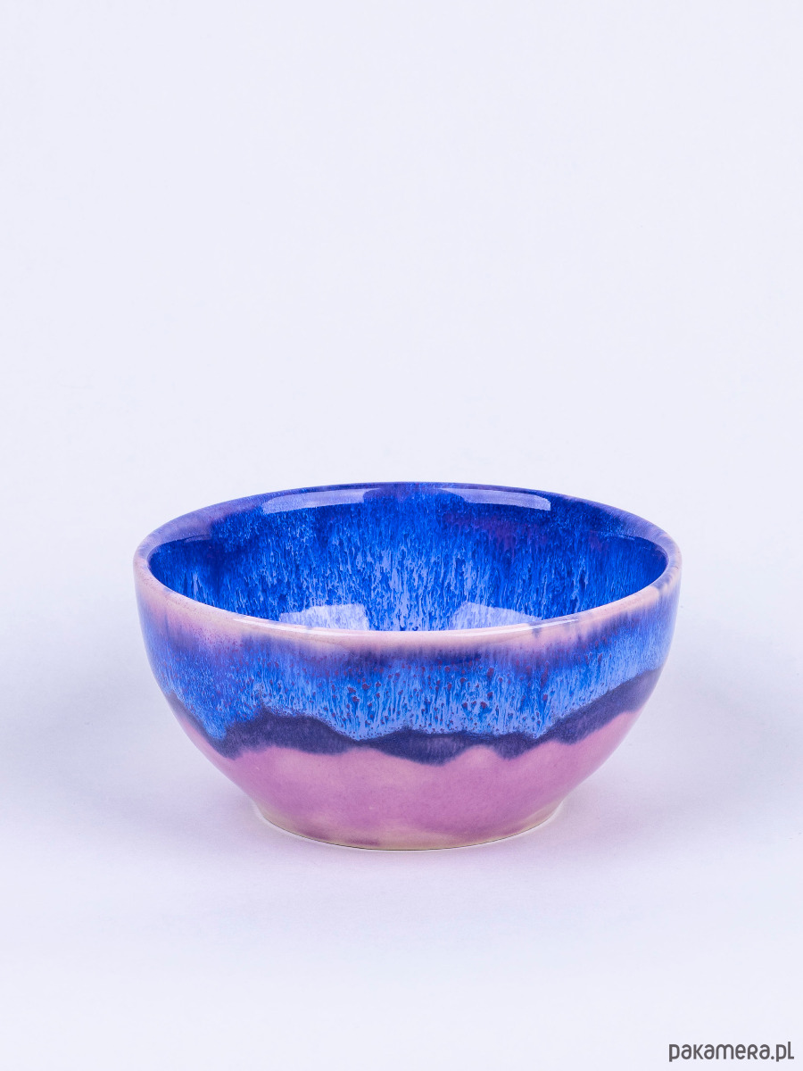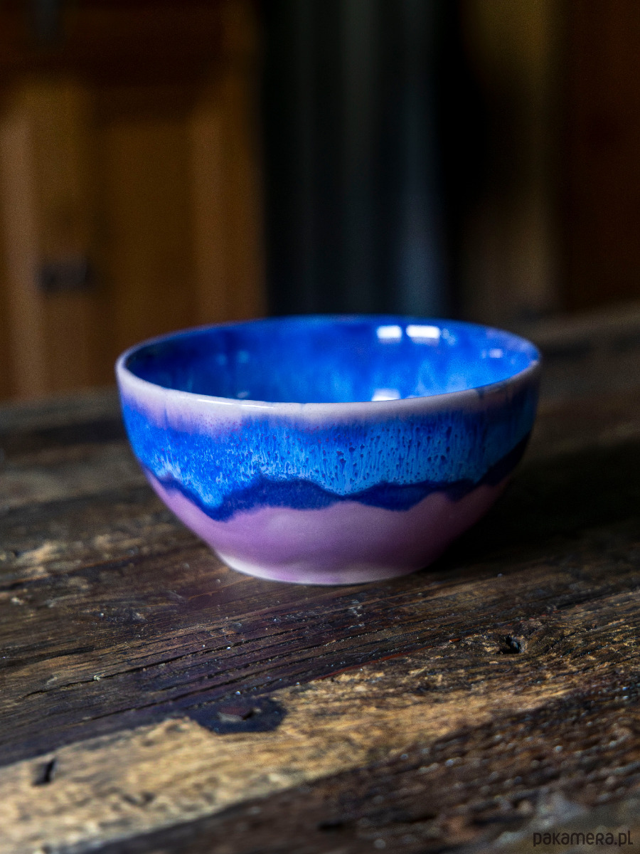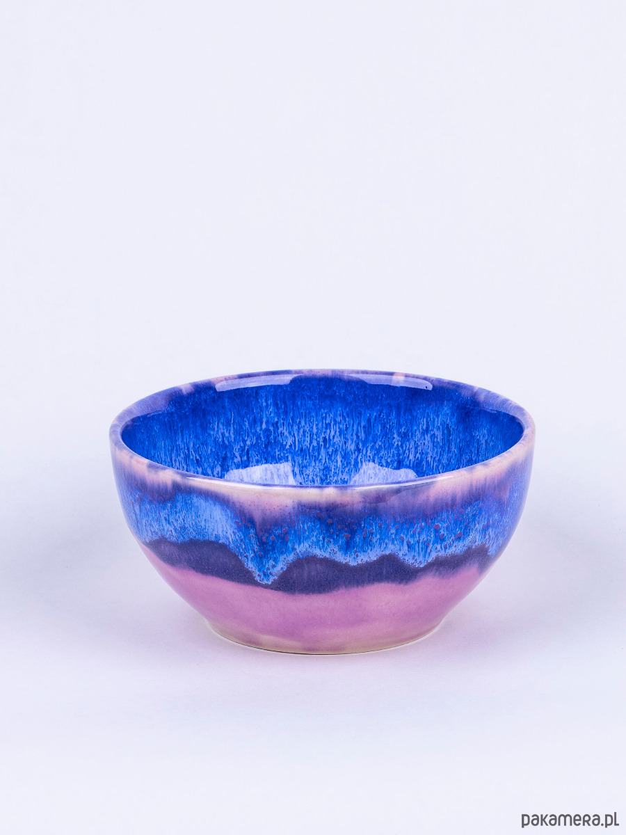 Ta miska to wieczór zamknięty w formie – głęboki fiolet u podstawy przywodzi na myśl pole lawendy tuż przed nocą, podczas gdy z góry spływa ciemny granat jak niebo, które powoli gasi ostatnie światło dnia. Gładkie, błyszczące szkliwo układa się w miękkie przejścia barw, tworząc efekt zachodzącego słońca oglądanego przez szybę.