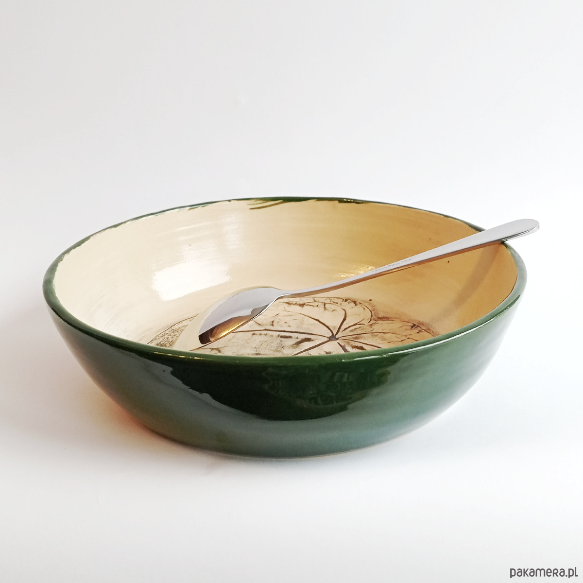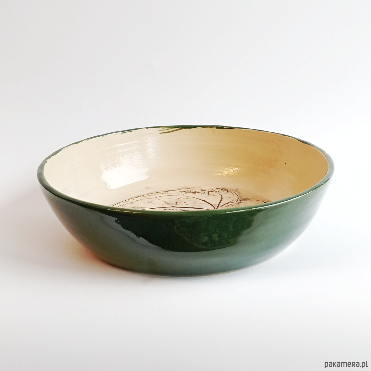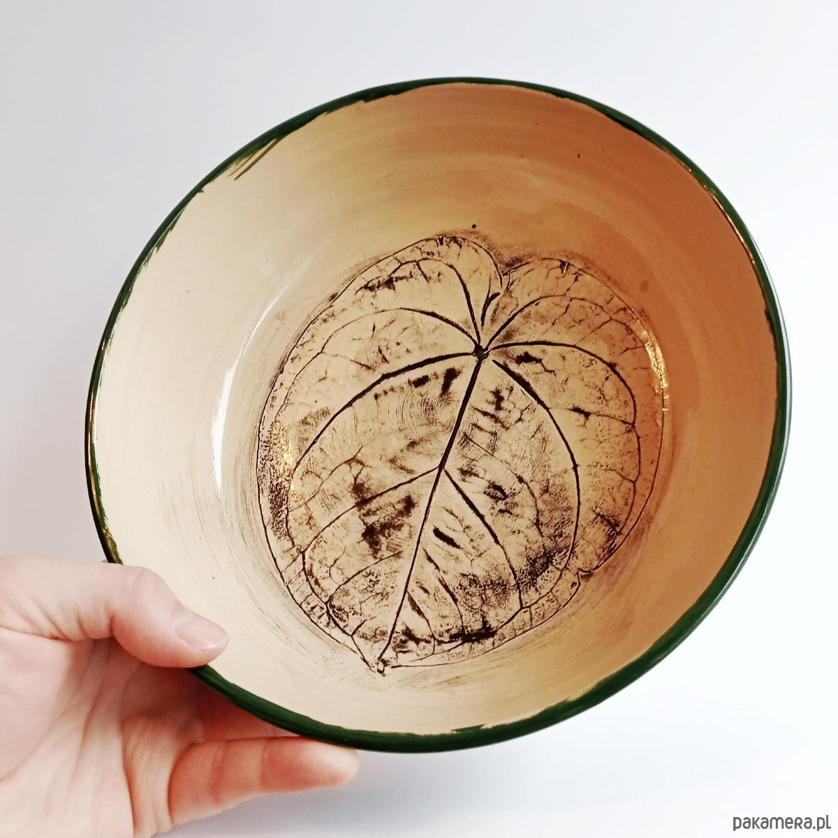 We wnętrzu misko znajduje się odbicie liścia Anturium, podkreślone czarną angobą i poszkliwione szkliwem transparentnym.