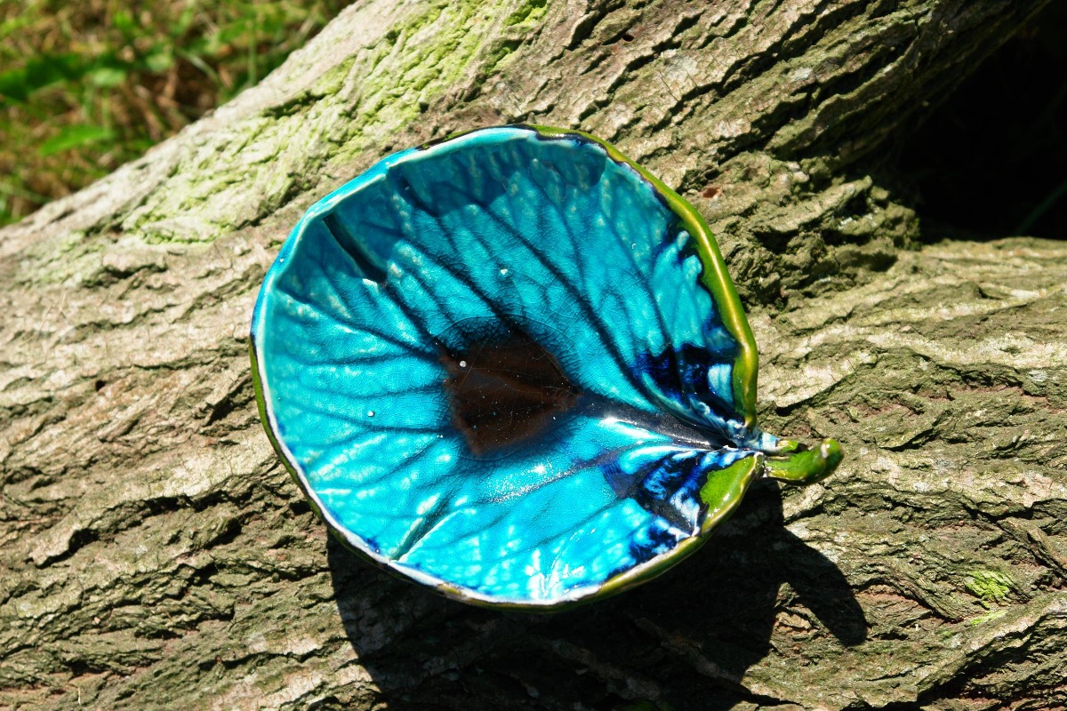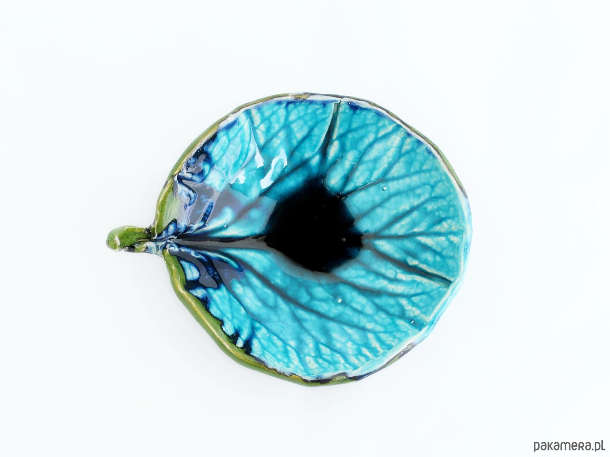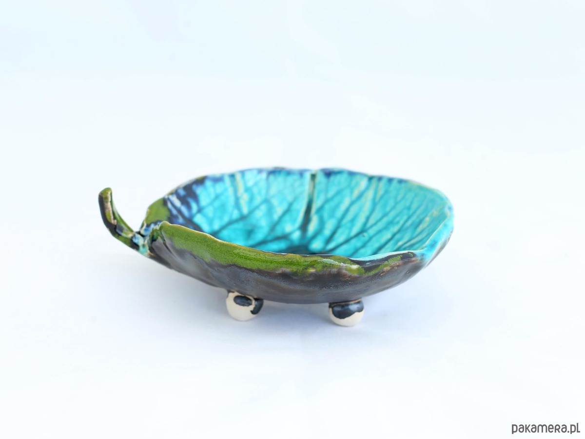 Piękna, delikatna miseczka w kształcie liścia, na trzech okrągłych nóżkach. Miseczka w kolorach turkusowo-zielonym. Idealna do przechowywania biżuterii lub słodkości. :-) Jej wymiary: 11 x 14 cm cm, wys.- 4 cm