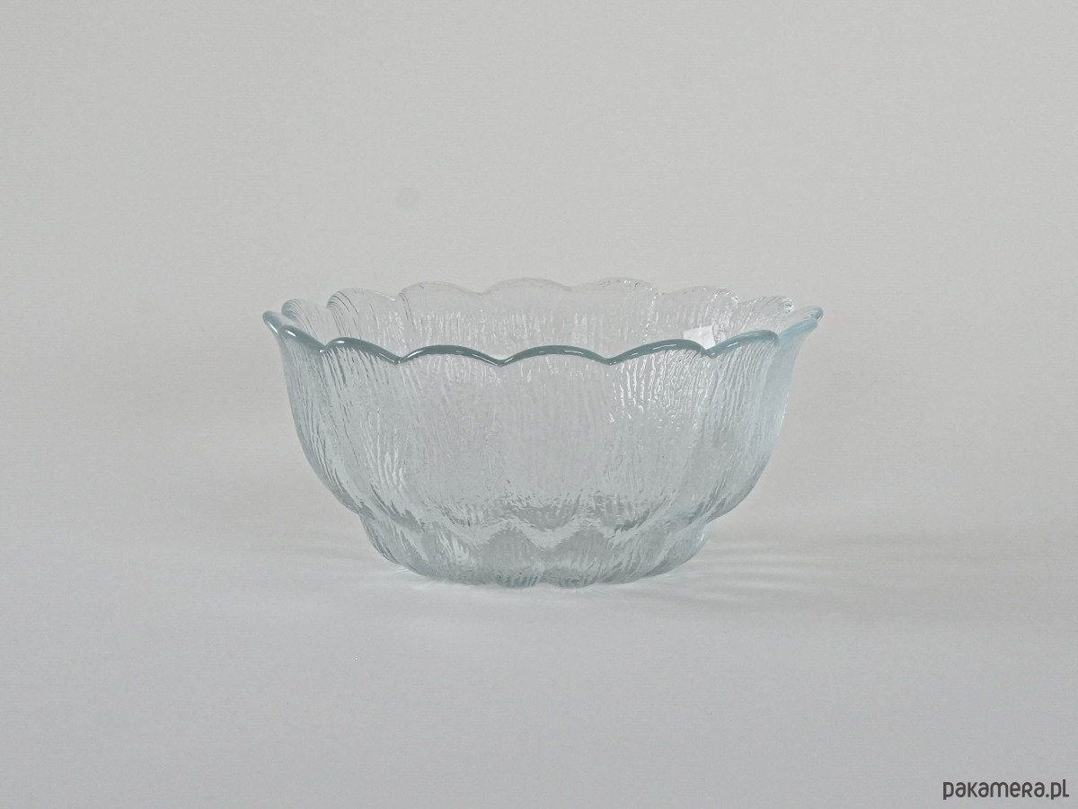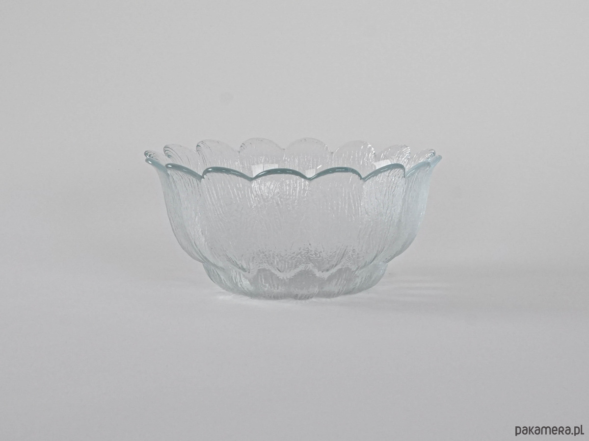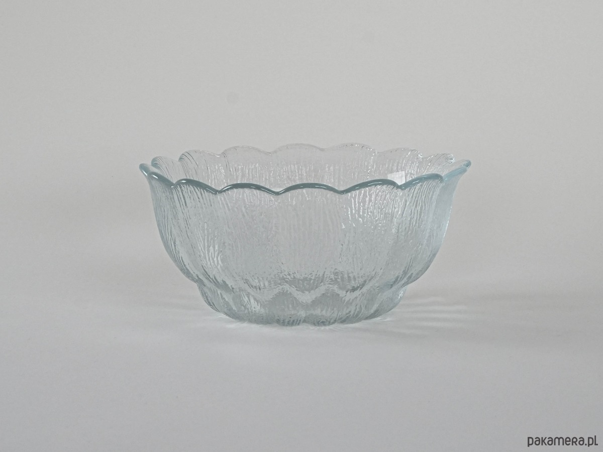 Wykonana z przejrzystego szkła o dekoracyjnej, tłoczonej fakturze przypominającej strukturę drewna lub kory, z falującą krawędzią układającą się w subtelny, kwiatowy kształt. Elegancka i funkcjonalna – świetnie sprawdzi się jako misa na owoce, sałatki, słodycze czy po prostu jako dekoracyjny akcent w nowoczesnym i retro wnętrzu.