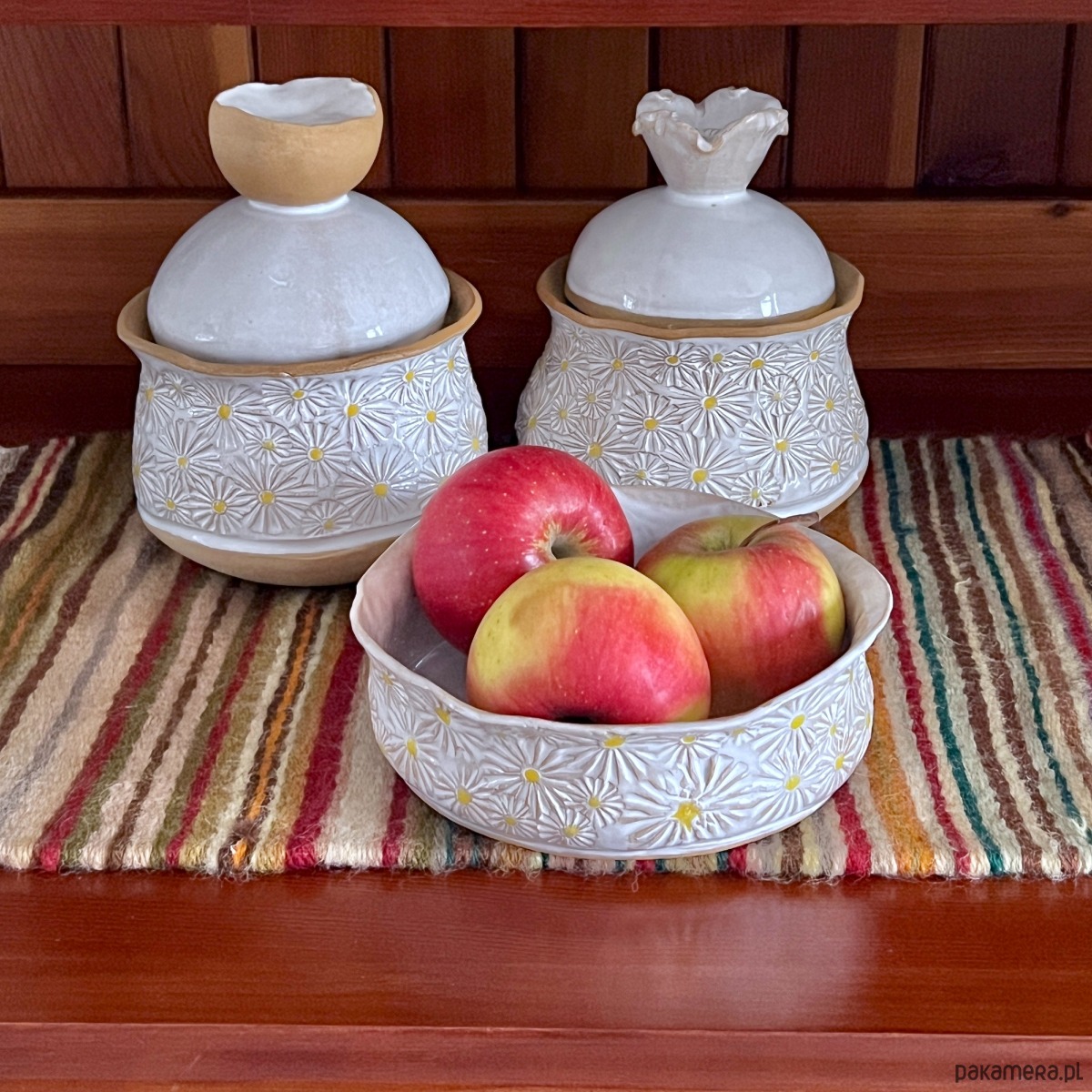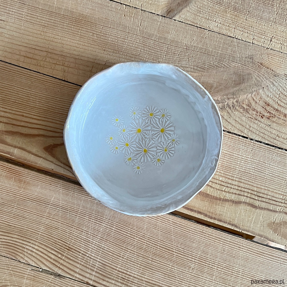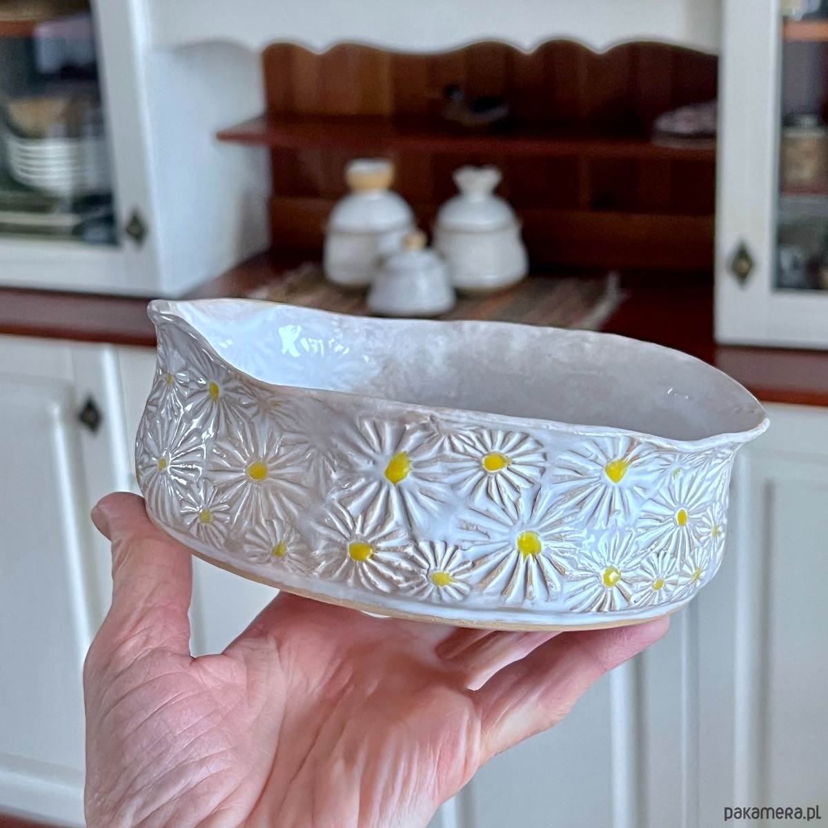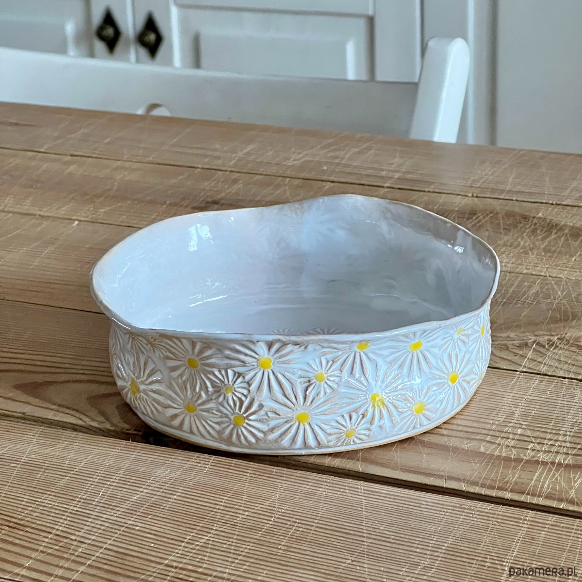 Biała miska ceramiczna z odciśniętym kwiatowym motywem stokrotek. Jest idealna do owoców, serwowania zupy, owsianki, sałatek i innych przystawek lub jako pojemnik na chipsy i cukierki.