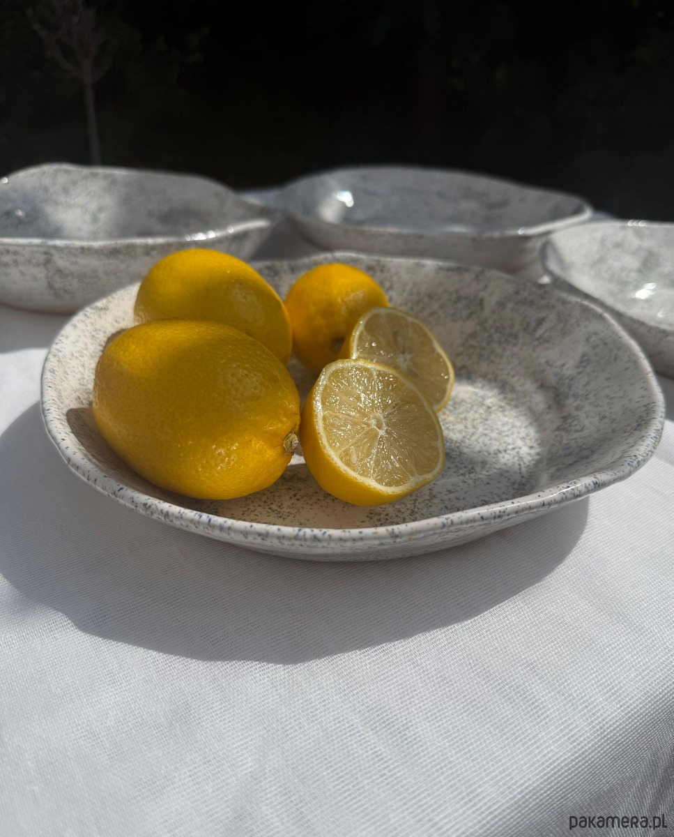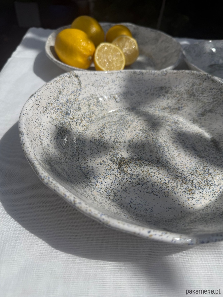 Piękna misa, wykonana z jasnej gliny, pokryta szkliwem białym w piegi.