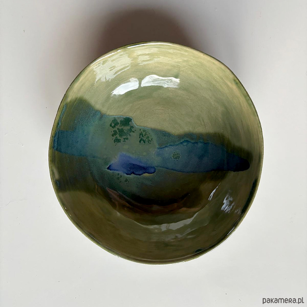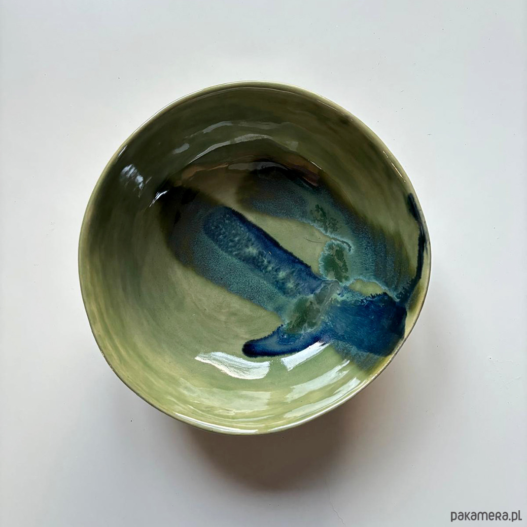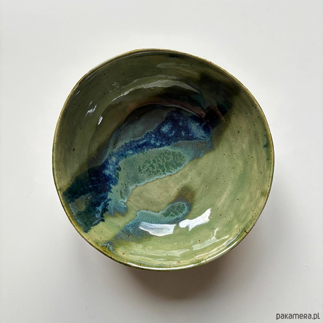Miski, ulepione z jasnej gliny pokryte zielonym szkliwem. Szerokie, owalne, wygodne.