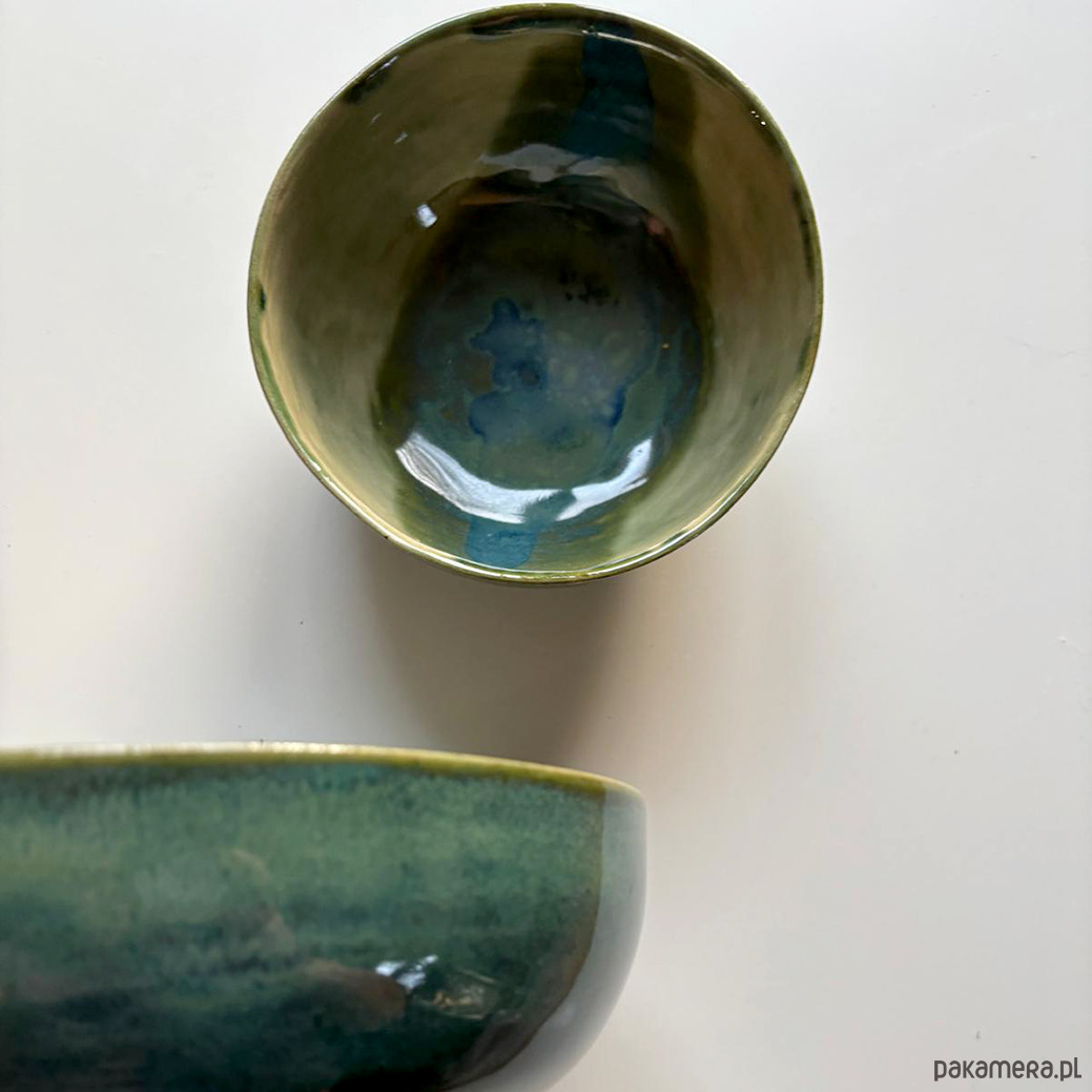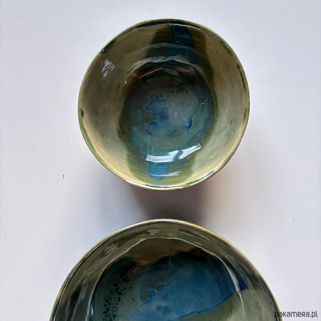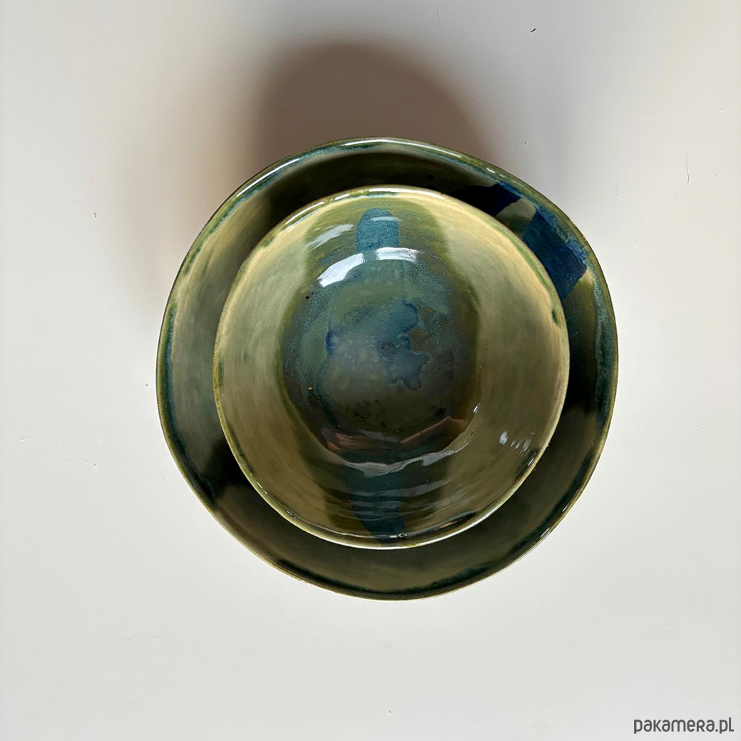 Zestaw dwóch misek, ulepiony z jasnej gliny pokryte zielonym szkliwem. Szerokie, owalne, wygodne.