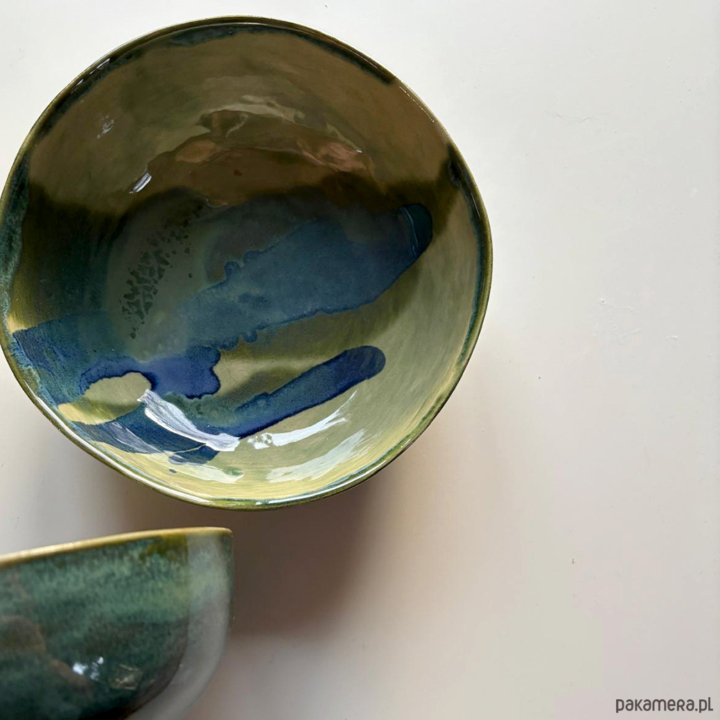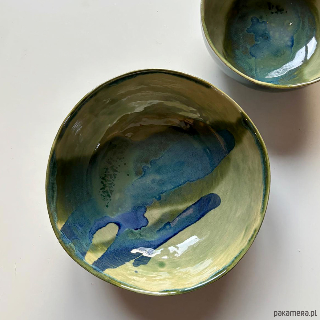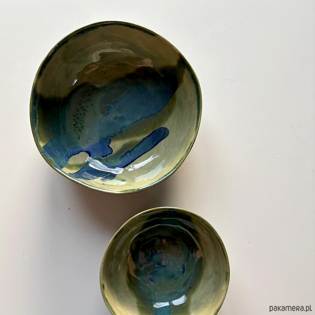 Zestaw dwóch misek, ulepiony z jasnej gliny pokryte zielonym szkliwem. Szerokie, owalne, wygodne.