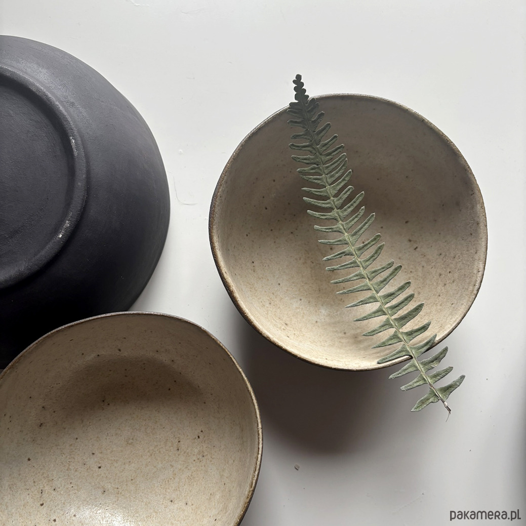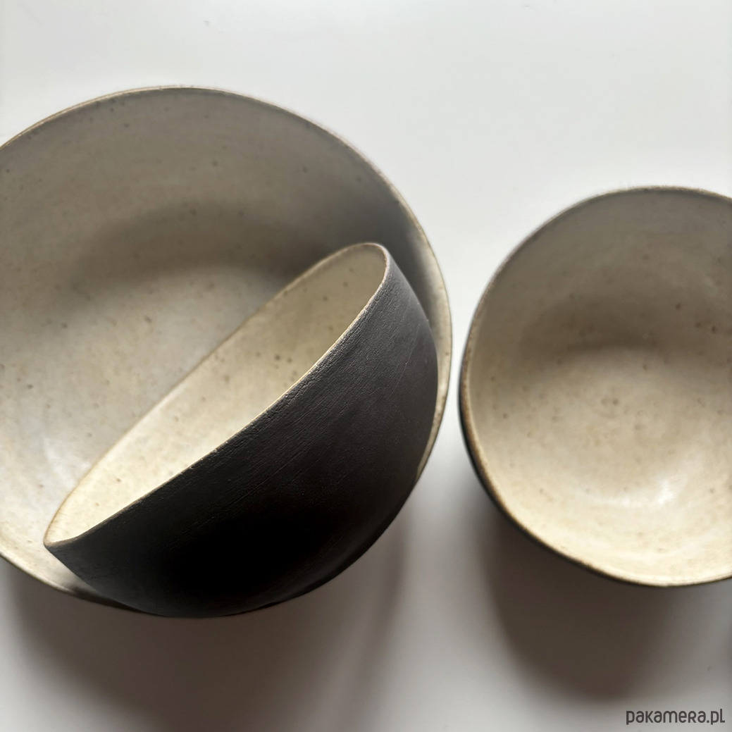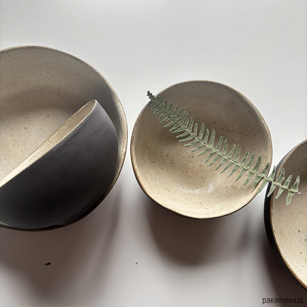 Miski, ulepione z ciemnej gliny pokryte kremowym szkliwem w środku. Z zewnątrz miska w kolorze ciemnobrązowym.