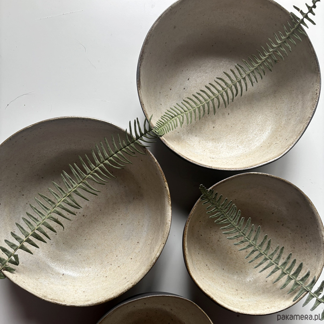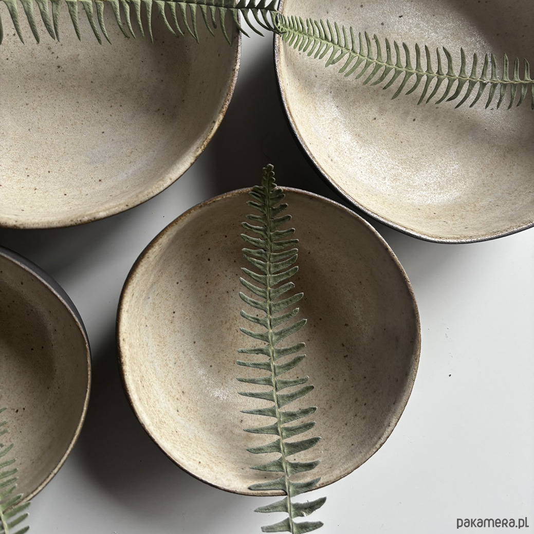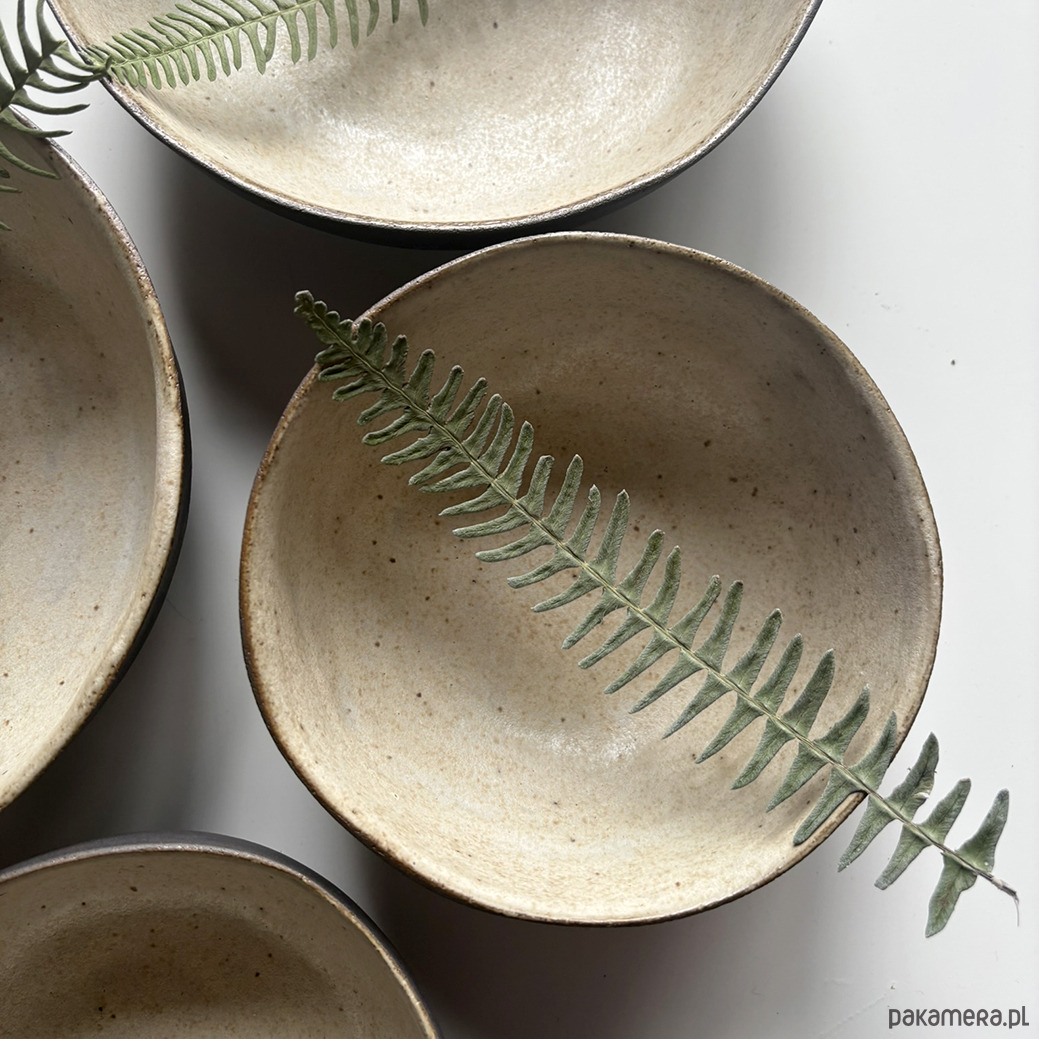 Miski, ulepione z ciemnej gliny pokryte kremowym szkliwem w środku. Z zewnątrz miska w kolorze ciemnobrązowym. Szerokie, owalne, wygodne.