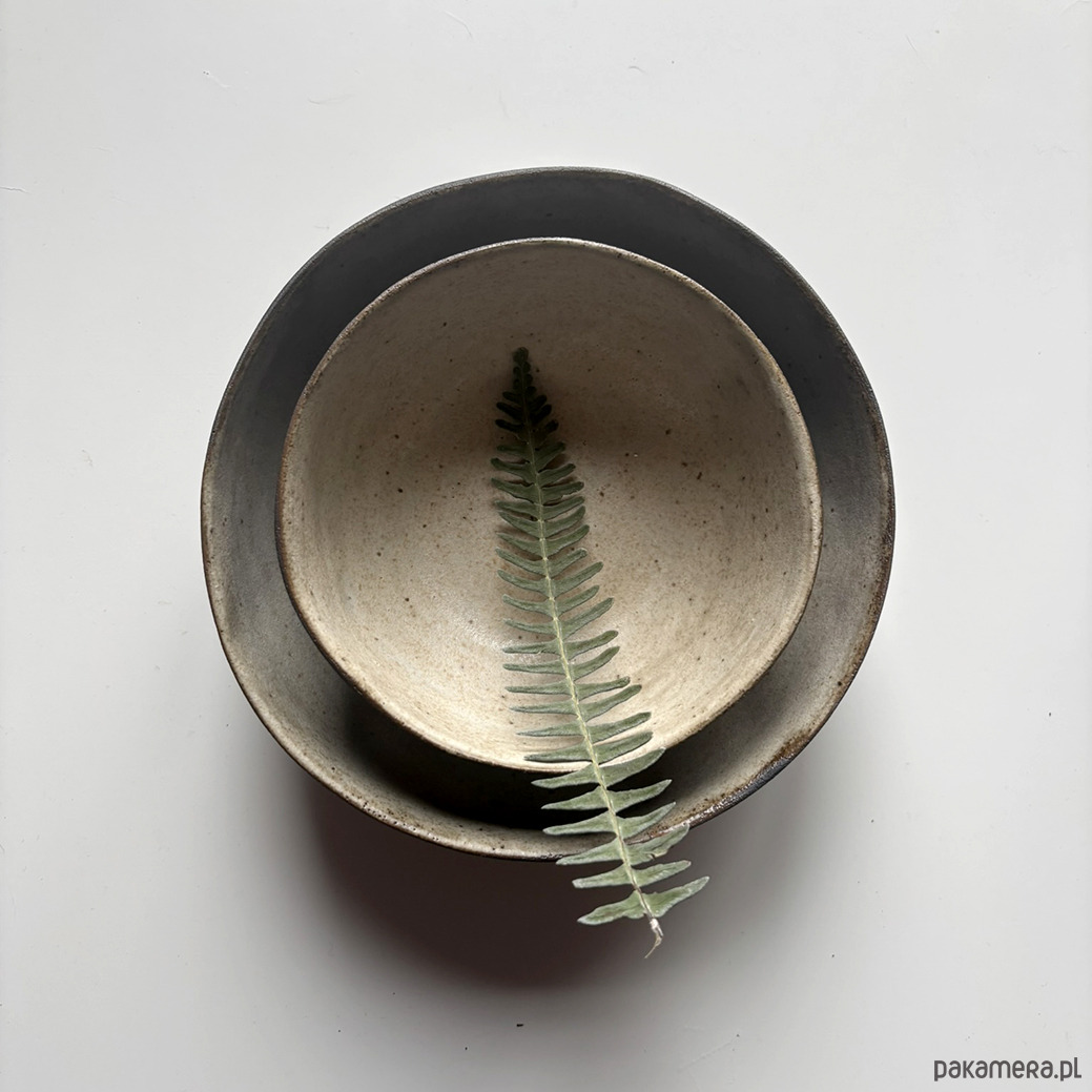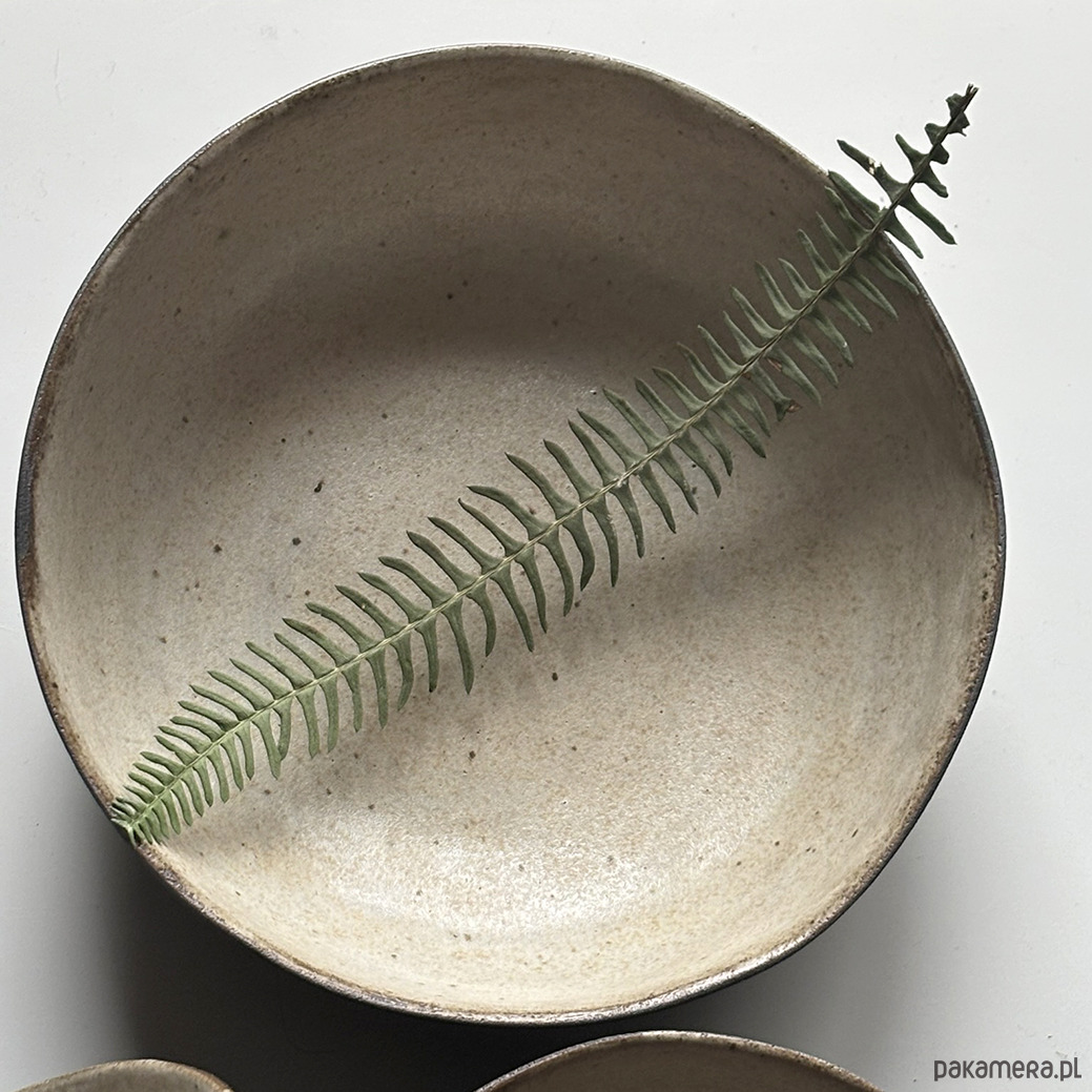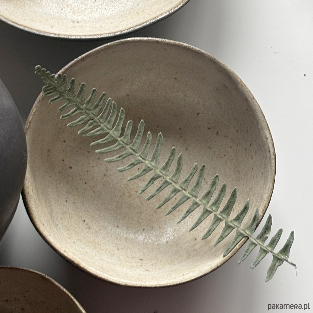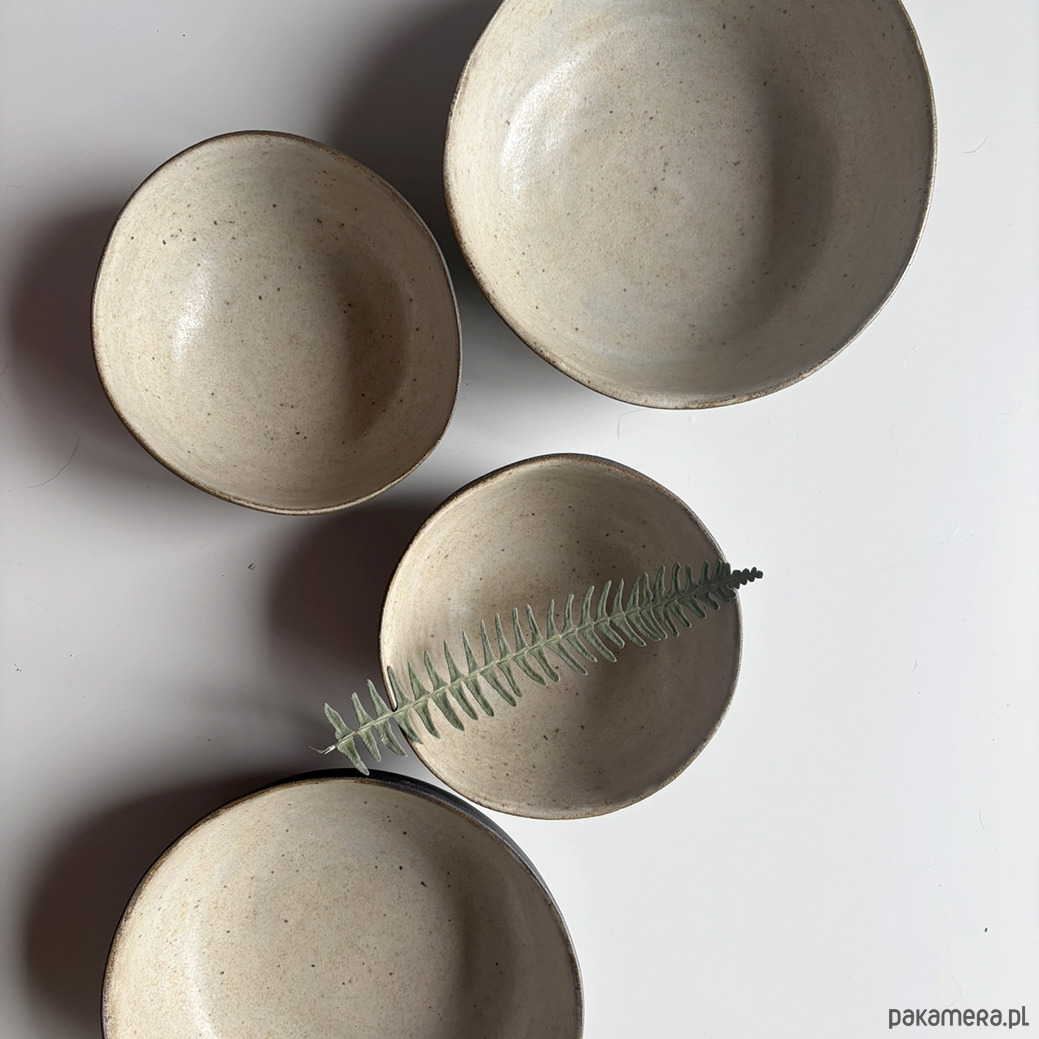 Miski, ulepione z ciemnej gliny pokryte kremowym szkliwem w środku. Z zewnątrz miska w kolorze ciemnobrązowym. Szerokie, owalne, wygodne.