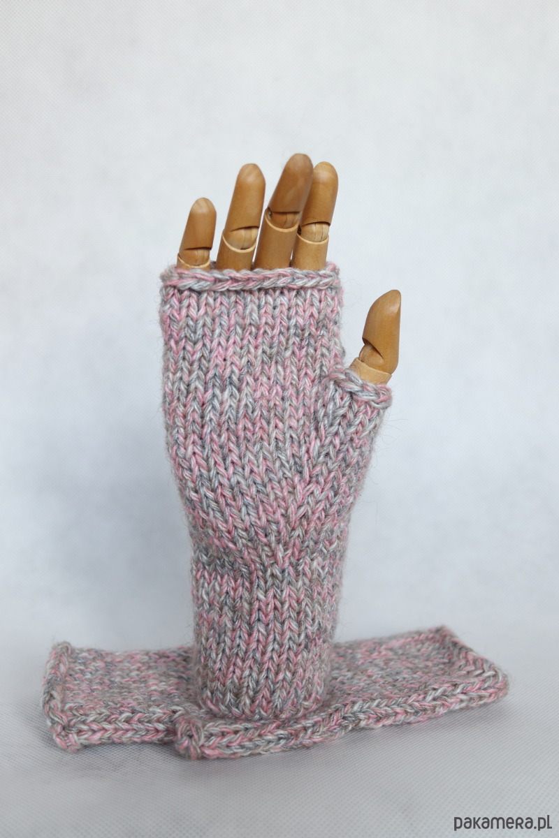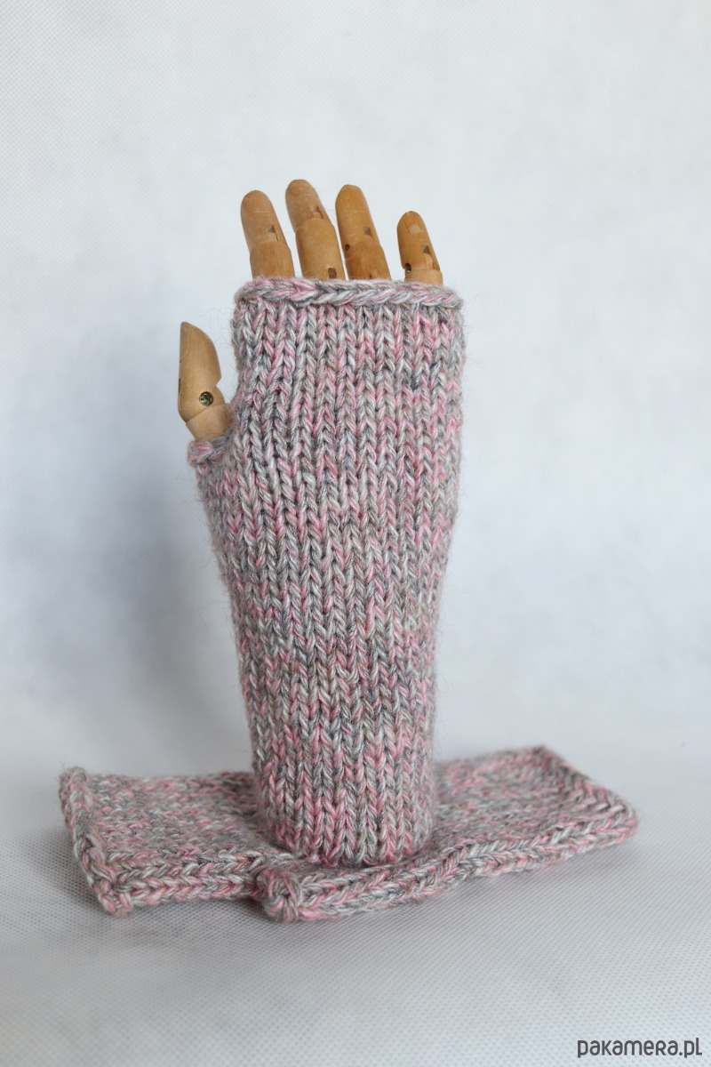 Cieplutkie bezszwowe mitenki zrobione na drutach z czterech nitek włóczki w kolorach: szary, beżowy, ecru i jasnoróżowy.