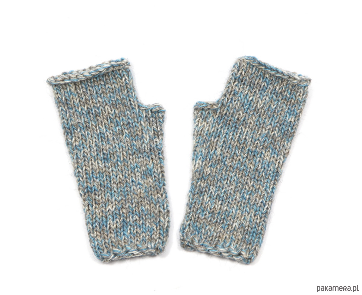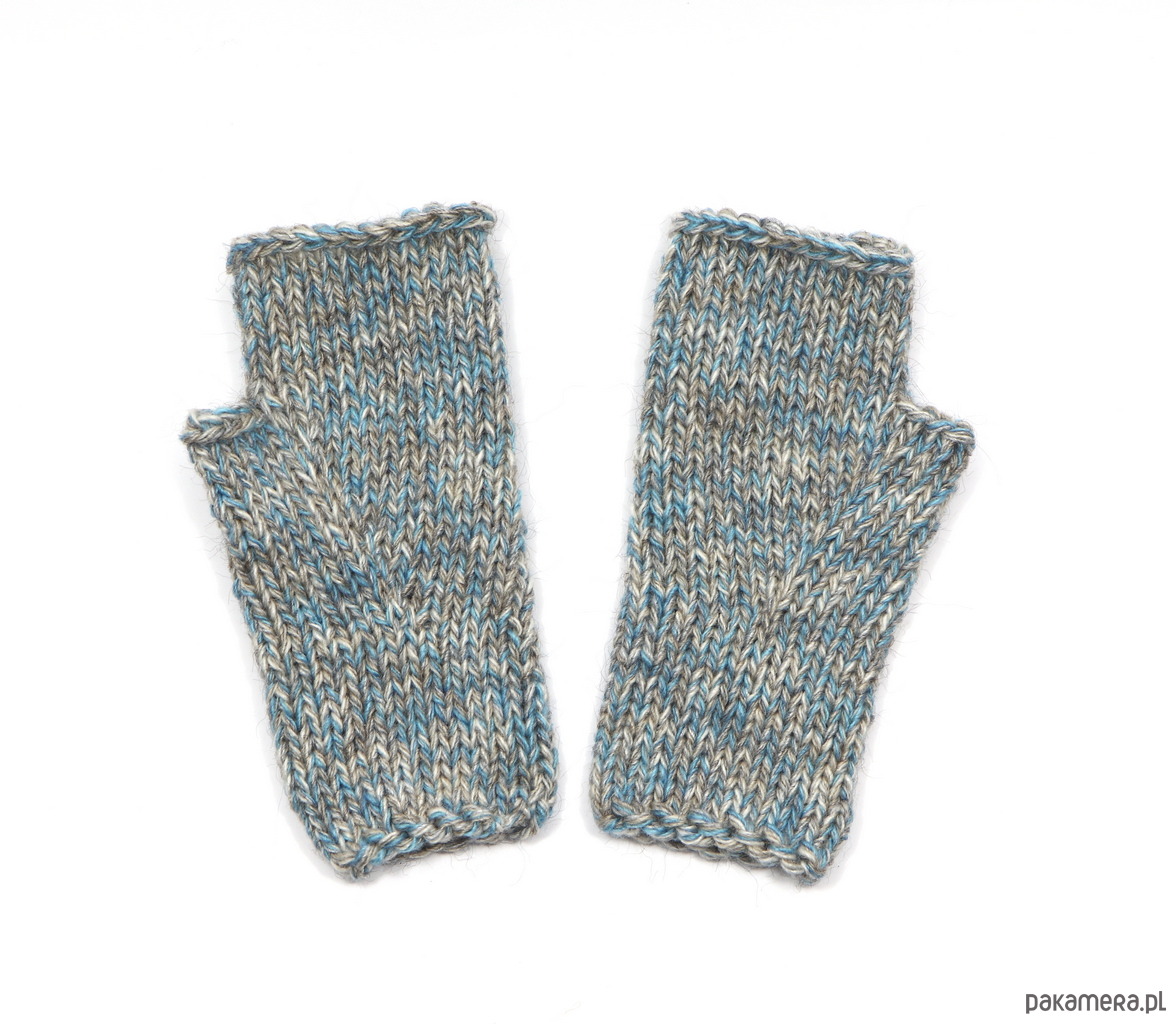 Cieplutkie bezszwowe mitenki zrobione na drutach z czterech nitek włóczki w kolorach: szary, beżowy, ecru i turkusowym.