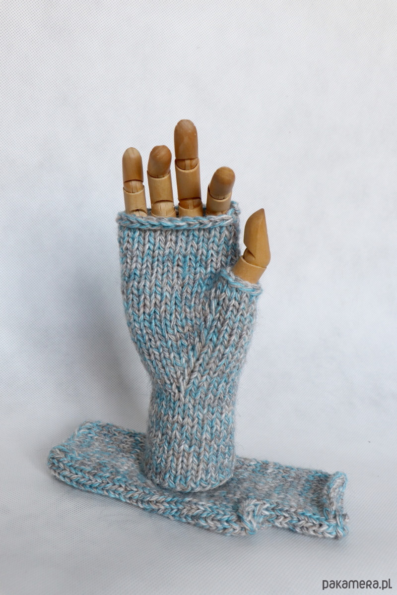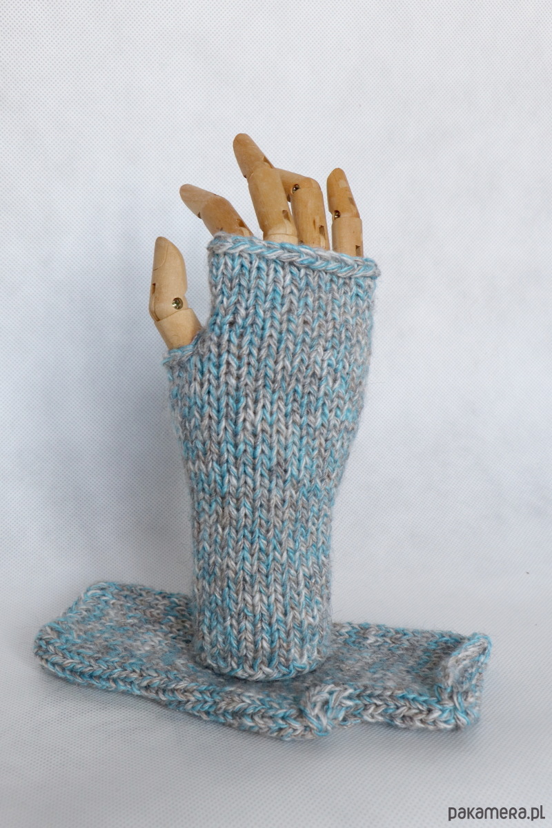 Cieplutkie bezszwowe mitenki zrobione na drutach z czterech nitek włóczki w kolorach: szary, beżowy, ecru i turkusowym.
