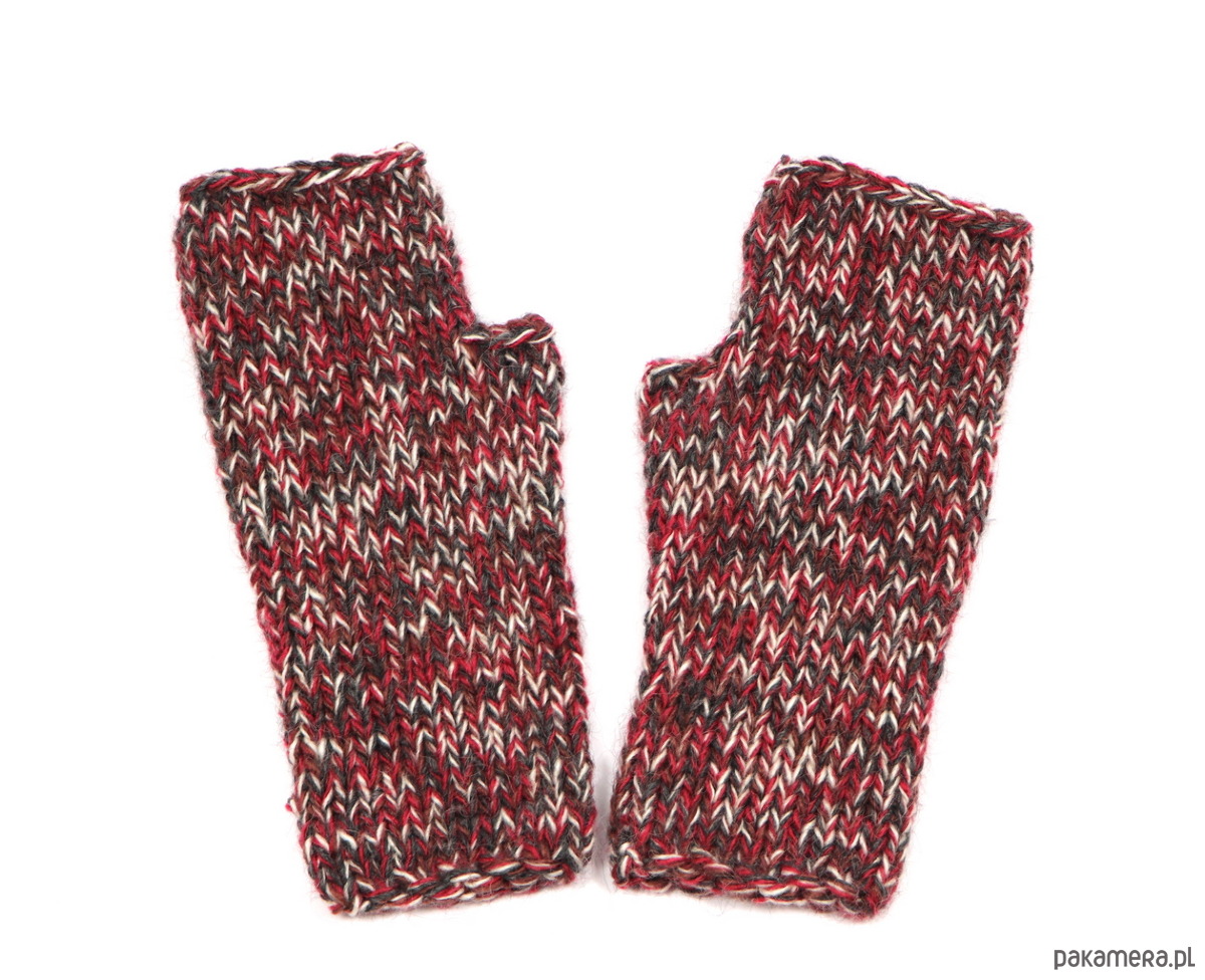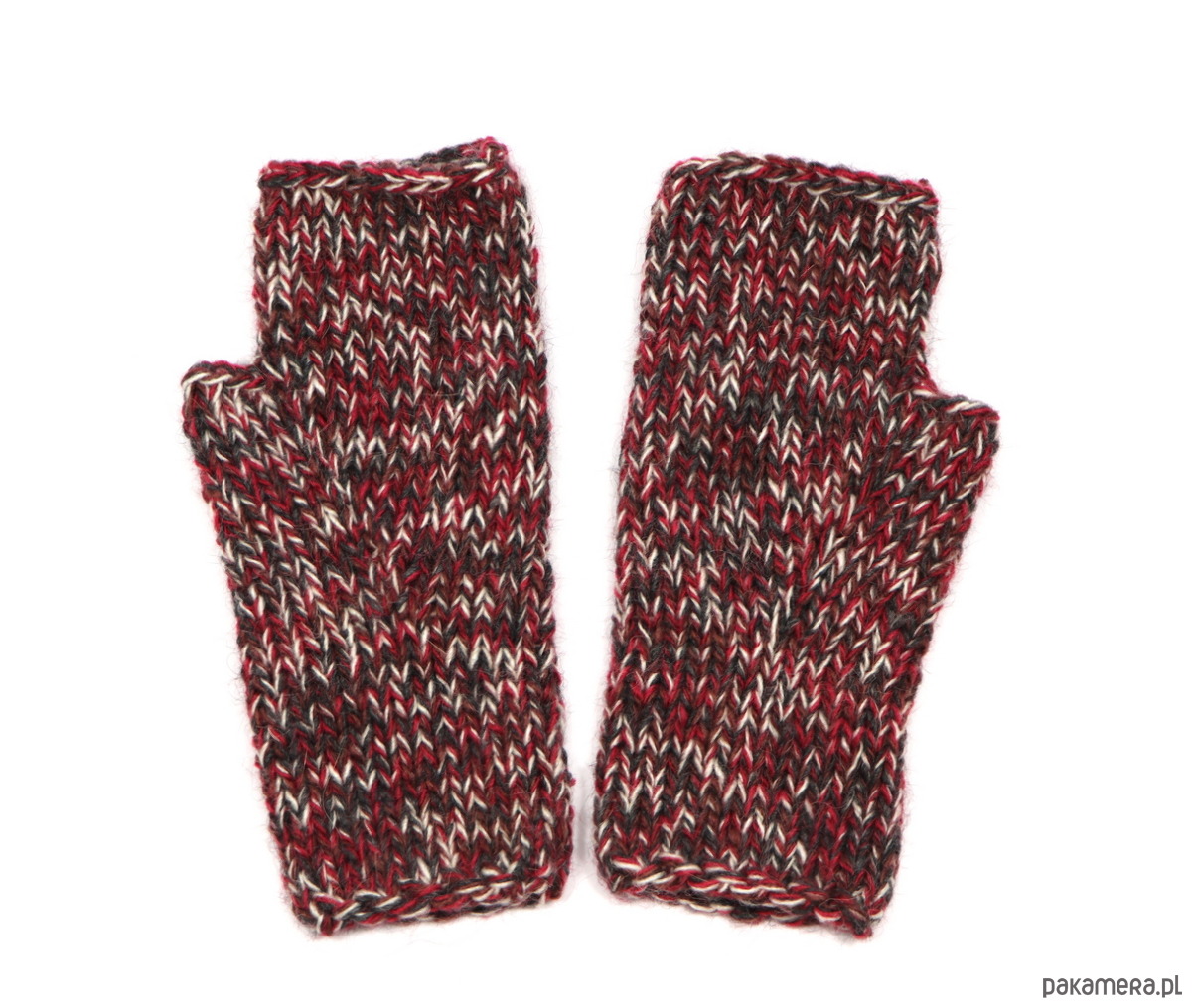 Cieplutkie bezszwowe mitenki zrobione na drutach z czterech nitek włóczki w kolorach: ecru, bordowy, grafitowy i ciemnobrązowy.