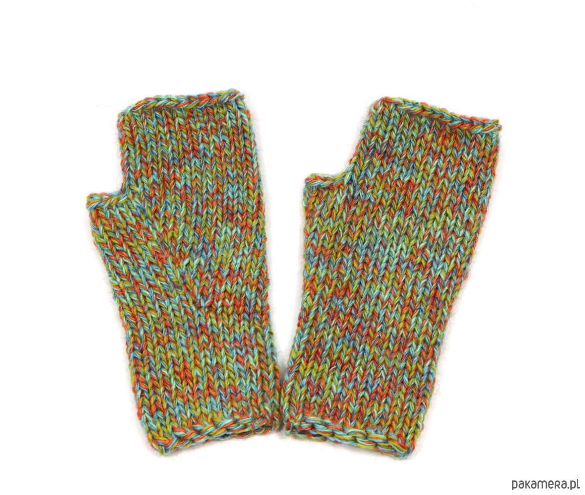 Cieplutkie bezszwowe mitenki zrobione na drutach z czterech nitek włóczki w kolorach: cegła. turkus, oliwka i mięta.