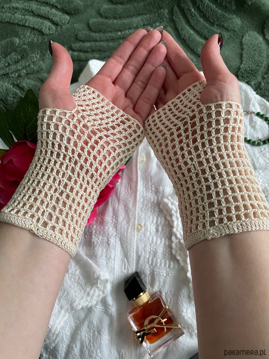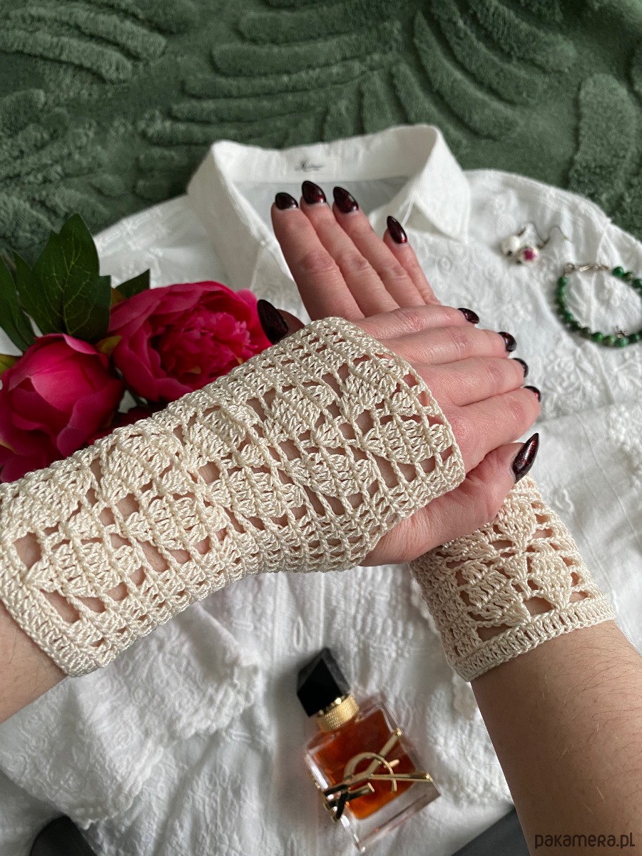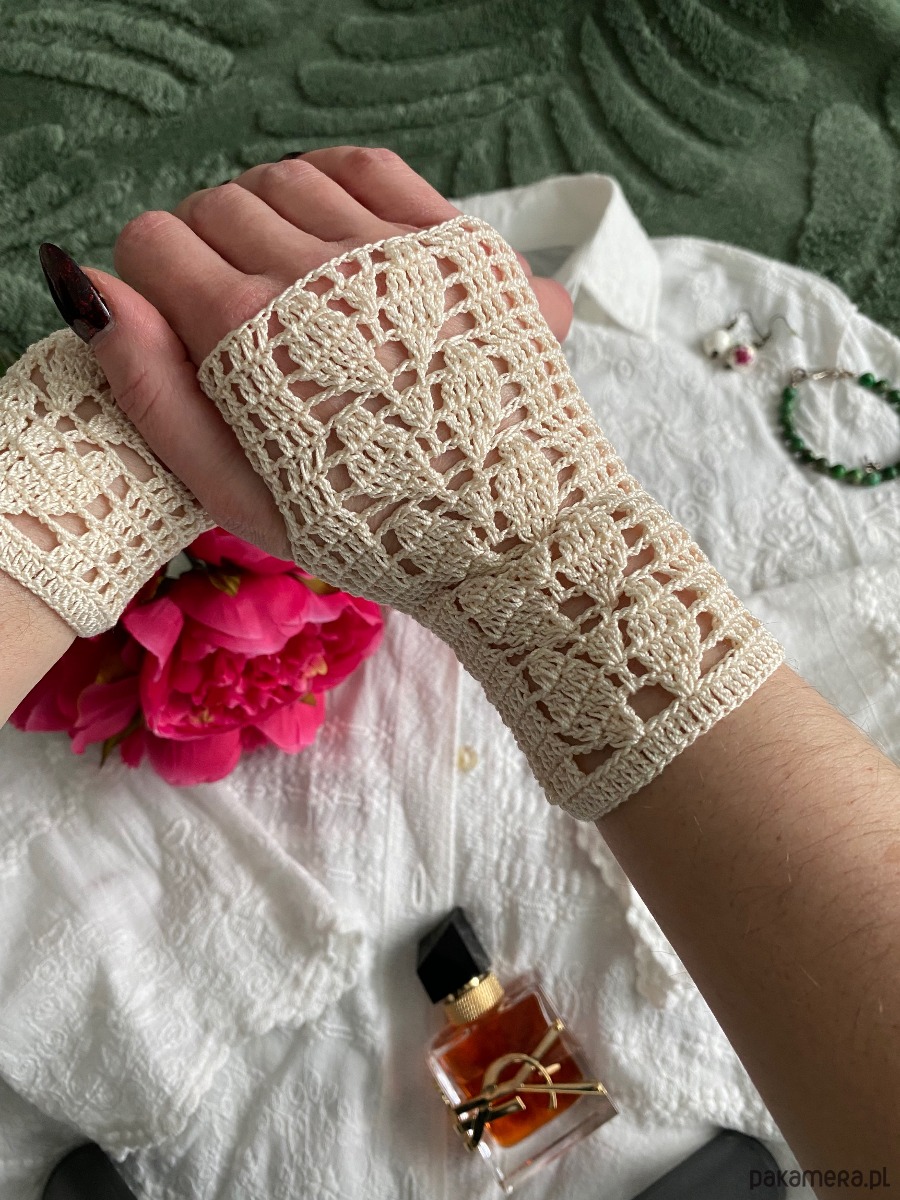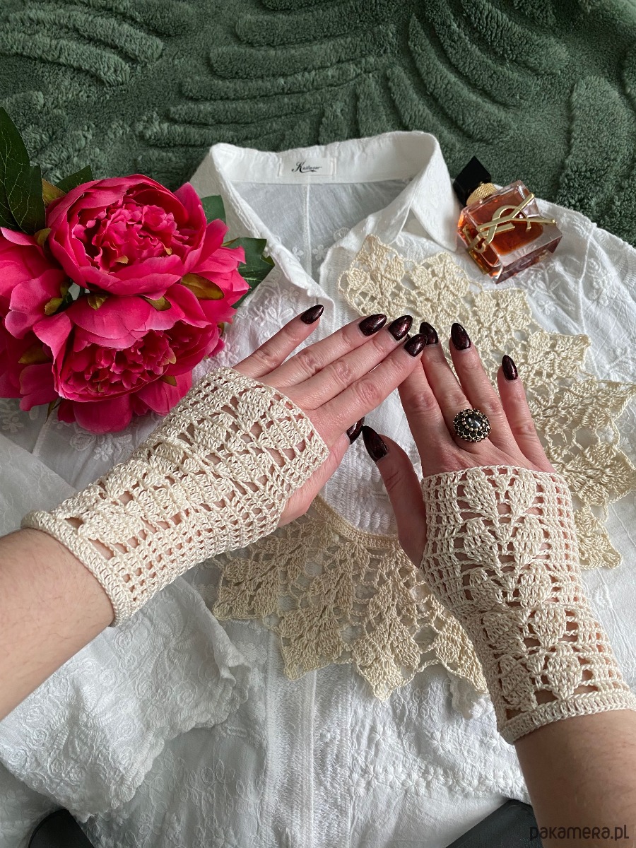 ✨prześliczne kremowe koronkowe mitenki🌿motyw roślinny wzoru, mogą tworzyć komplet z naszyjnikiem z innego ogłoszenia🥰
