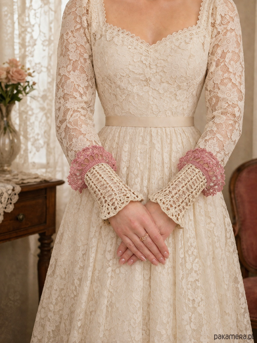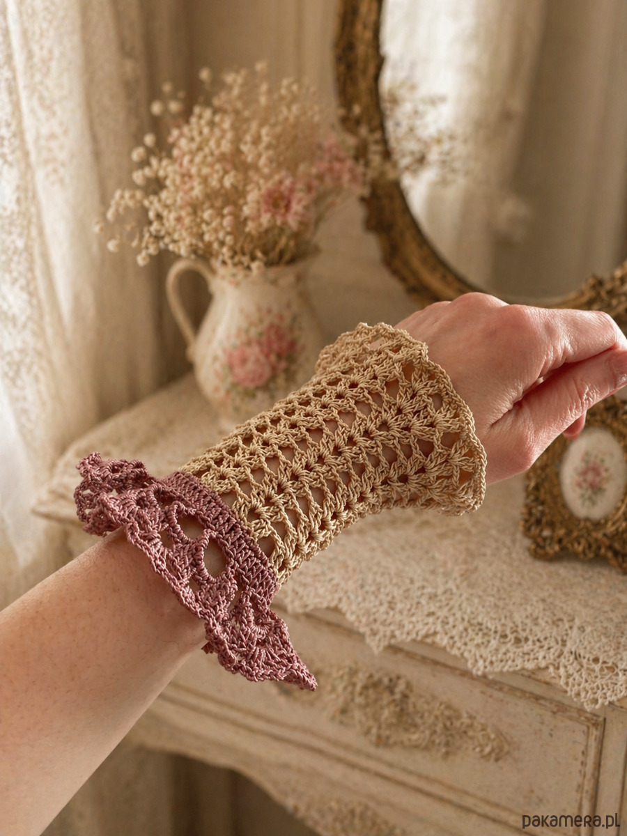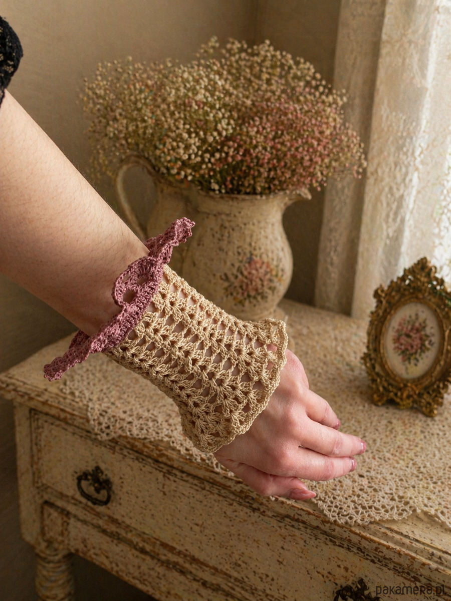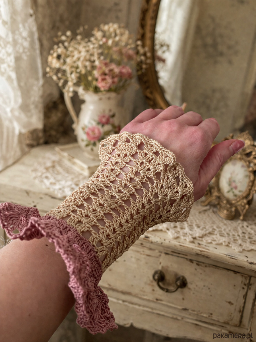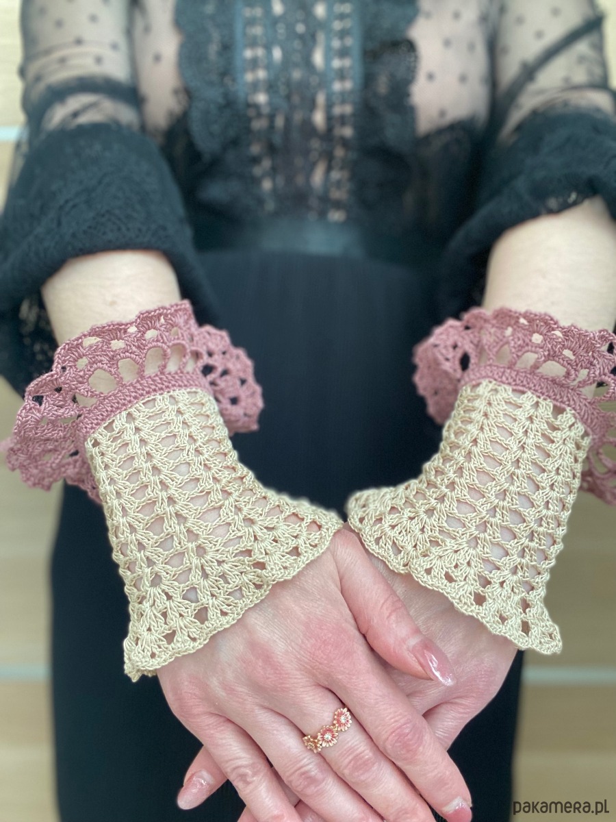Mitenki koronkowe retro vintage styl kremowo różowe