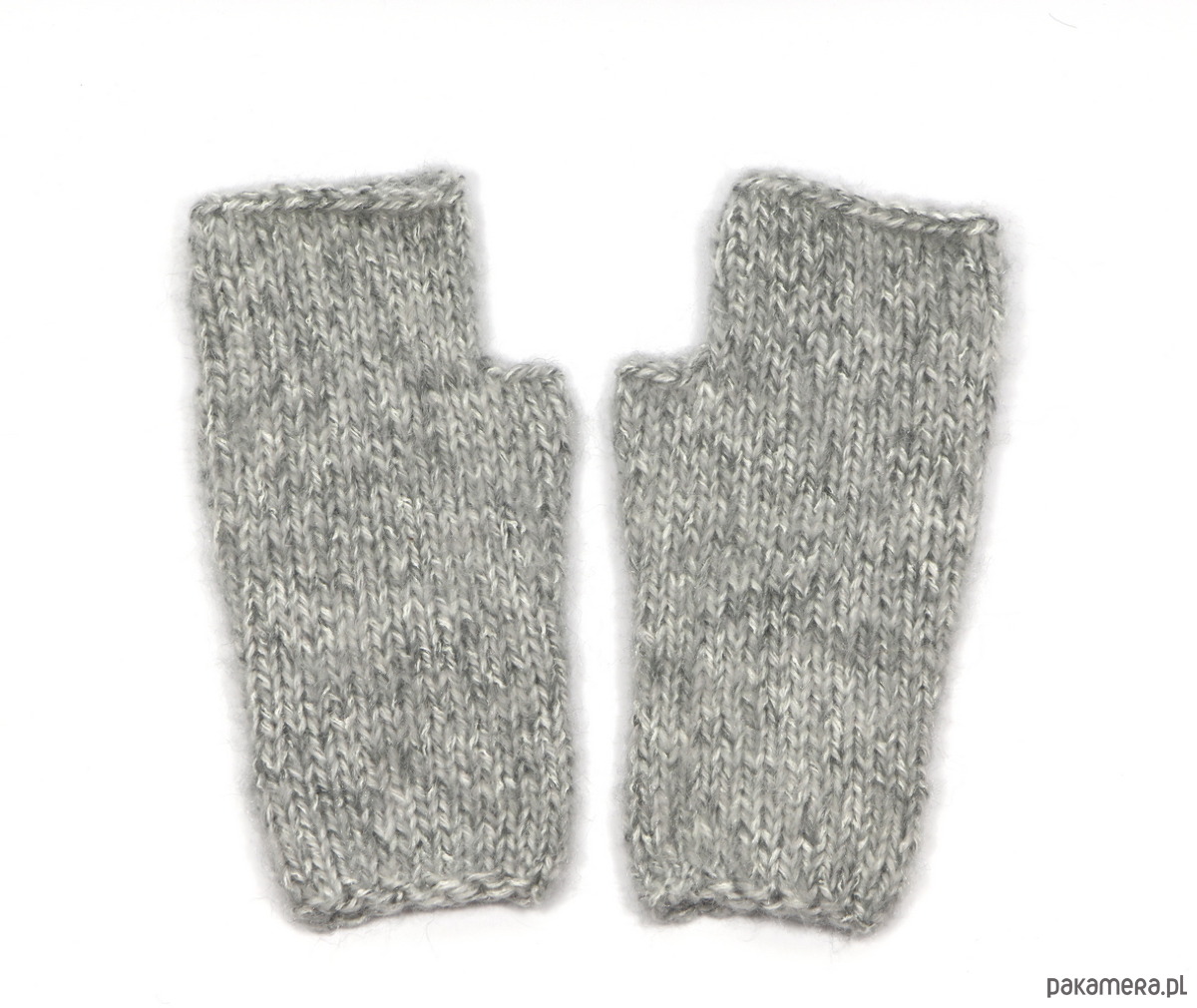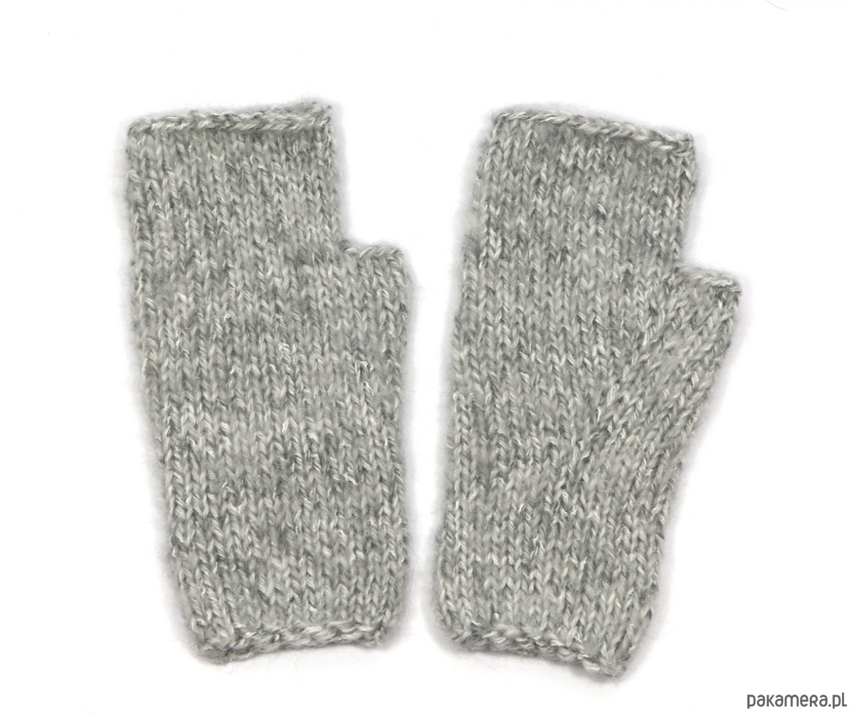 Cieplutkie bezszwowe mitenki zrobione na drutach z melanżowej włóczki w tonacji szaro-srebrnej.