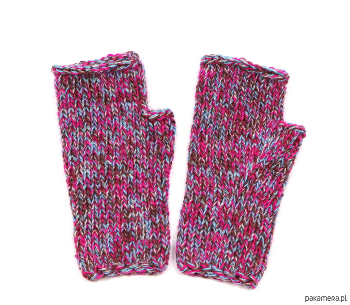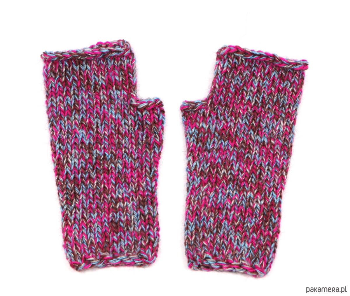Cieplutkie bezszwowe mitenki zrobione na drutach z czterech nitek włóczki w kolorach: szary, amarantowy, brązowy i turkusowy.