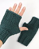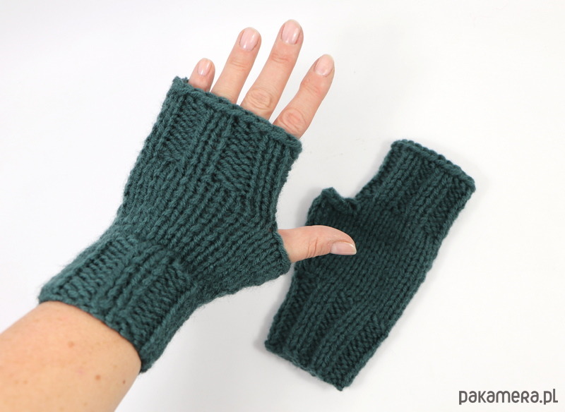 Cieplutkie mitenki z jednym palcem zrobione na drutach z akrylowej włóczki w kolorze butelkowej zieleni.
