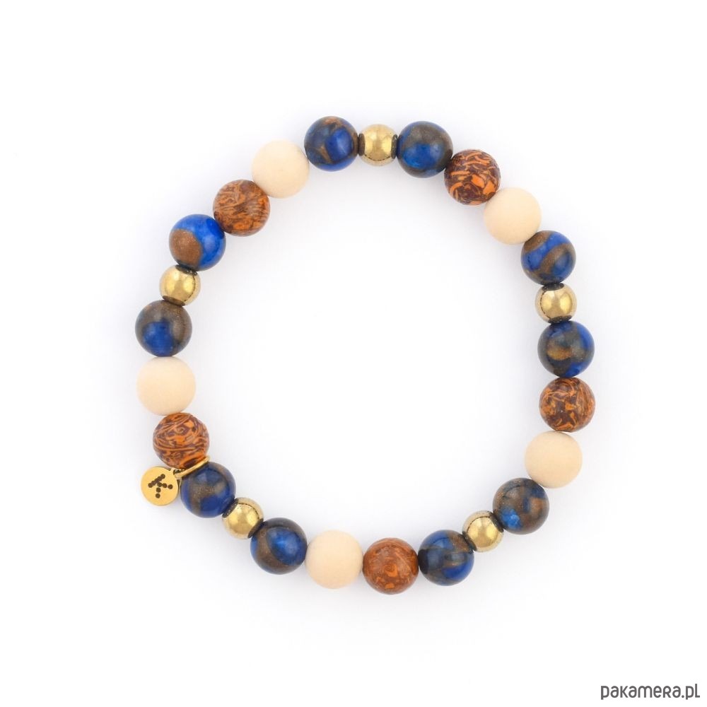 Bransoletka z naturalnego Kamienia Rzecznego, błyszczącego Jaspisu Kalahari oraz tajemniczej granatowej kulki z domieszką Piasku Pustyni w 8 mm kulce. Jako element ozdobny proponuję Hematyty (4mm) w kolorze złotym.