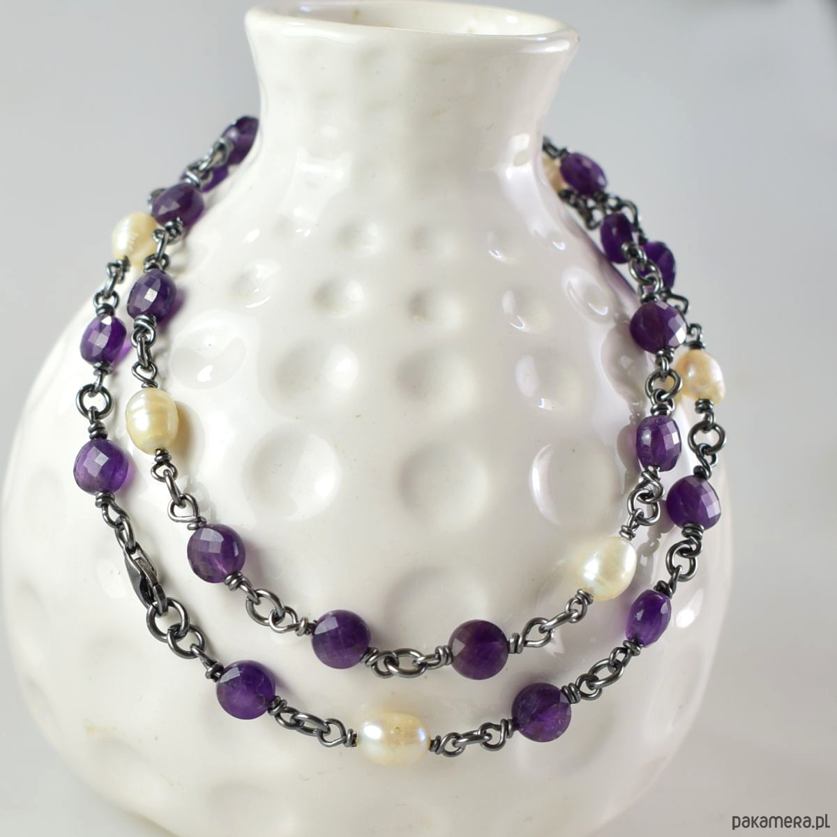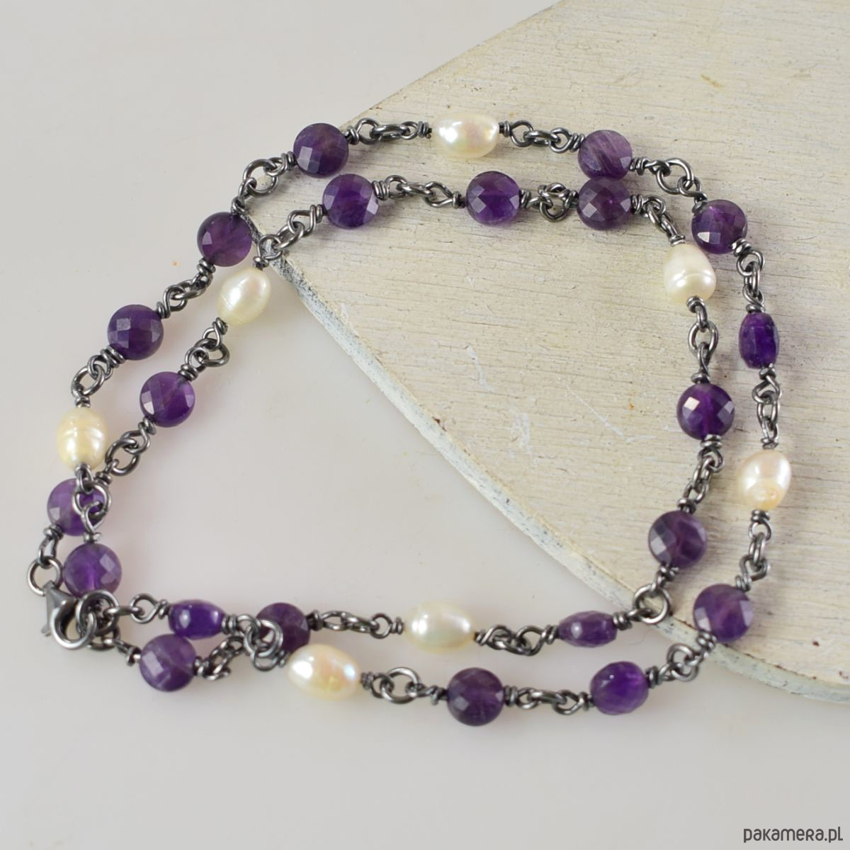 Naszyjnik wykonany w całości ze srebra (próba 925) z ametystem i perłami. Biżuteria została zoksydowana (przyciemniona) i wypolerowana. Długość całkowita 48 cm. Biżuteria zostanie ozdobnie zapakowana.