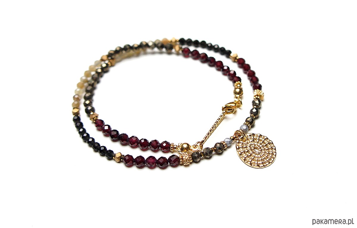 Krótki, delikatny naszyjnik wykonany w całości ze stali szlachetnej pozłacanej oraz naturalnych, szlachetnych kamieni - fasetowane granaty [4mm], kwarc fasetowany [3,5mm], piryt fasetowany [3,5mm], agaty fasetowane [3,5mm], onyks fasetowany [3mm], hematyt fasetowany, platerowany [2,5mm], przekładek z hematytu [4 x 2mm oraz 1mm]. Naszyjnik o długości ok. 40,5cm. Biżuteria ozdobnie zapakowana.