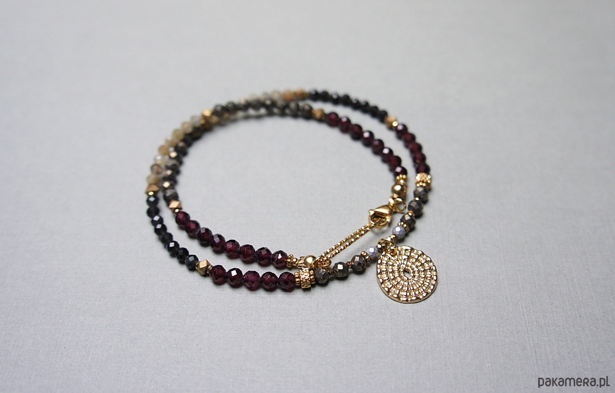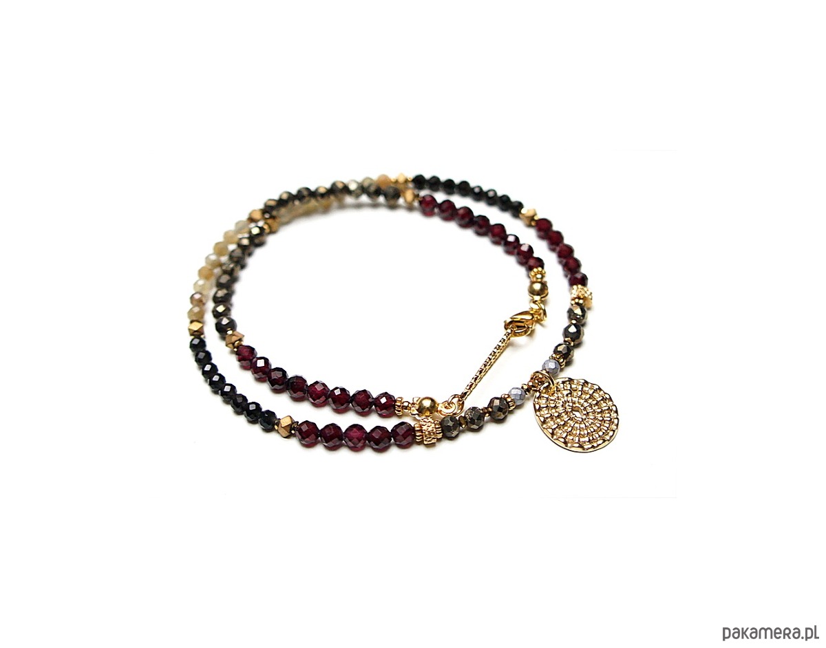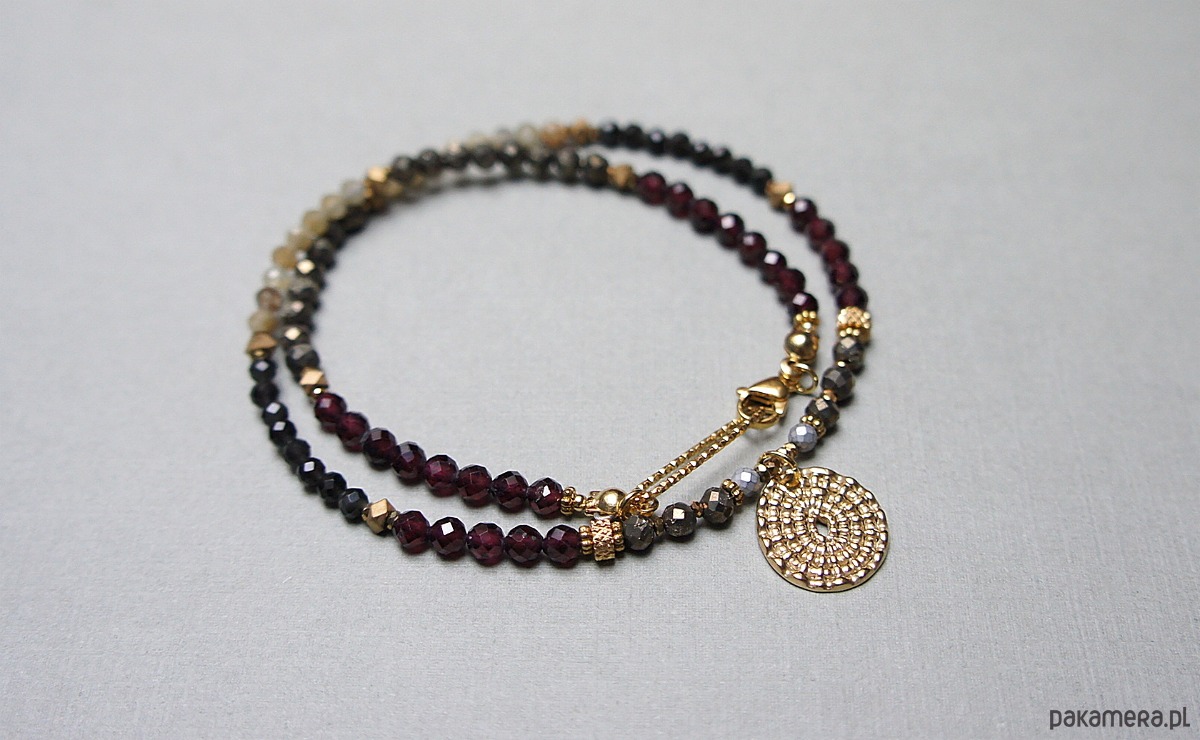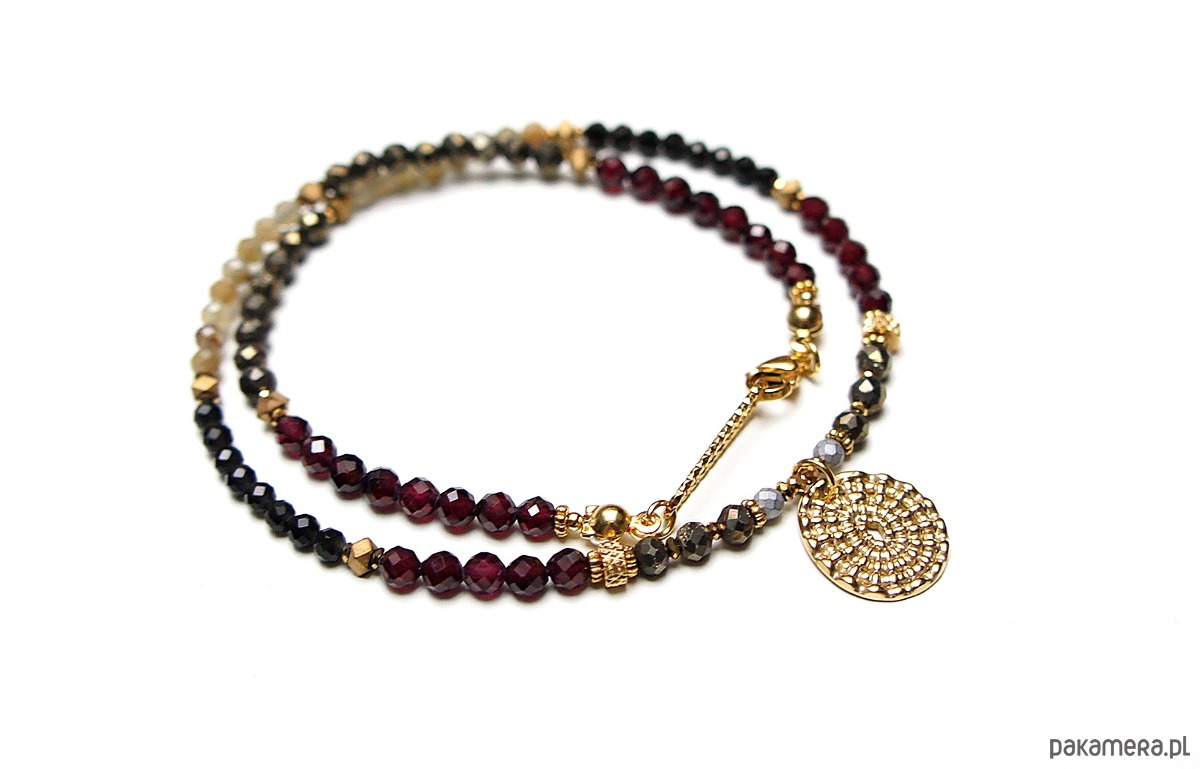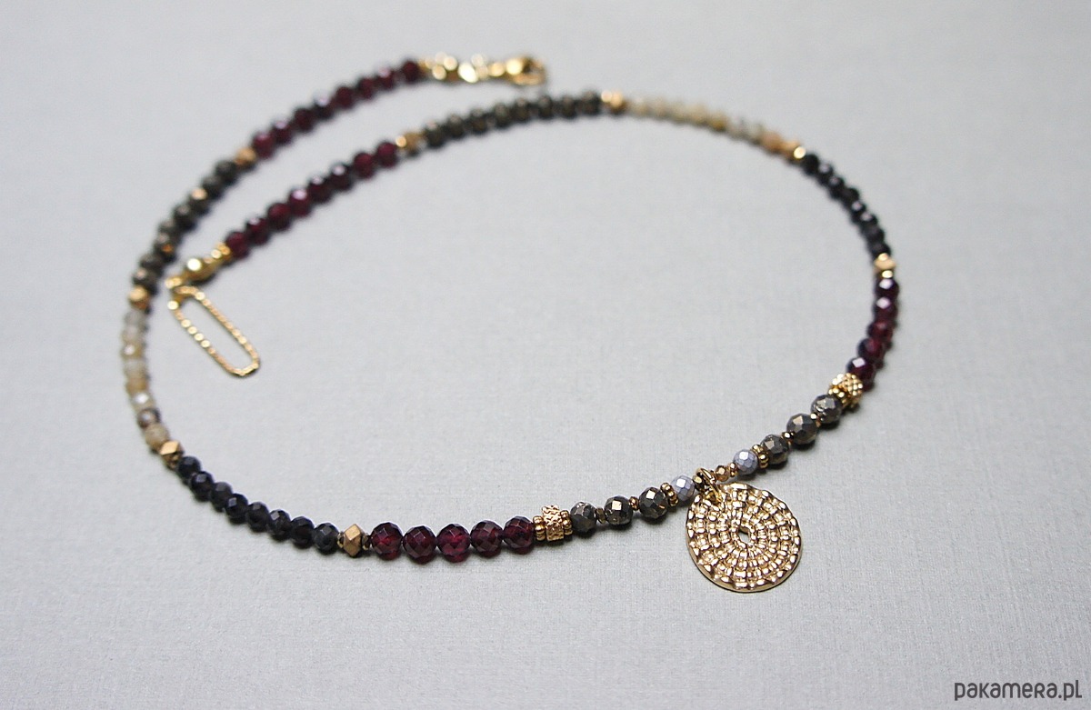 Krótki, delikatny naszyjnik wykonany w całości ze stali szlachetnej pozłacanej oraz naturalnych, szlachetnych kamieni - fasetowane granaty [4mm], kwarc fasetowany [3,5mm], piryt fasetowany [3,5mm], agaty fasetowane [3,5mm], turmalin fasetowany [3mm], hematyt fasetowany, platerowany [2,5mm], przekładek z hematytu [4 x 2mm oraz 1mm]. Naszyjnik o długości ok. 40,5cm. Biżuteria ozdobnie zapakowana.