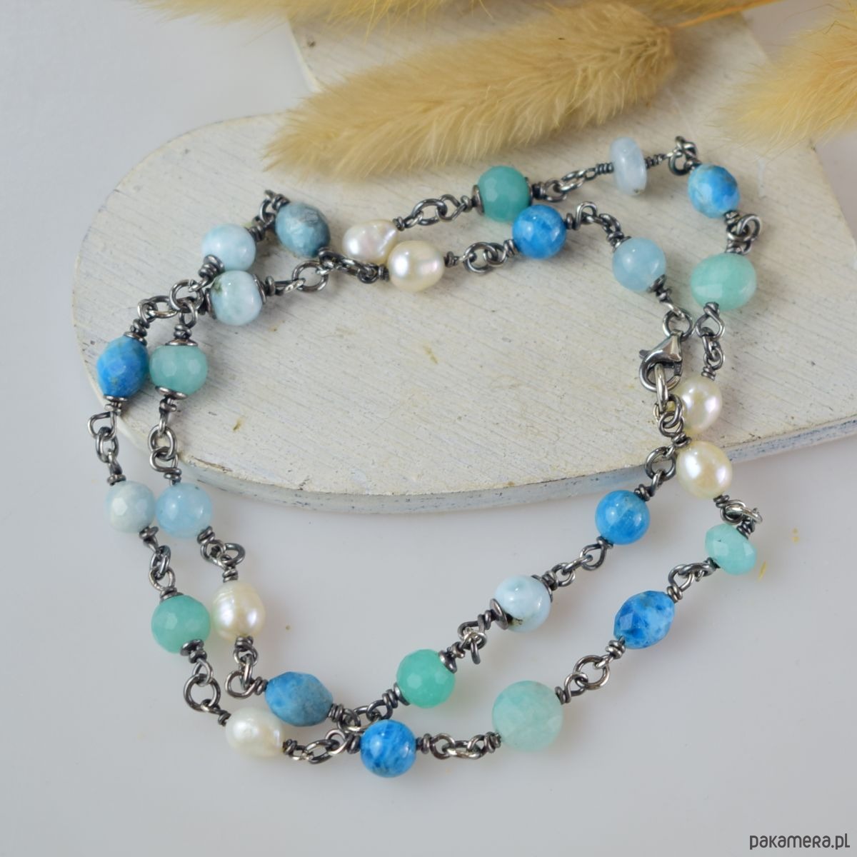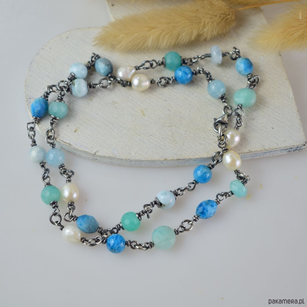 Naszyjnik wykonany w całości ze srebra (próba 925) z takimi kamieniami jak amazonit, larimar, perły, akwamaryn, apatyt . Biżuteria została zoksydowana (przyciemniona) i wypolerowana. Długość całkowita 50 cm. Biżuteria zostanie ozdobnie zapakowana.