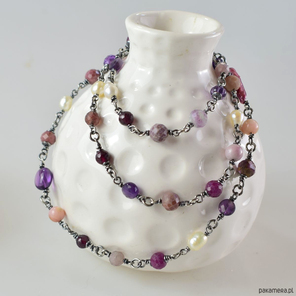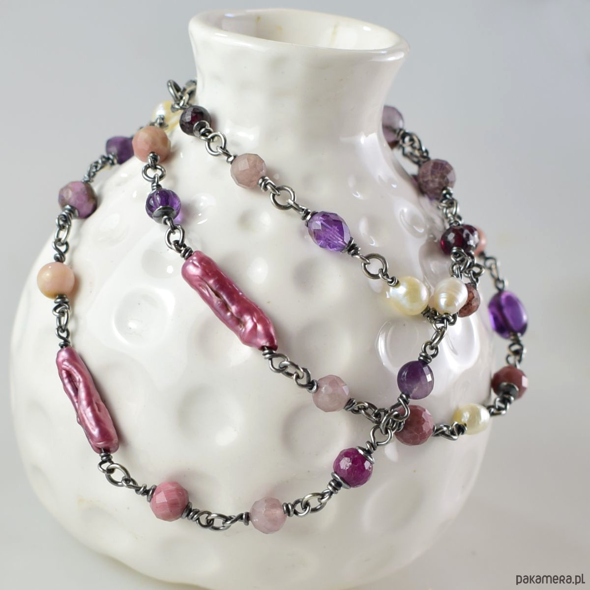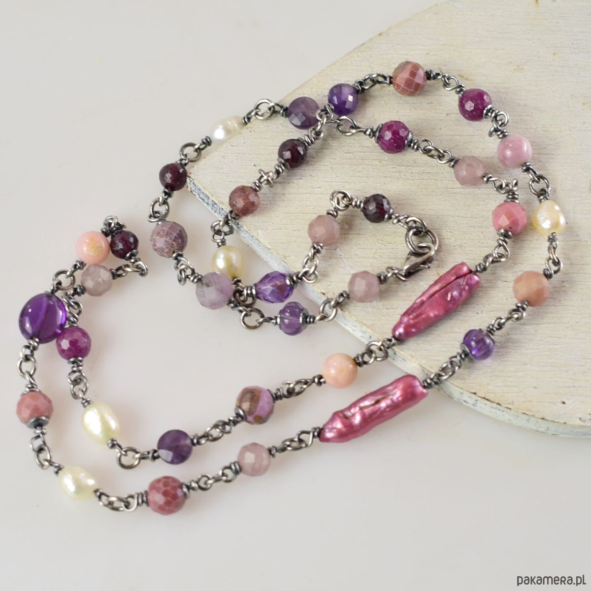 Naszyjnik wykonany w całości ze srebra (próba 925) z takimi kamieniami jak: perły, granat, rubin, rodonit, kwarc truskawkowy, ametyst, morganit, rodonit, opal różowy, fluoryt. Biżuteria została zoksydowana (przyciemniona) i wypolerowana. Długość całkowita 68 cm. Biżuteria zostanie ozdobnie zapakowana.