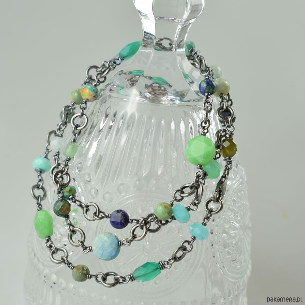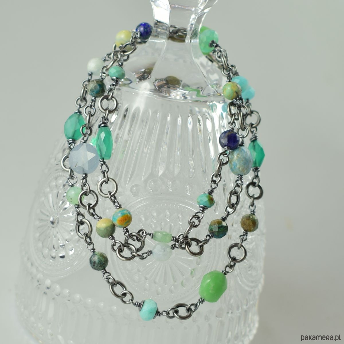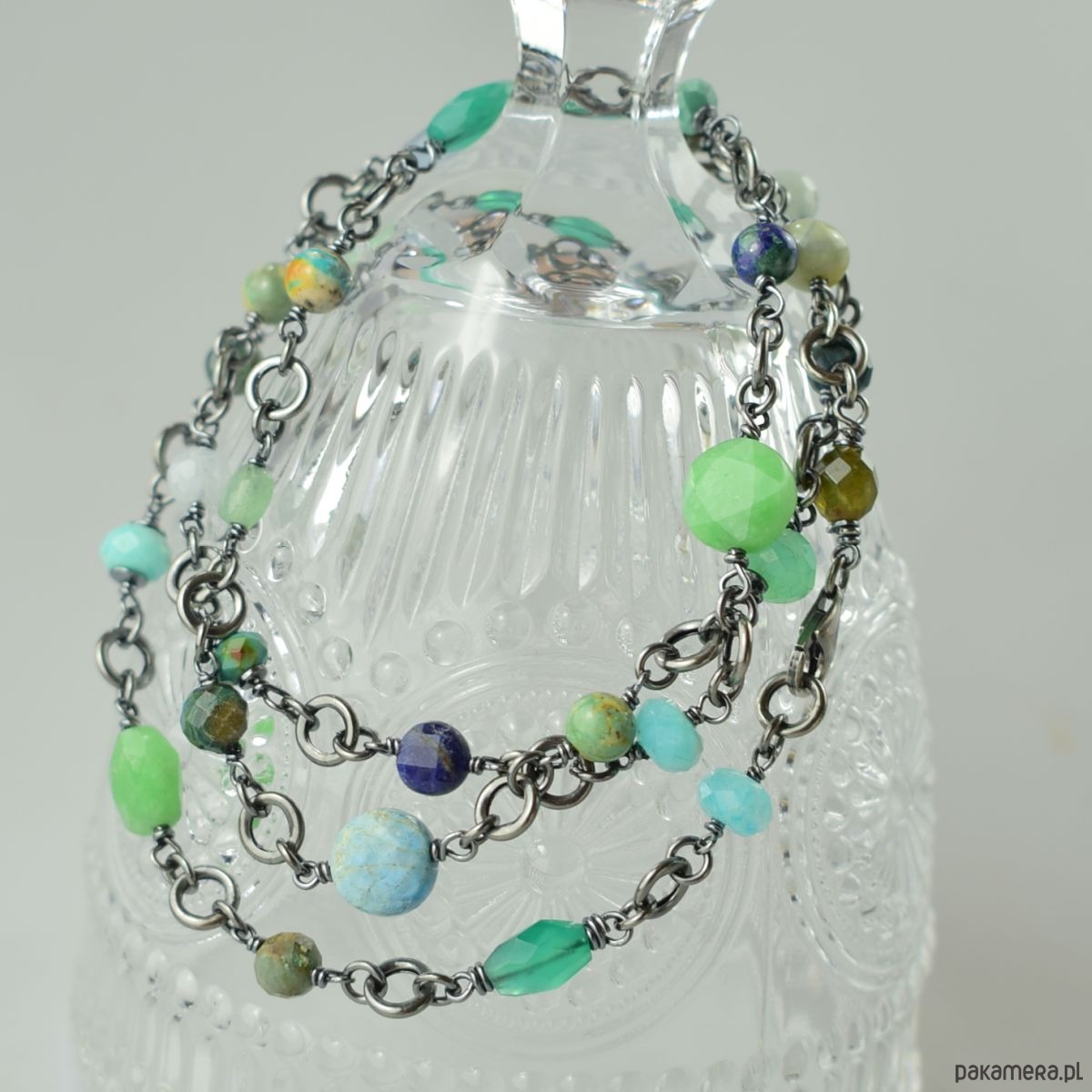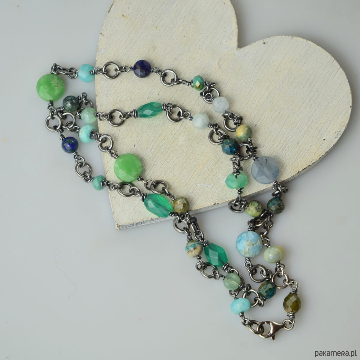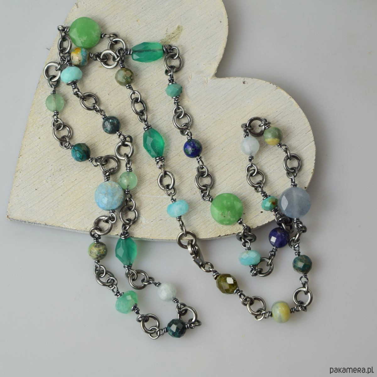 Naszyjnik wykonany w całości ze srebra (próba 925) z takimi kamieniami jak: zielony onyks, turkus, chryzokola, amazonit, akwamaryn, lapis lazuli, awenturyn, apatyt, chryzopraz. Biżuteria została zoksydowana (przyciemniona) i wypolerowana. Długość całkowita 69 cm. Biżuteria zostanie ozdobnie zapakowana.